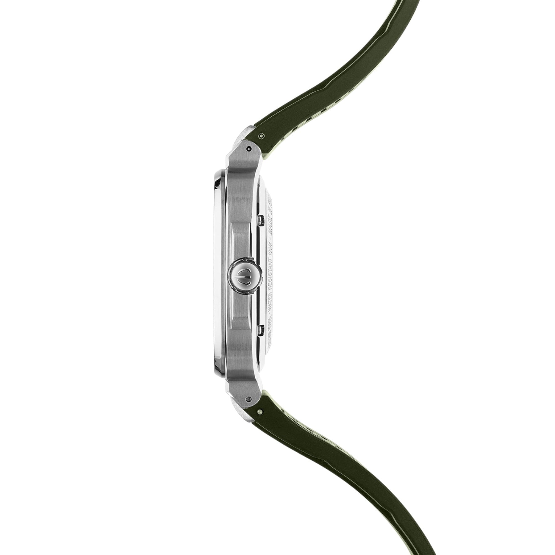 Completing the elegance and purity of this model, the 316L stainless steel bracelet comes to marry the round shape of the case for perfect suitability with your wrist. It closes with a double folding loop, also silver color.