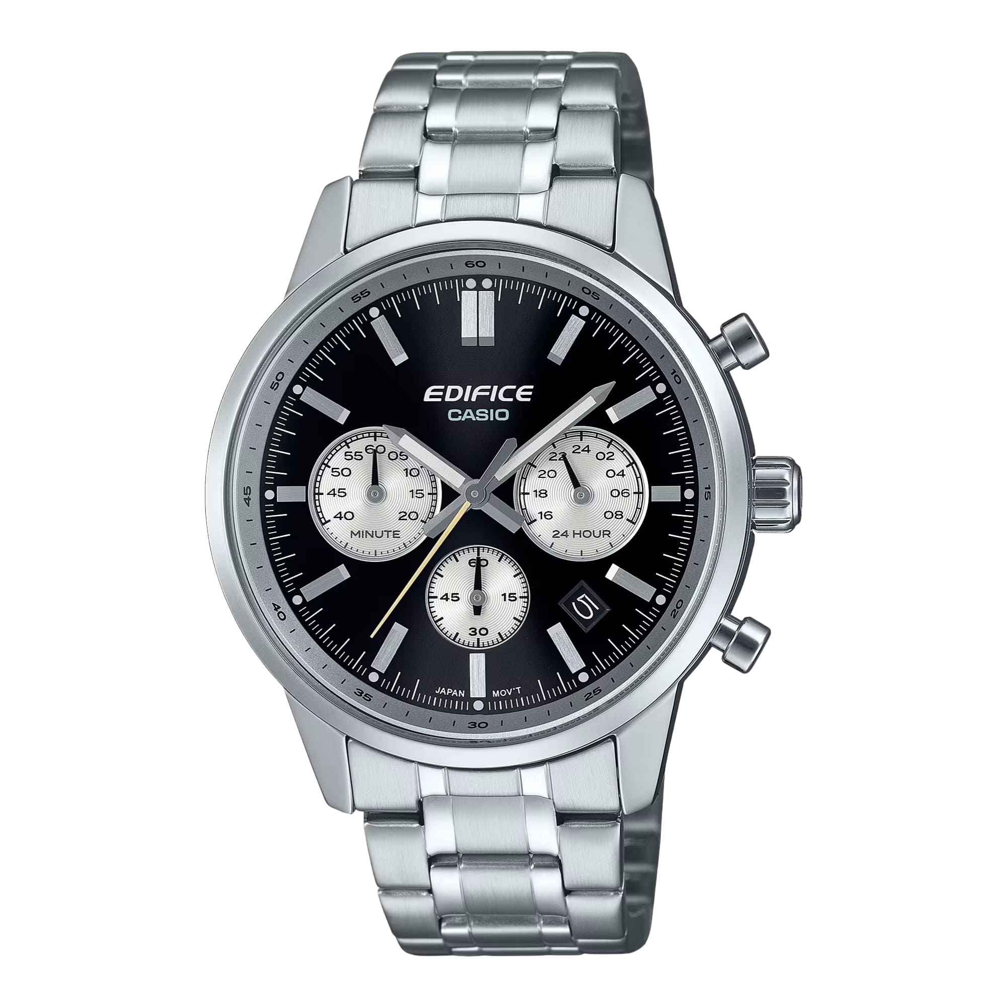 Chronographe EDIFICE : l’esprit des voitures de sport classiques au poignetCe chronographe EDIFICE pour homme puise son inspiration dans les cadrans en verre convexe des voitures de sport classiques. Un design raffiné qui rend hommage à l’univers automobile et à son esthétique emblématique. Un cadran bicolore inspiré des tableaux de bordLe cadran bicolore associe des couleurs contrastées entre le cadran principal et les sous-cadrans, rappelant l’apparence d’un tableau de bord de voiture de sport vintage. Cette combinaison apporte profondeur, lisibilité et caractère, tout en affirmant le style sportif et élégant de la montre. Chaque détail est pensé pour évoquer la précision et la performance, deux valeurs fortes de la collection EDIFICE. Des finitions premium pour un style intemporelPlusieurs éléments viennent renforcer l’identité classique et sophistiquée de cette montre homme en acier inoxydable :