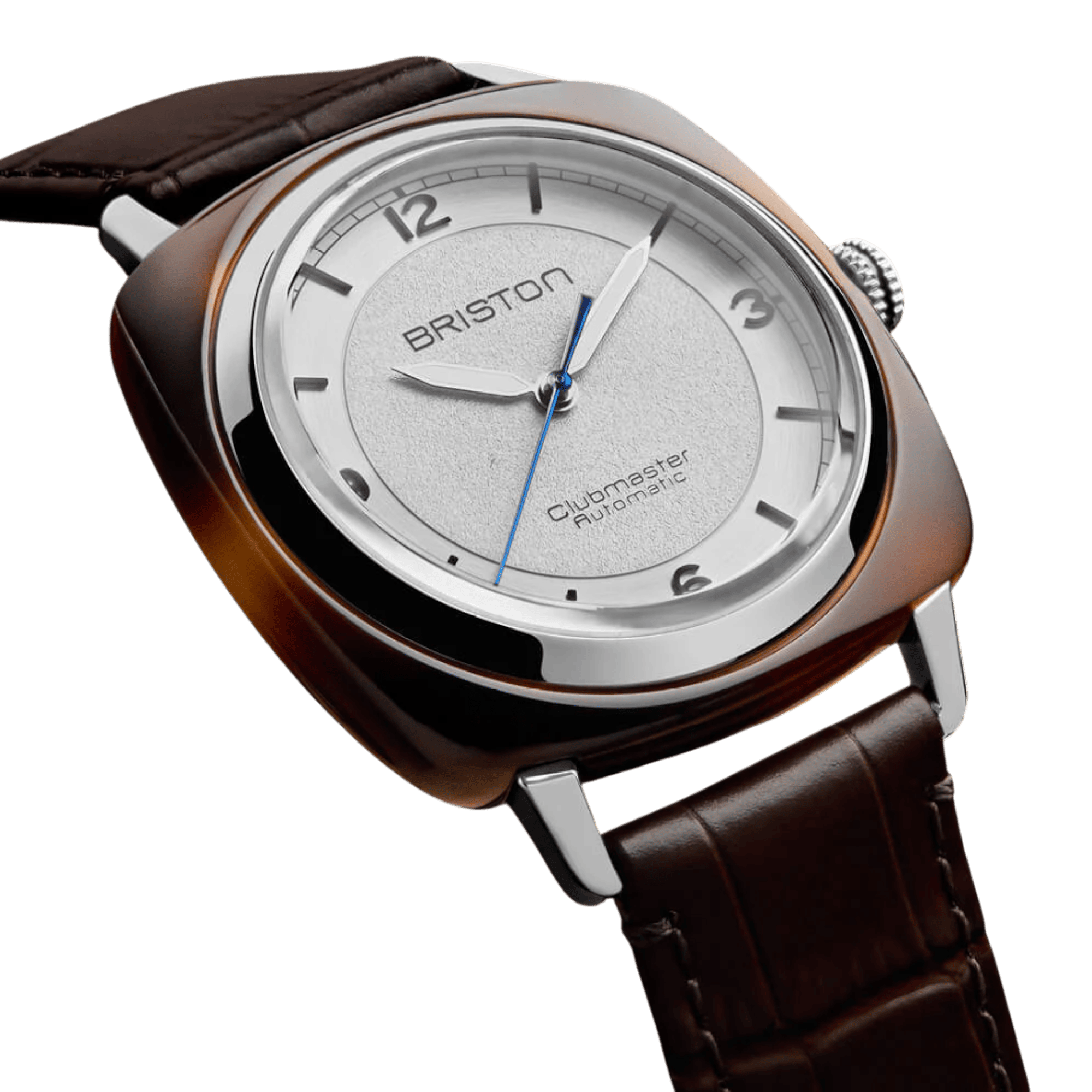 Forme "carrée cambrée" dite coussin Corps de boîte en acier inoxydable 316L et acétate écaille finition satinée ou acier inoxydable 316L entièrement poli miroir Cornes/couronne/fond vissé/boucle : acier inoxydable 316 L Couronne vissée et gravée avec blason BRISTON en acier poli et insert noir |