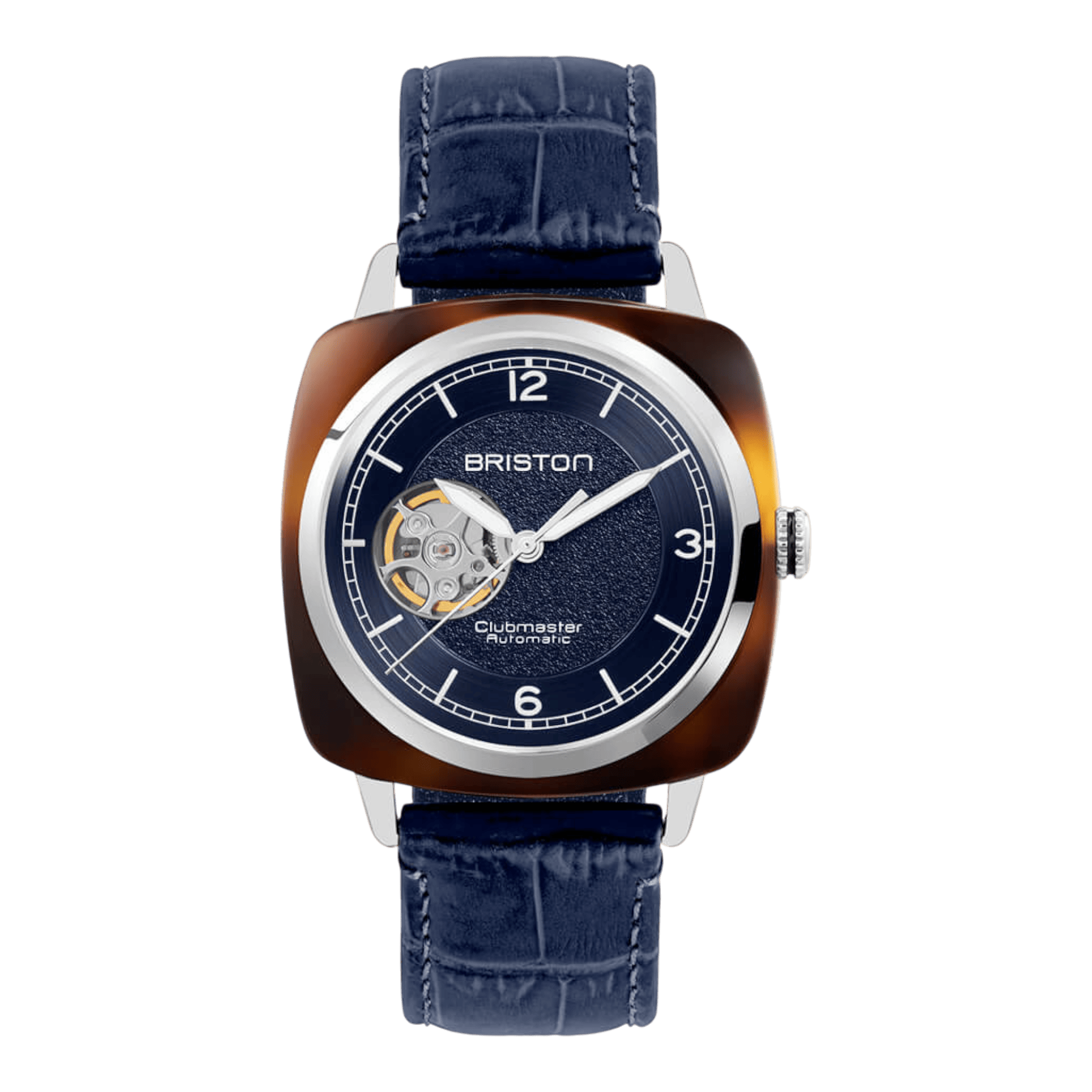 Forme "carrée cambrée" dite coussin Corps de boîte en acier inoxydable 316L et acétate écaille finition satinée ou acier inoxydable 316L entièrement poli miroir Cornes/couronne/fond vissé/boucle : acier inoxydable 316 L Couronne vissée et gravée avec blason BRISTON en acier poli et insert noir