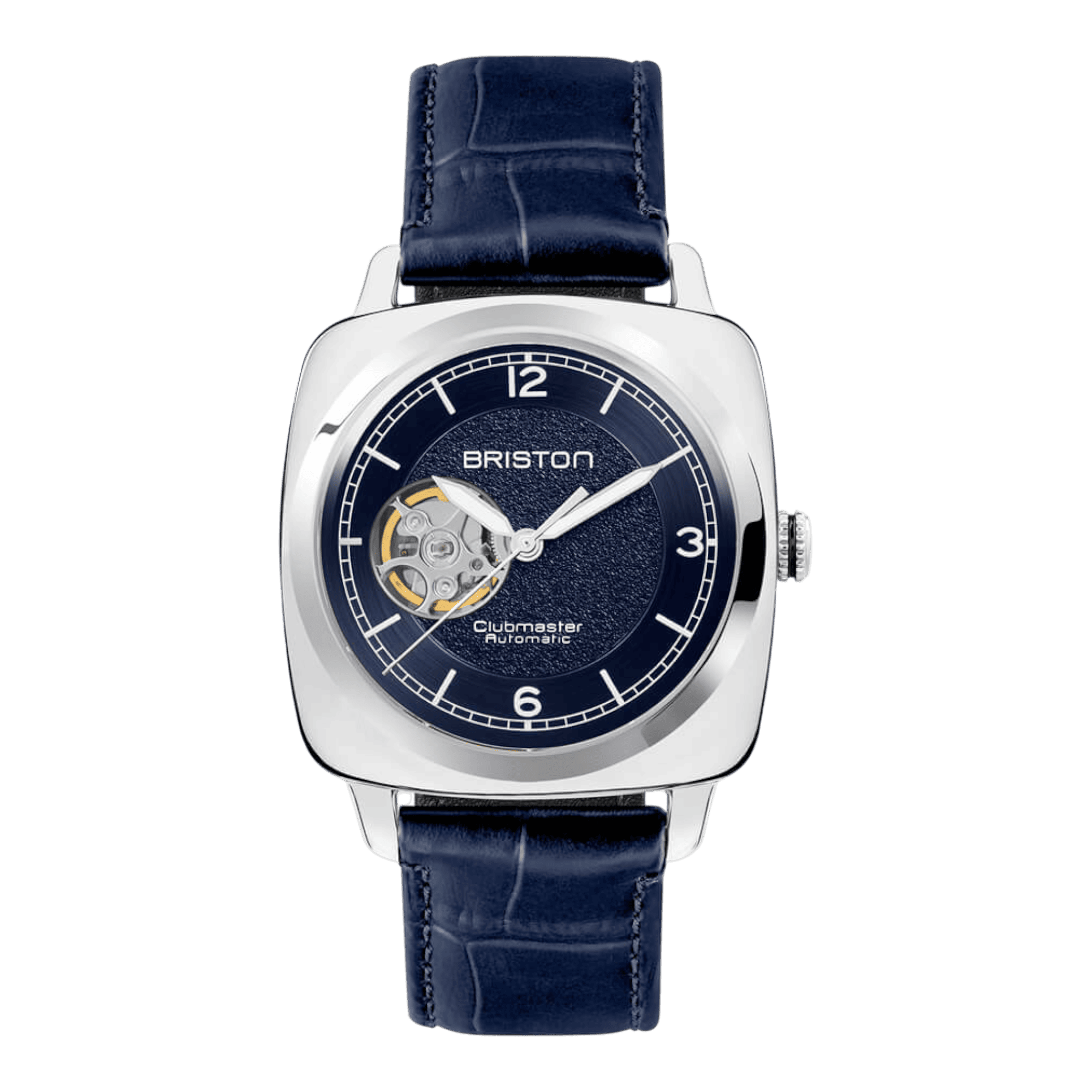 Forme "carrée cambrée" dite coussin Corps de boîte en acier inoxydable 316L et acétate écaille finition satinée ou acier inoxydable 316L entièrement poli miroir Cornes/couronne/fond vissé/boucle : acier inoxydable 316 L Couronne vissée et gravée avec blason BRISTON en acier poli et insert noir |