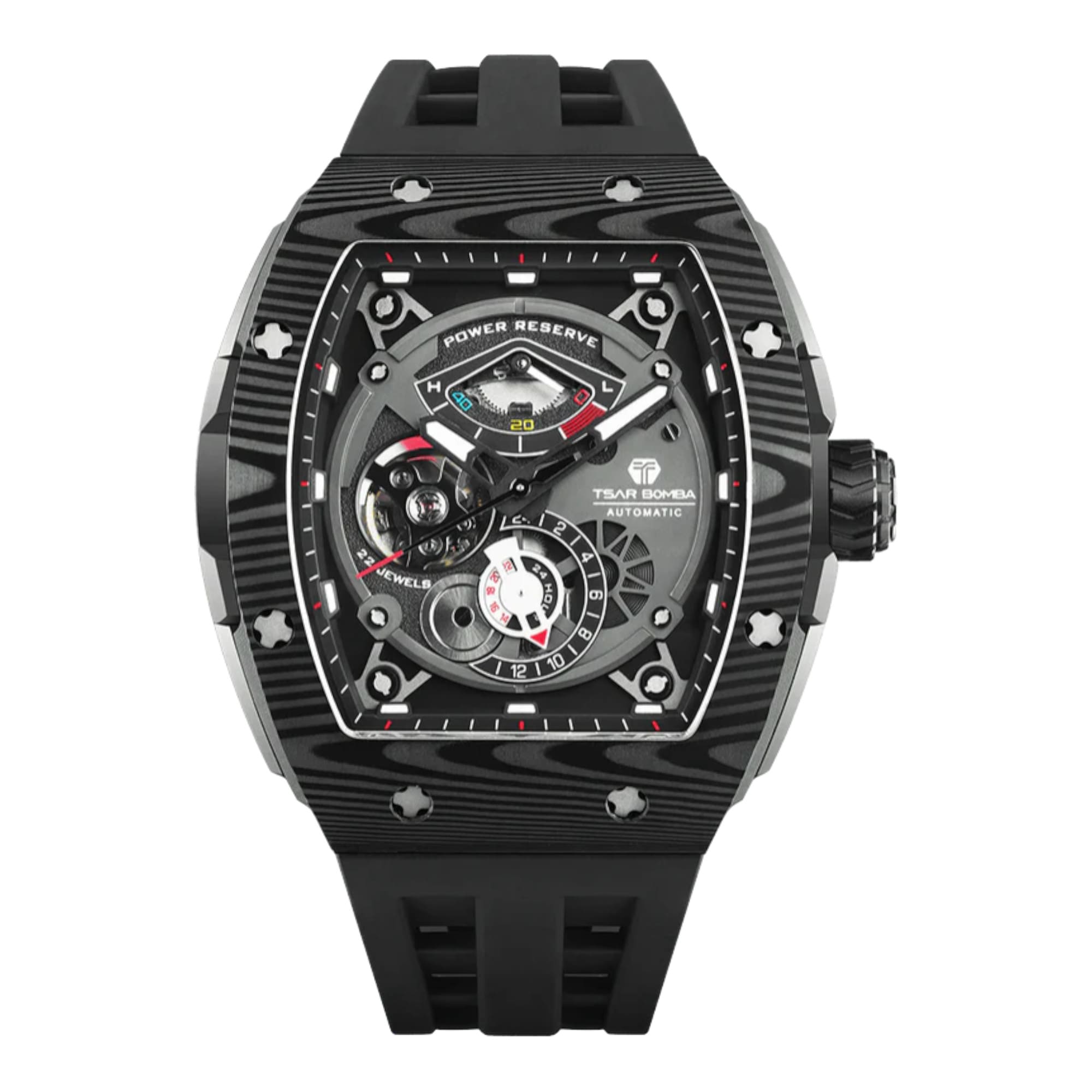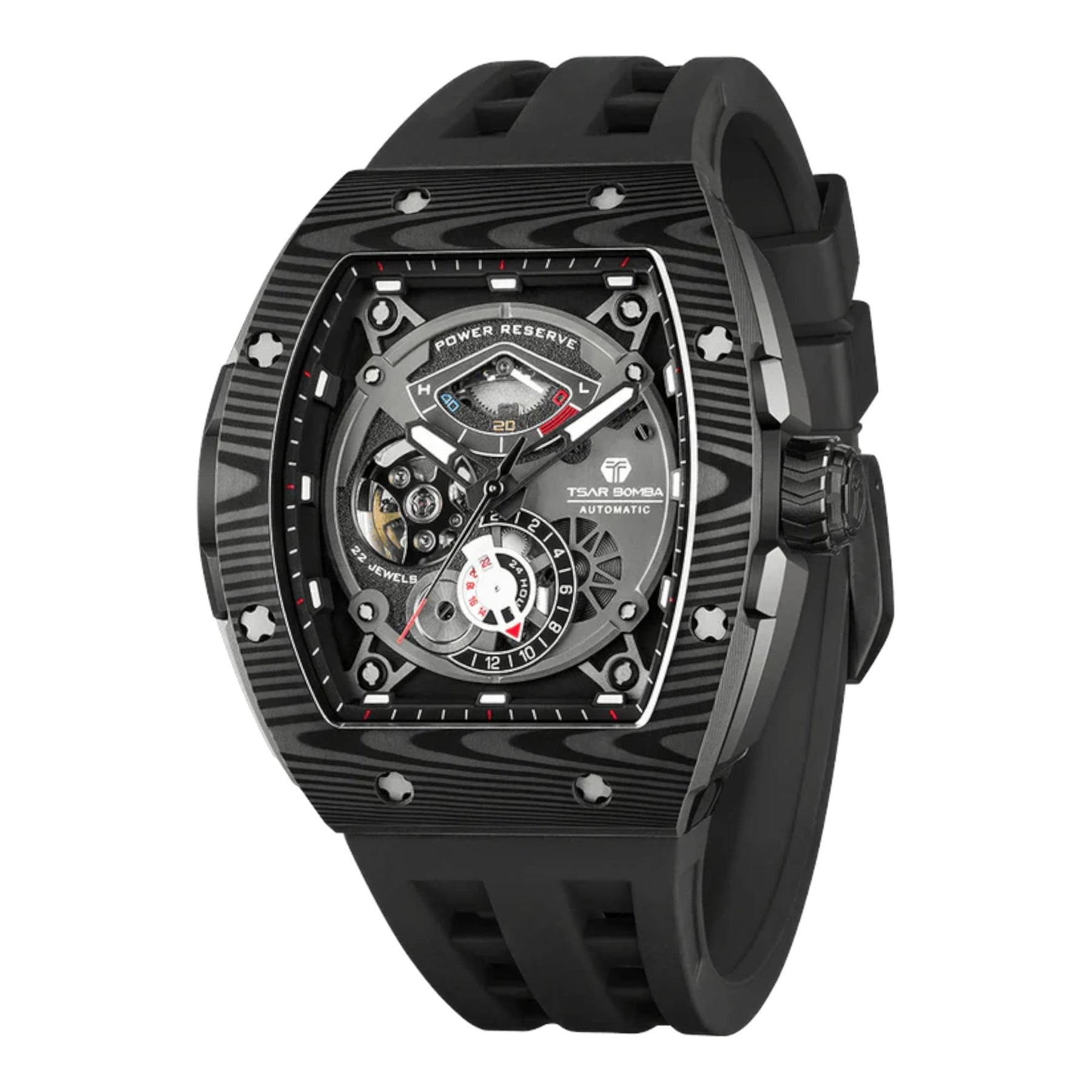TSAR BOMBA Elemental Automatique Fibre de Carbone TB8210CF – Montre Puissante et PréciseUn design audacieux, symbole de puissanceLa montre TSAR BOMBA Elemental Automatique TB8210CF incarne parfaitement l’équilibre entre puissance mécanique et design contemporain. Sa lunette en fibre de carbone au style audacieux, associée à une silhouette raffinée, confère à cette montre automatique une présence forte et masculine au poignet. Véritable déclaration de style, elle s’adresse aux amateurs d’horlogerie moderne à la recherche d’une montre à la fois technique et élégante. Réserve de marche visible pour une lecture préciseSon cadran technique et détaillé dévoile le rythme fascinant du mouvement automatique. L’indicateur de réserve de marche, subtilement intégré, permet de visualiser l’énergie restante du mouvement. Cette fonction pratique ajoute une dimension horlogère raffinée et met en valeur la précision et la sophistication de la montre. Lunette en fibre de carbone et boîtier en acier inoxydableLa lunette en fibre de carbone légère et résistante apporte une touche sportive et technologique, inspirée de l’univers de la performance. Elle est associée à un boîtier en acier inoxydable robuste, garantissant solidité, résistance à l’usure et durabilité. Cette combinaison de matériaux offre une alliance parfaite entre innovation, performance et élégance intemporelle. Bracelet en fluoroélastomère à libération rapideLa TB8210CF est équipée d’un bracelet en fluoroélastomère haute qualité avec système quick-release, permettant de changer facilement de bracelet selon vos envies. Souple, résistant et confortable, il épouse parfaitement le poignet et assure un port agréable tout au long de la journée. Ce bracelet technique renforce le caractère sport-chic et polyvalent de la montre. |