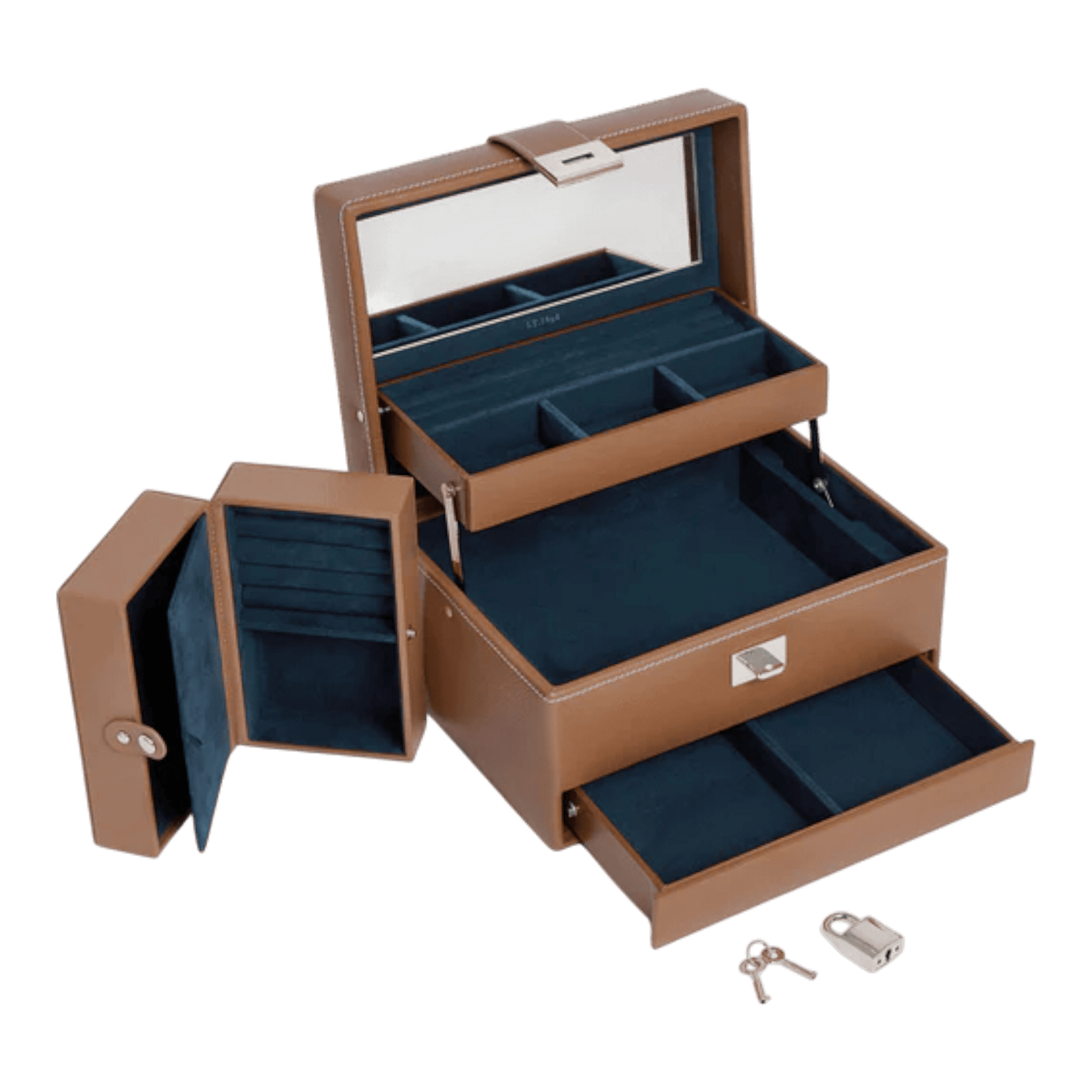 Son couvercle à ouverture automatique active l’ensemble du mécanisme d’ouverture, révélant un intérieur en velours crépuscule d’une douceur incomparable. Chaque bijou y trouve sa place grâce à des compartiments amovibles intelligemment agencés et un miroir intégré qui facilite l’essayage et le rangement au quotidien.