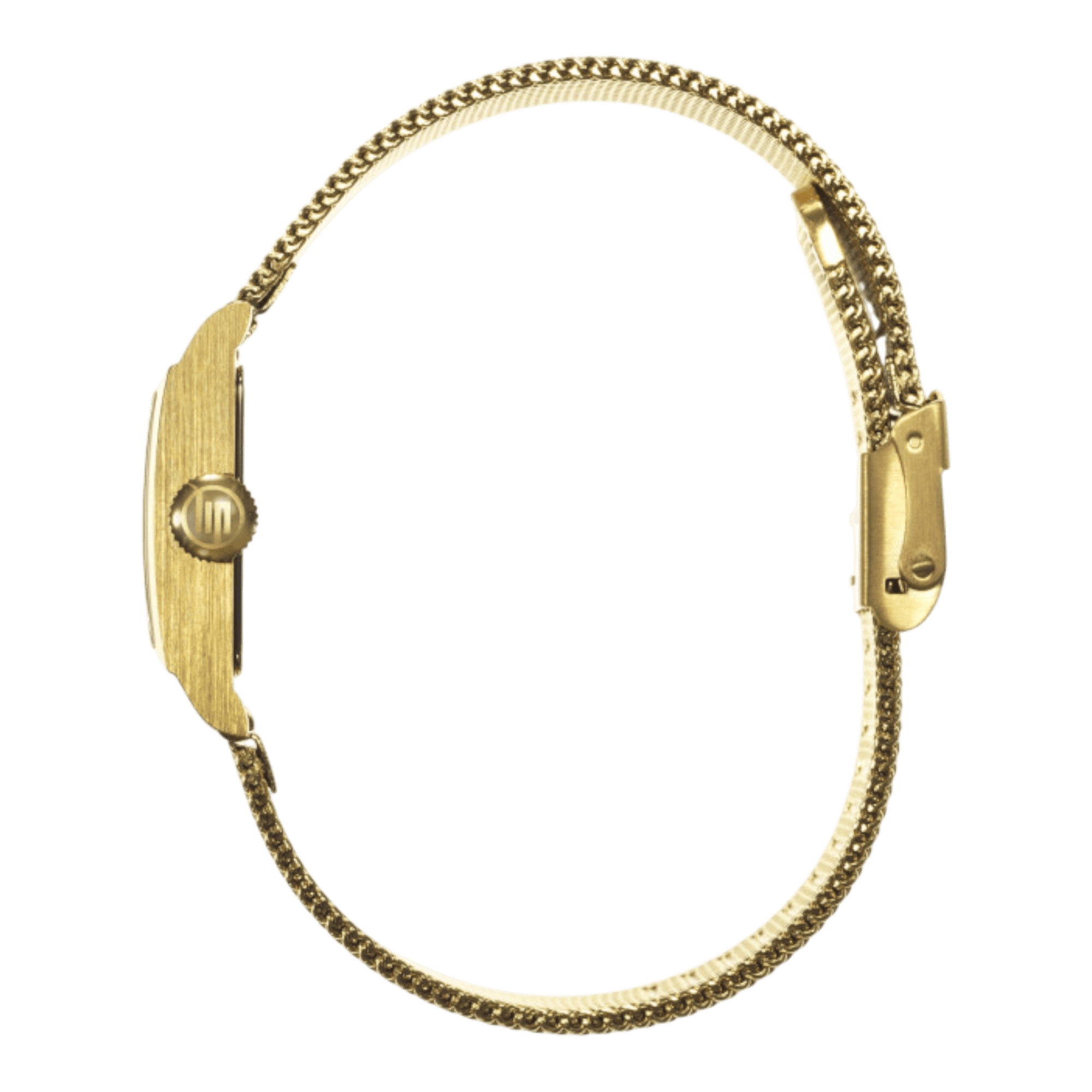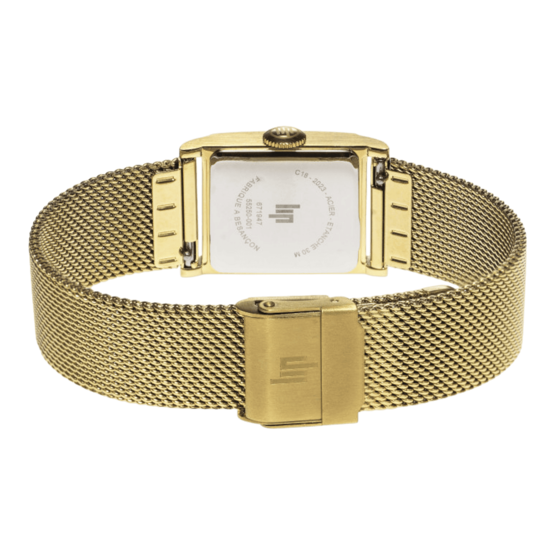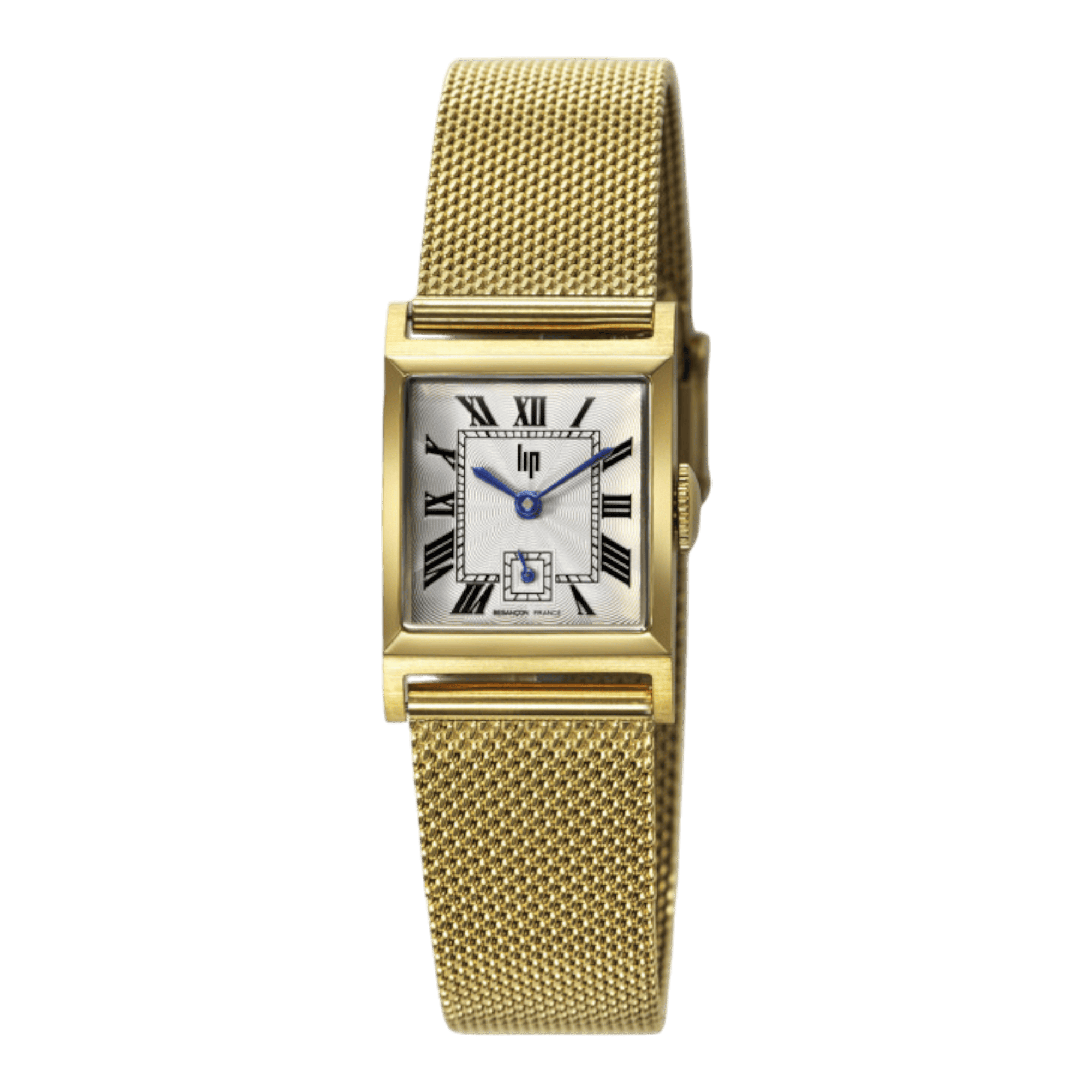 LIP Churchill C18 – Raffinement doré à la françaiseFabriquée en France – Besançon La LIP Churchill C18 séduit par son design carré de 21 x 21 mm en acier inoxydable 316L poli et brossé, symbole d’un équilibre parfait entre élégance et modernité. Cette version se distingue par son bracelet en maille milanaise dorée, confortable et facilement ajustable grâce à un fermoir glissant type charriot. |