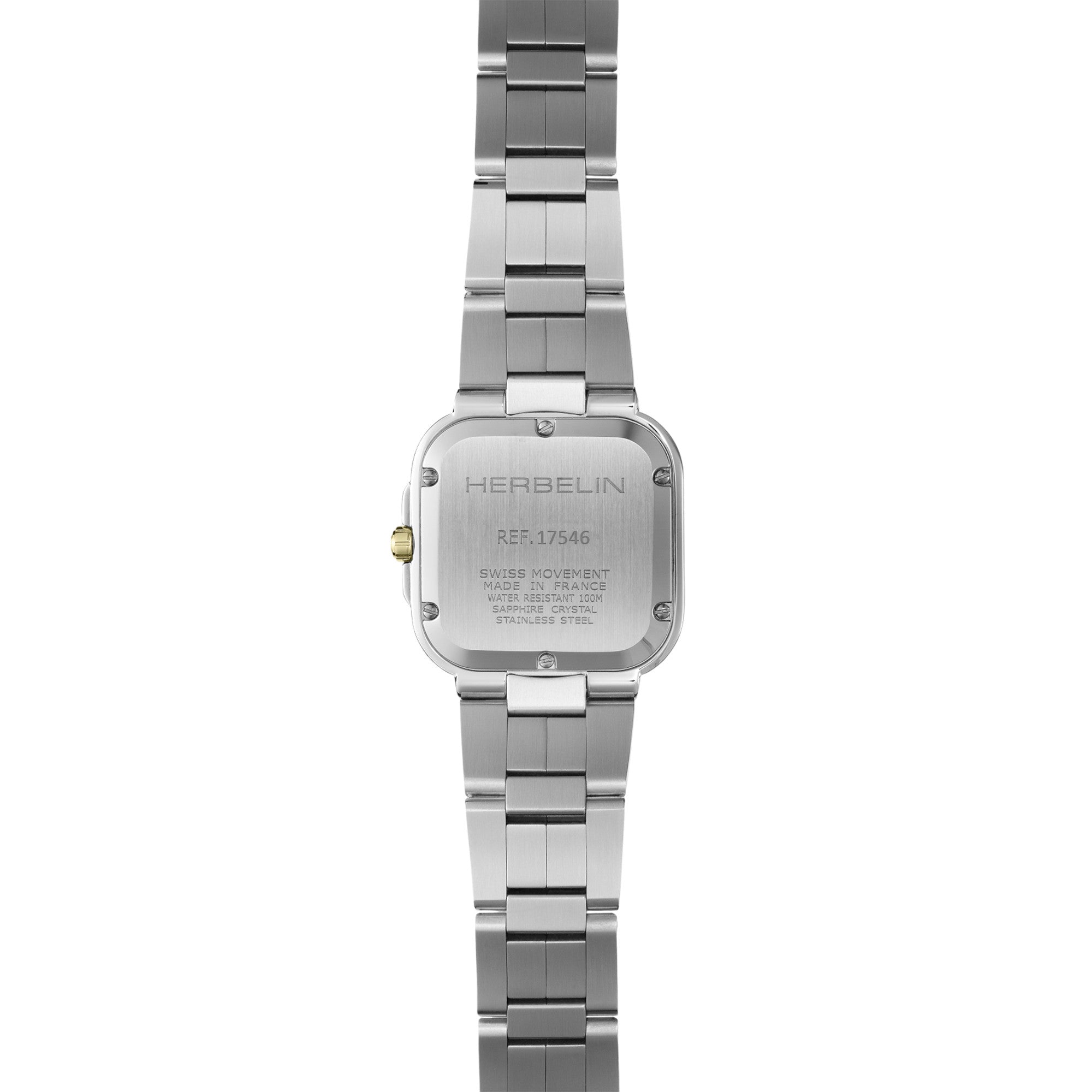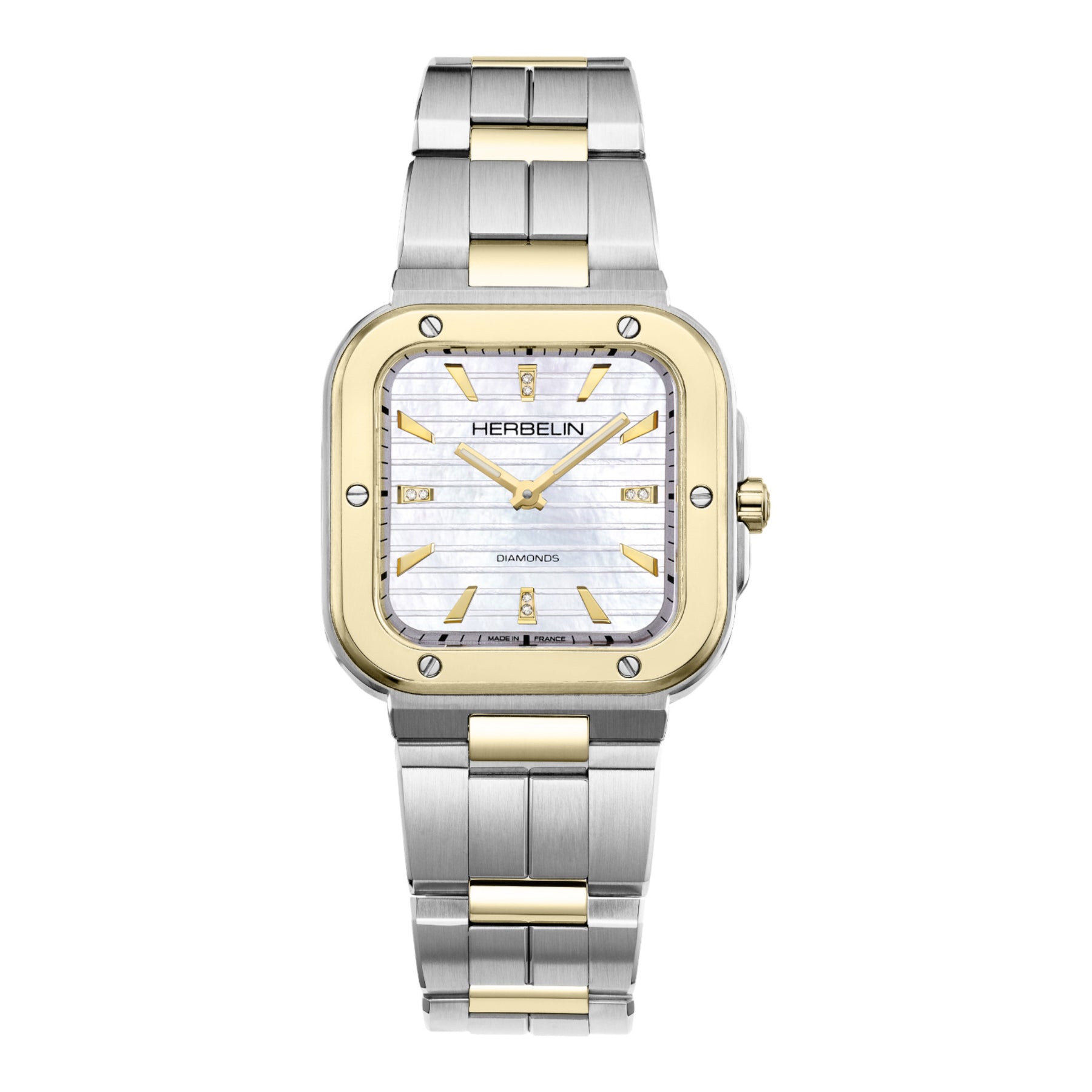 Herbelin Cap Camarat Square Dame – Acier Bicolore, Nacre & Diamants : l’élégance précieuse au quotidienLa Herbelin Cap Camarat Square Dame Acier & Or Bicolore incarne une vision contemporaine de la féminité, mêlant lumière, finesse et sophistication. Son boîtier carré ultra-élégant en acier inoxydable 316L, rehaussé d’une lunette en PVD or jaune, met en valeur un superbe cadran en nacre naturelle, délicatement habillé de véritables diamants sertis aux index. D’une finesse remarquable de 6,9 mm, cette montre séduit par son confort et sa silhouette bijou. Protégée par un verre saphir inrayable et dotée d’une étanchéité de 100 mètres, elle allie robustesse et raffinement. En son cœur bat un mouvement quartz suisse Ronda 751, reconnu pour sa précision et sa fiabilité. Son bracelet en acier bicolore, associé à une boucle déployante, renforce son allure moderne et chic. Une montre pensée comme un véritable bijou horloger, parfaite pour accompagner les tenues du quotidien comme les moments plus habillés. Cap Camarat Square Dame : l’âme bijou de la Maison HerbelinSymbole du savoir-faire horloger français, cette Cap Camarat Bicolore Nacre & Diamants conjugue modernité, éclat précieux et finesse. Une montre lumineuse et intemporelle, conçue pour sublimer le poignet féminin avec élégance. |