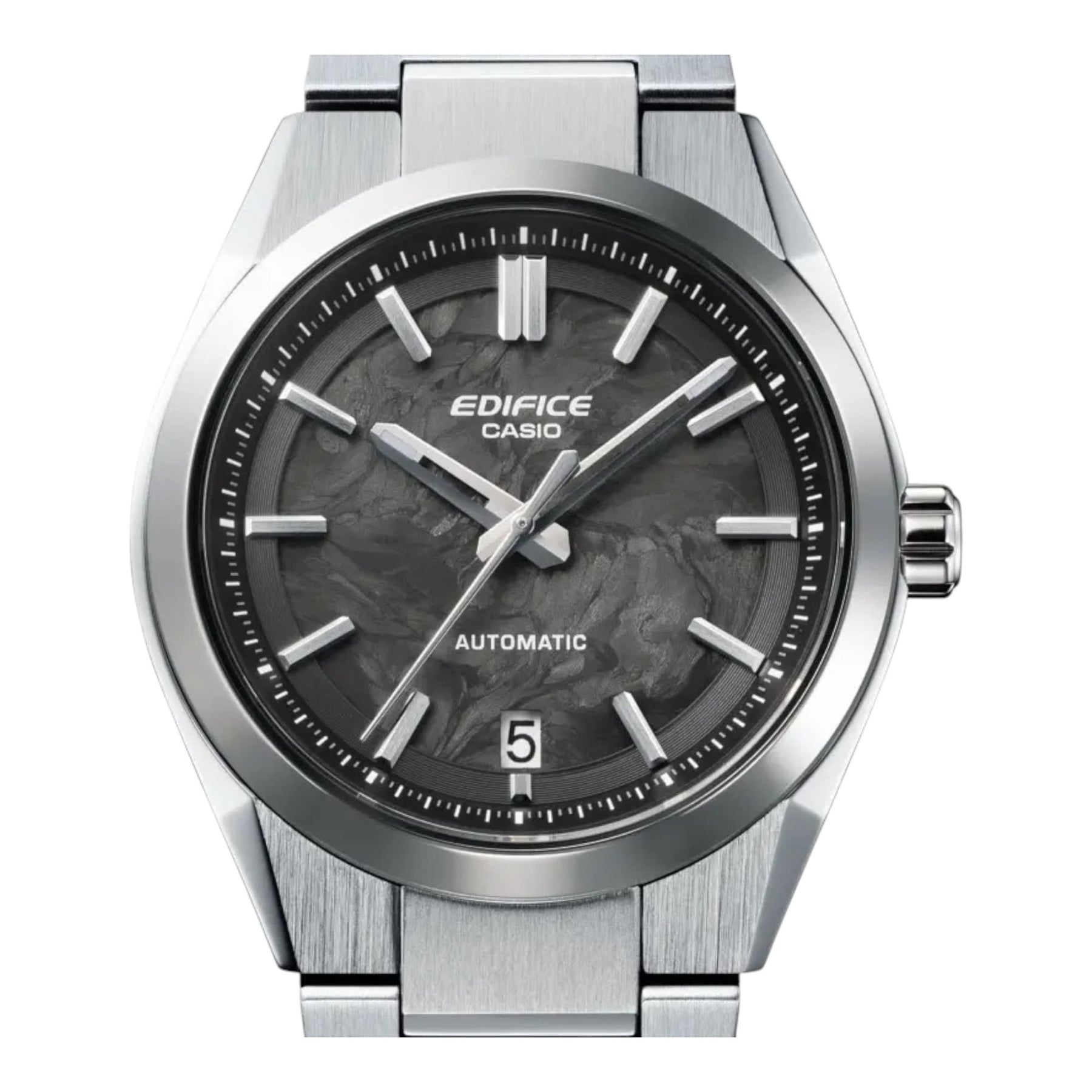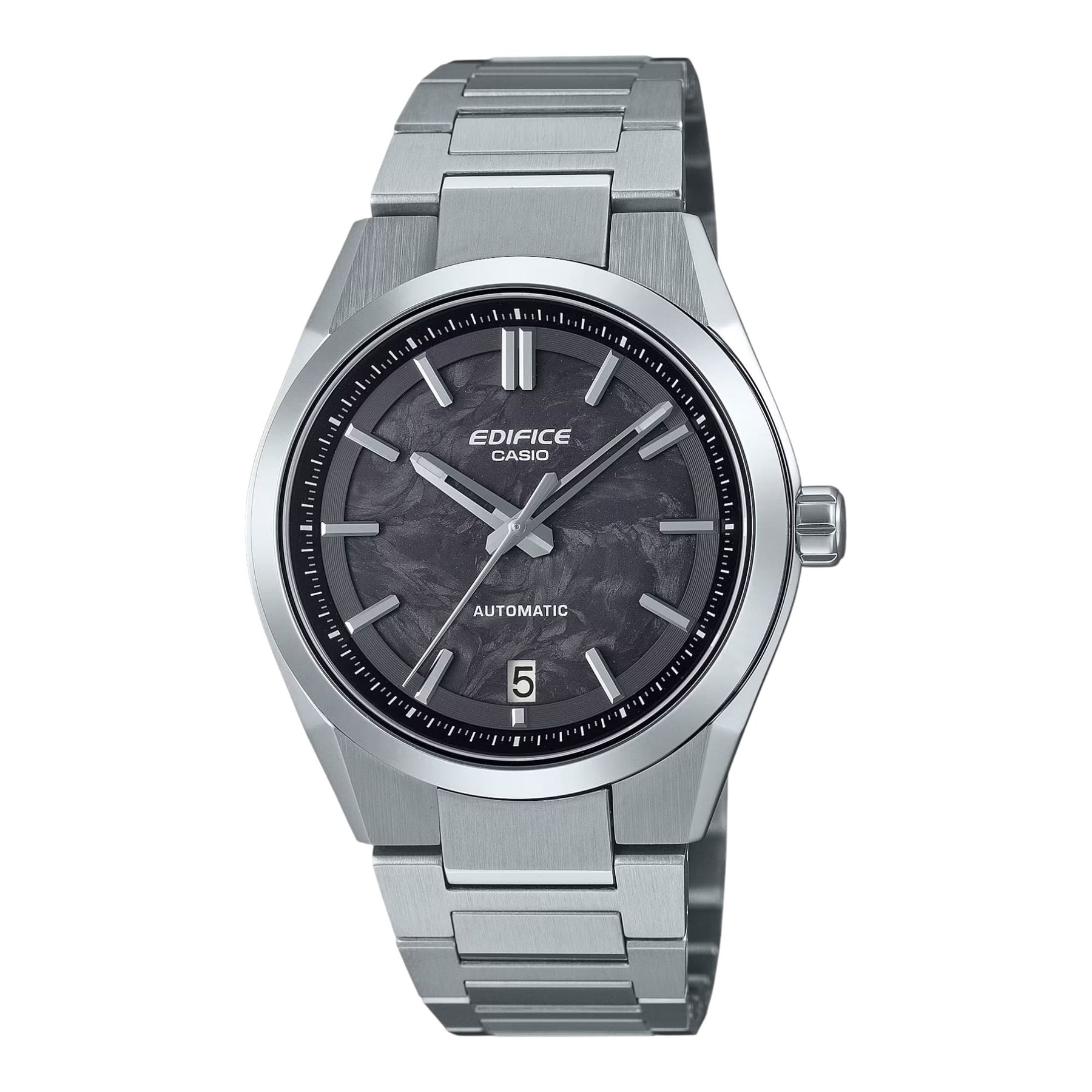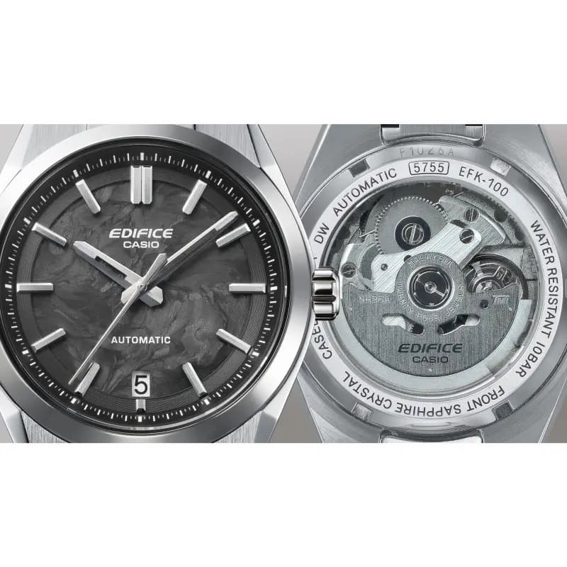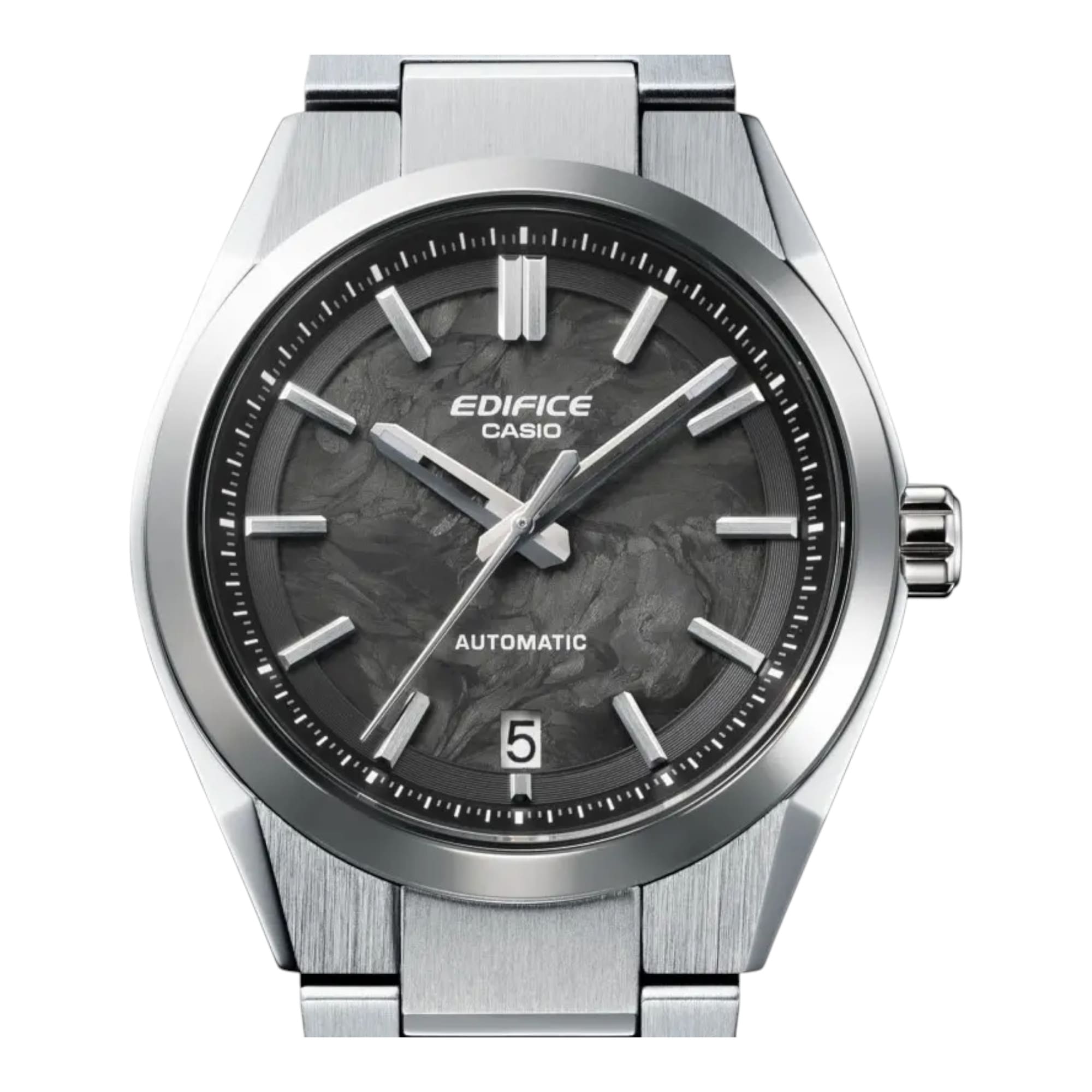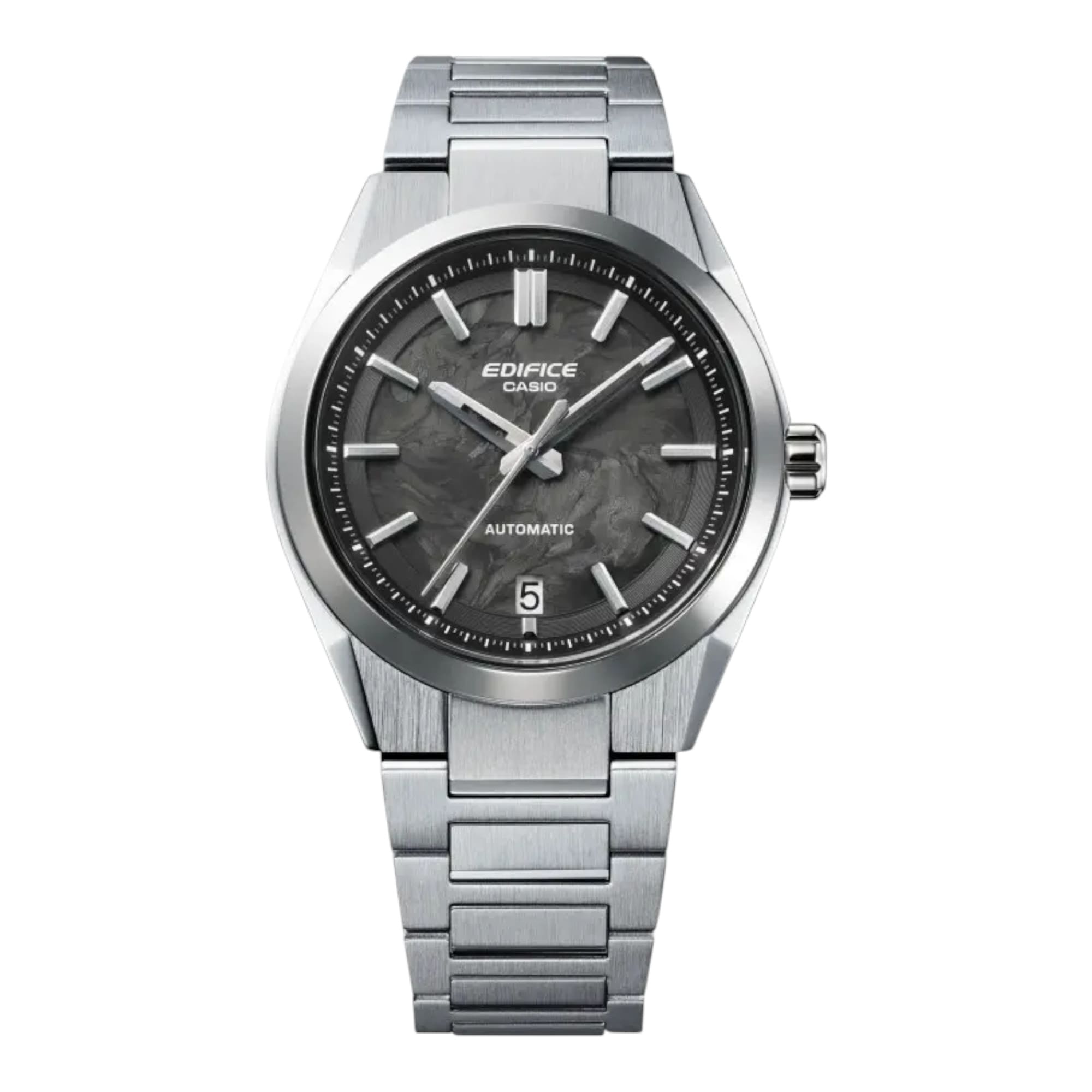 Casio Edifice EFK-100CD – L’alliance du carbone forgé et de la mécanique haut de gammeUne innovation majeure dans l’univers EDIFICELa Casio Edifice EFK-100CD marque une première historique pour la collection : l’intégration d’un cadran en carbone forgé, matériau d’exception emprunté à l’industrie automobile de luxe et à l’aéronautique. Inspirée par l’univers des voitures de sport haute performance, cette montre combine esthétique sophistiquée et fonctionnalité avancée, dans un style racé typiquement EDIFICE. Carbone forgé – Performance et raffinementIssu des technologies de pointe, le carbone forgé est obtenu en pétrissant de la fibre de carbone dans une résine, puis en la pressant à haute température sous forte pression. Résultat : un matériau ultra-léger, extrêmement rigide et orné de motifs marbrés uniques. Ces caractéristiques confèrent à la EFK-100CD une allure sportive et exclusive, tout en renforçant sa robustesse. Premier mouvement mécanique EDIFICEPour la première fois, une EDIFICE est animée par un mouvement mécanique (calibre 5755), doté d’un remontage automatique et manuel. Ce mécanisme offre :