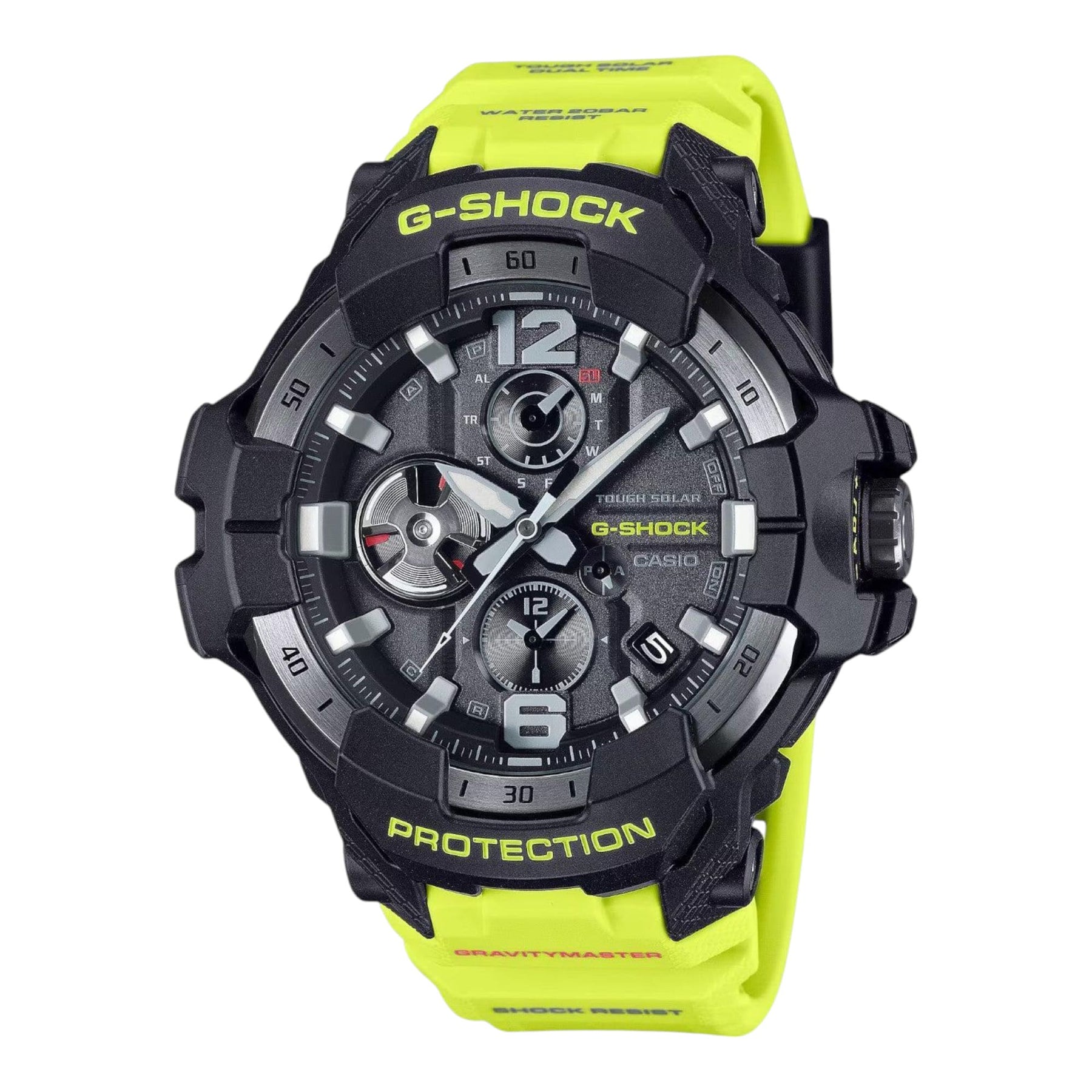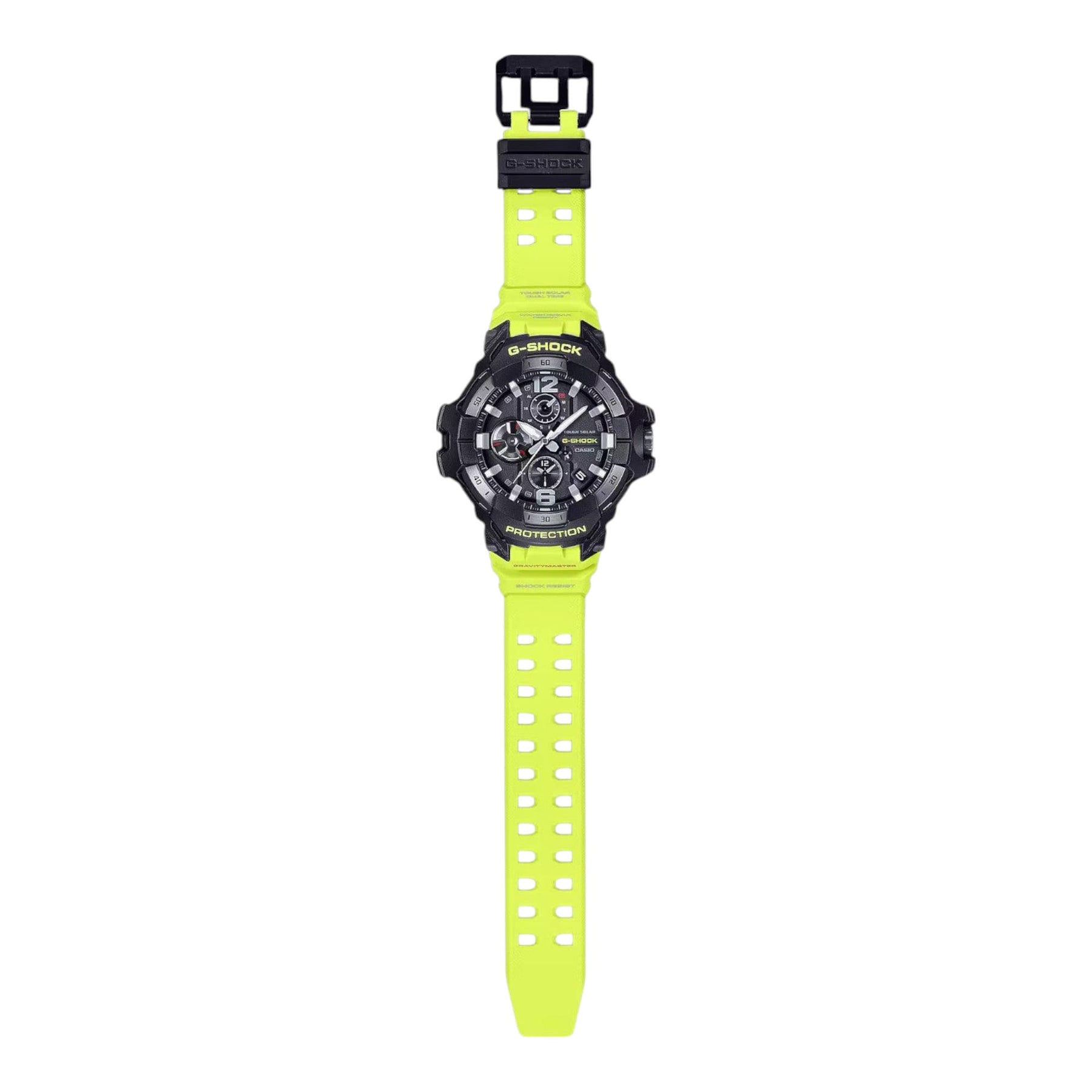 Casio G-SHOCK GRAVITYMASTER GR-B300RY – L’aéronautique en mission extrêmePrécision aérienne, résistance ultime.Inspirée par les exigences du pilotage professionnel, la G-SHOCK GR-B300RY GRAVITYMASTER incarne l’union parfaite entre design fonctionnel, lisibilité renforcée, et technologie avancée. Pensée pour les environnements les plus exigeants, elle se dote d’un style audacieux et impactant, sublimé par des accents jaune de sauvetage à haute visibilité. Un style percutant et professionnelLe jaune de sauvetage, utilisé par les équipes de secours pour sa visibilité inégalée, vient souligner les lignes de cette montre technique. Il contraste puissamment avec la structure noire et grise IP, accentuant le caractère robuste et tactique de ce garde-temps. Le bracelet et le sommet de la lunette adoptent cette teinte pour un rendu visuel fort, immédiatement reconnaissable – même dans les conditions les plus extrêmes. Une conception pensée pour l’aérienLa GR-B300RY a été conçue pour répondre aux besoins spécifiques des pilotes et professionnels de l’aviation : Matériaux écoresponsables et robustesse techniqueEngagée dans une démarche écoresponsable, Casio équipe cette montre de composants en résine bio, dérivés de ressources renouvelables, pour réduire son empreinte environnementale. Son étanchéité à 200 mètres, sa résistance aux chocs, et son Super Illuminator LED garantissent une performance optimale dans toutes les situations. Pourquoi on l’adopte ?Parce qu’elle incarne l’excellence technique au service de l’action. Parfaite pour les professionnels du ciel comme pour les amateurs d’équipements tactiques, la GR-B300RY est une montre de pilote moderne, puissante, lisible et visuellement marquante. Un instrument de précision qui se porte comme un symbole de performance. |