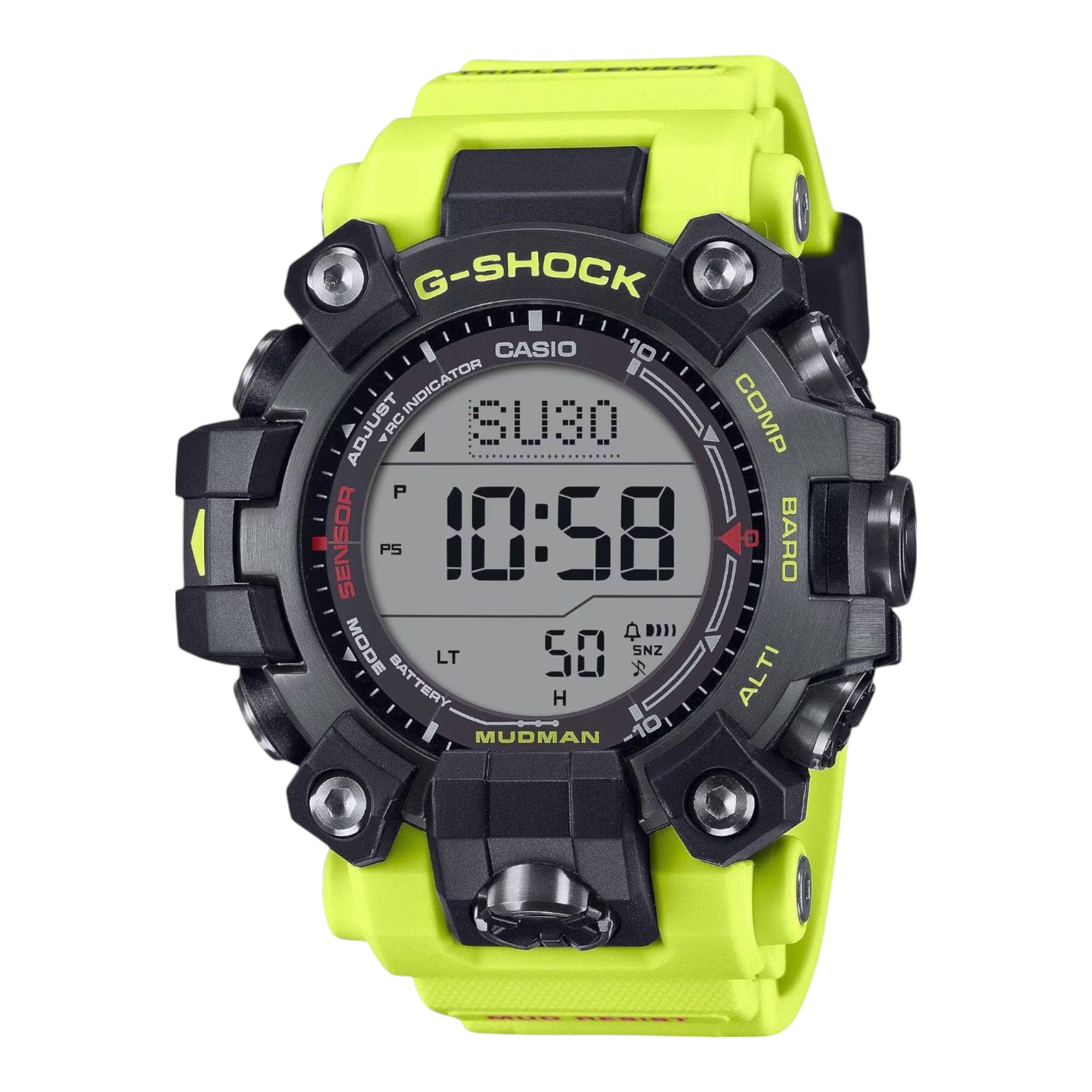 Casio G-SHOCK MUDMAN GW-9500MRY – L’outil ultime des conditions extrêmesPerformance tactique, visibilité maximale.Conçue pour affronter les terrains les plus hostiles, la G-SHOCK MUDMAN GW-9500MRY s’impose comme une montre professionnelle de haut niveau, pensée pour les environnements extrêmes. Dotée d’un design percutant mêlant noir IP, gris métal et accents jaune de sauvetage, elle allie fonctionnalité avancée, lisibilité optimale et résistance absolue. Design inspiré du monde du secoursLa couleur jaune de sauvetage, utilisée sur les équipements de premiers secours et les véhicules d’urgence, s’impose ici comme un choix stratégique : visibilité maximale, même en cas de faible luminosité, brouillard ou conditions météorologiques sévères. Elle habille subtilement des éléments clés comme le bracelet et le haut de la lunette, pour une esthétique forte et facilement repérable. Le contraste saisissant avec le boîtier noir IP et les éléments métalliques gris renforce l’impact visuel de ce modèle tout en soulignant sa robustesse technique. Triple capteur & affichage LCD duplex : une technologie de terrainÉquipée d’un triple capteur (boussole, altimètre/baromètre, thermomètre), la MUDMAN GW-9500MRY offre des données cruciales pour les professionnels de l’outdoor, les secouristes et les aventuriers. Son affichage LCD duplex améliore nettement la lisibilité des informations, notamment lors de l'utilisation de la boussole numérique, rendant les données plus accessibles d’un seul coup d’œil. Conception ultra-résistante