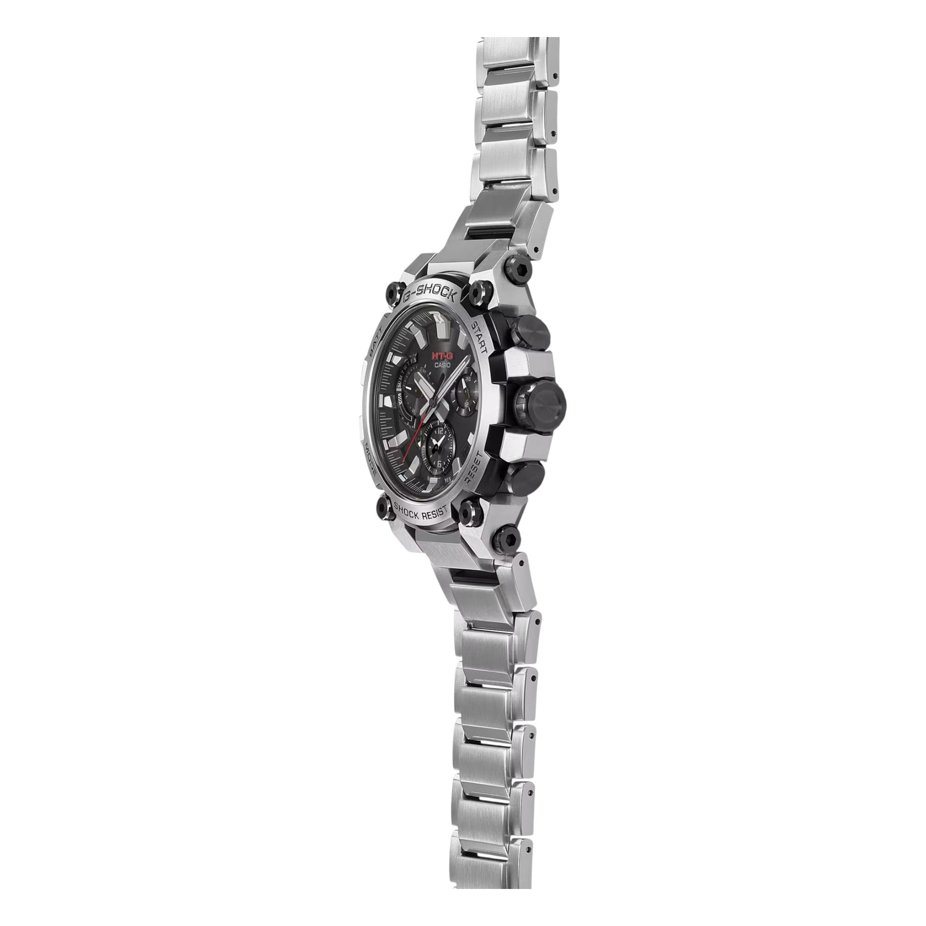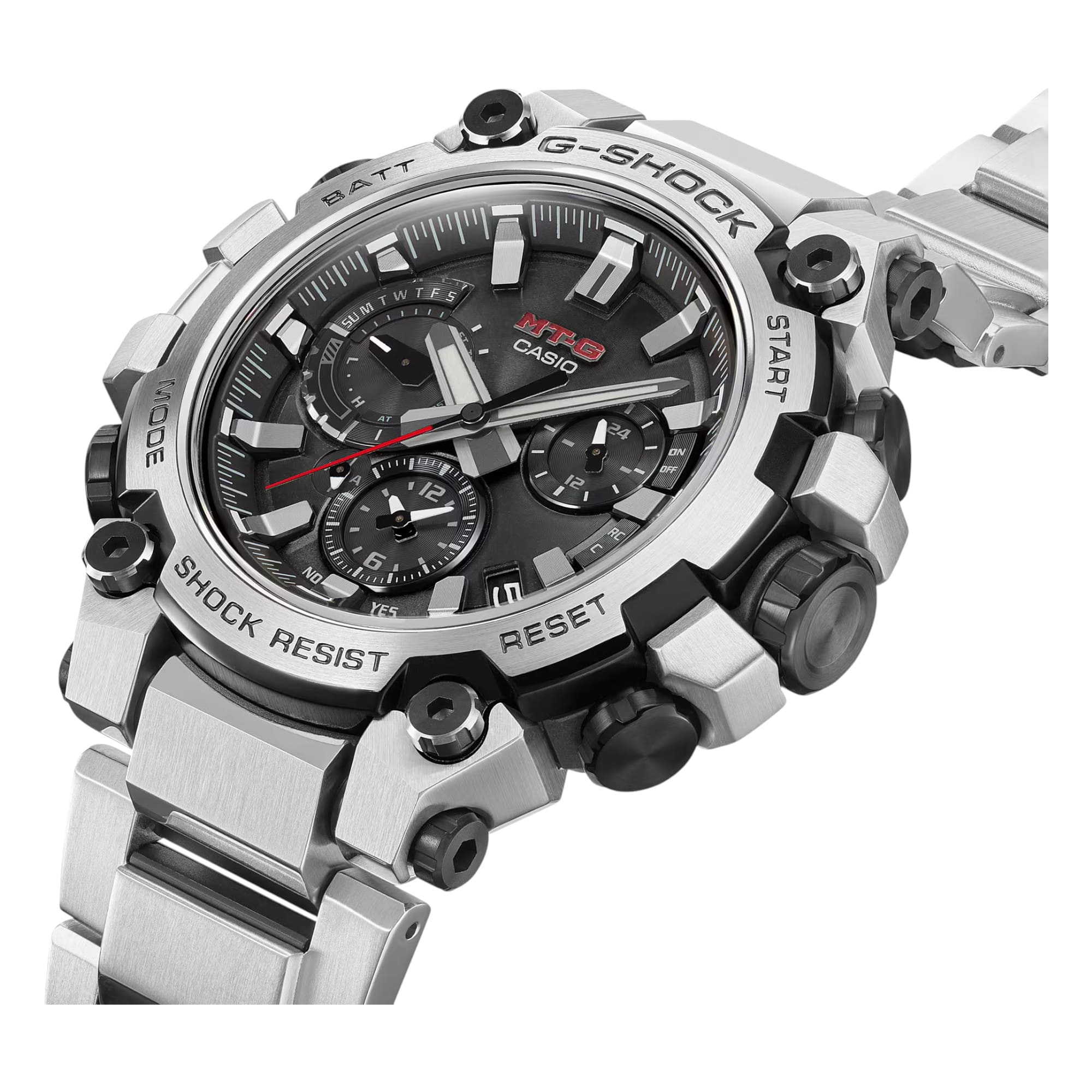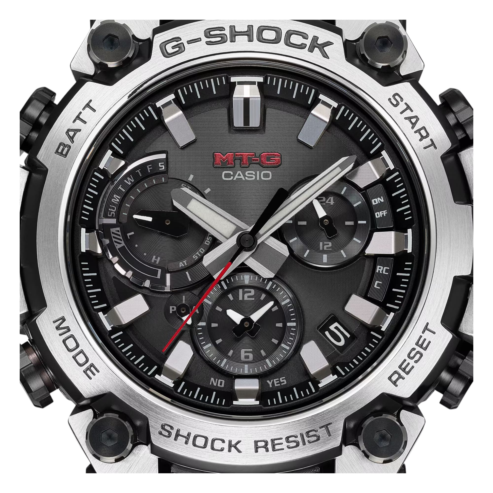 Une montre MT-G innovante née d'un tout nouveau concept qui combine la résine et les matériaux métalliques utilisés dans le premier modèle de G-SHOCK. Découvrez un tout nouveau niveau de sophistication de la conception structurelle. Le MTG-B3000 a une structure Dual Core Guard encore plus évoluée qui protège le module avec un boîtier en résine renforcée de carbone et enveloppe l'extérieur avec des pièces métalliques. En pressant, coupant et polissant à plusieurs reprises, le boîtier en acier inoxydable se transforme en une forme tridimensionnelle complexe. Le fond sert également de support pour le bracelet et de protection pour la couronne et les boutons, formant une toute nouvelle structure. Toutes ces technologies et conceptions innovantes nous ont permis de créer une montre beaucoup plus fine avec une dimension de seulement 12,1 mm entre la lunette et le fond du boîtier. Les innovations de MT-G se retrouvent jusque dans le bracelet. Aucun outil spécial n'est requis en raison de la toute nouvelle construction push-to-replace. Changez de bracelet rapidement et facilement en appuyant sur le bouton de chaque côté du bracelet. MTG-B3000D utilise un bracelet plus léger qui combine de l'acier inoxydable et de la résine fine. La lunette en acier inoxydable est recouverte d'un placage ionique noir et traitée avec une finition mate pour révéler l'acier inoxydable juste en dessous de la surface convexe. |