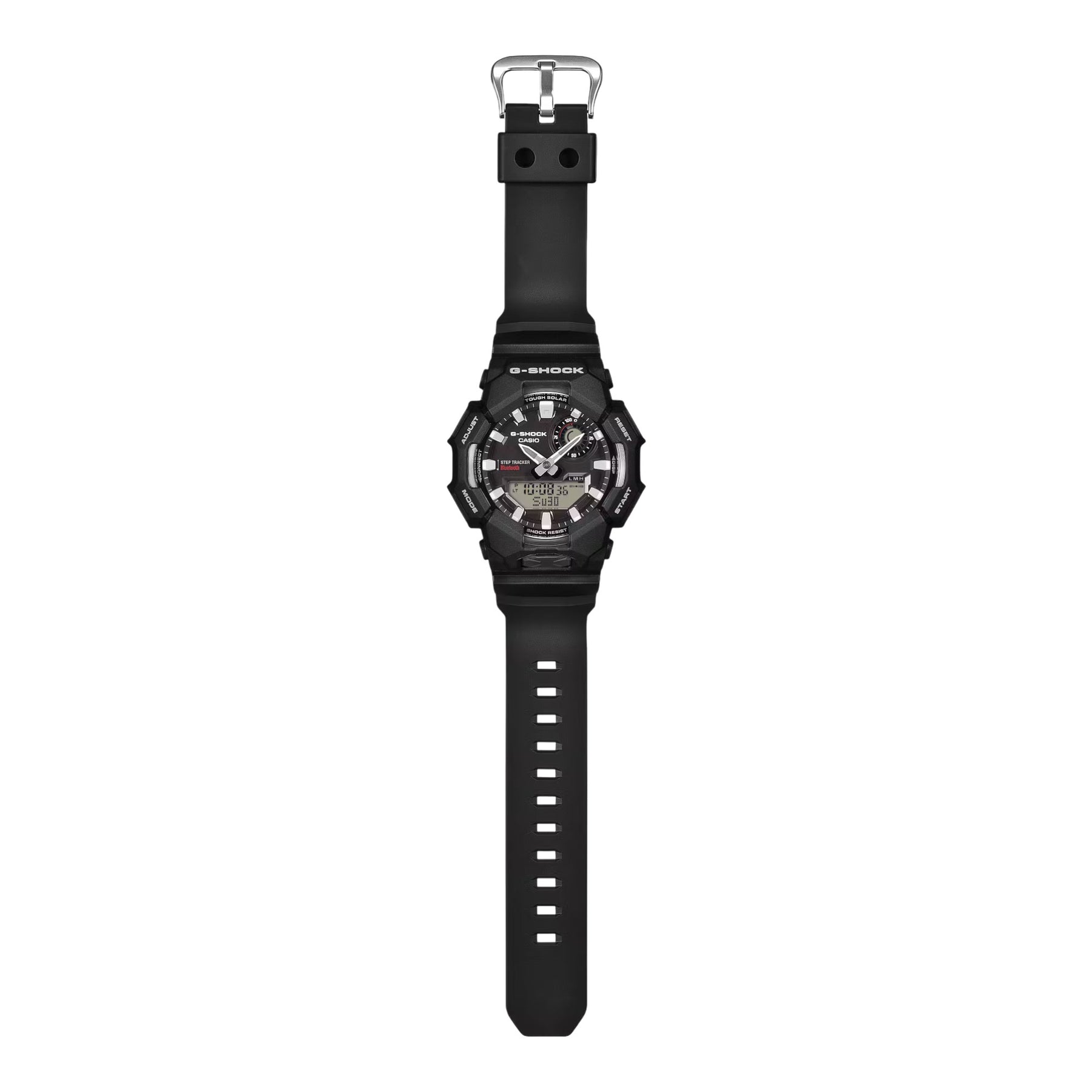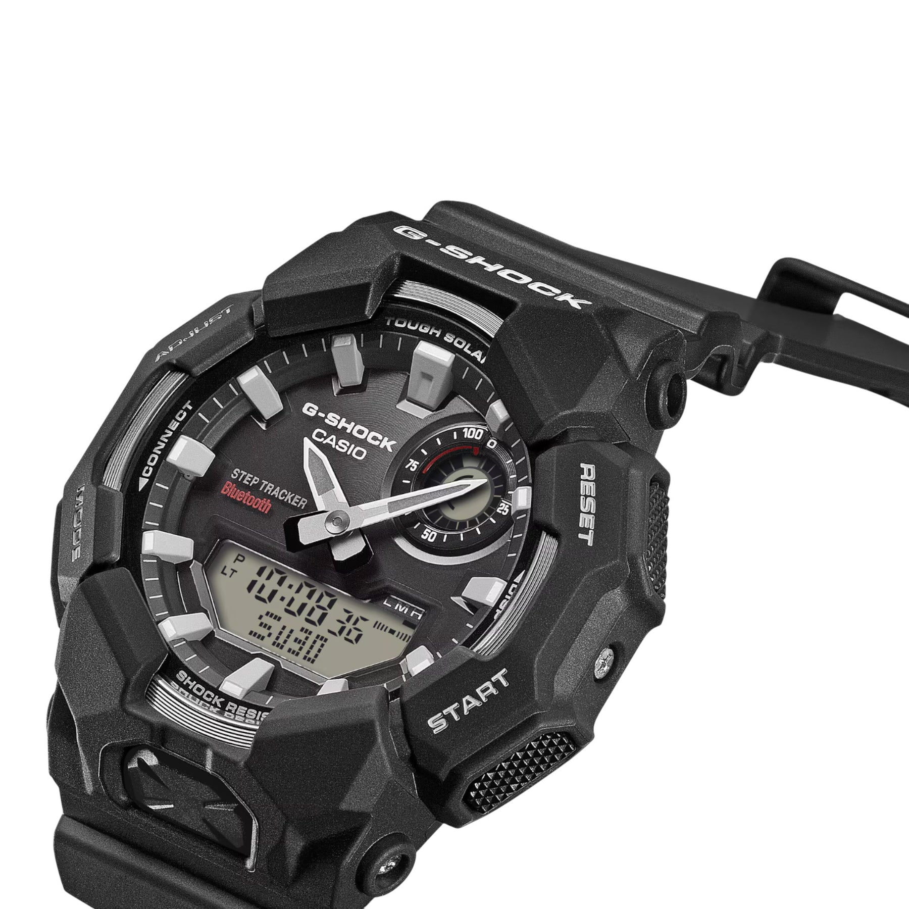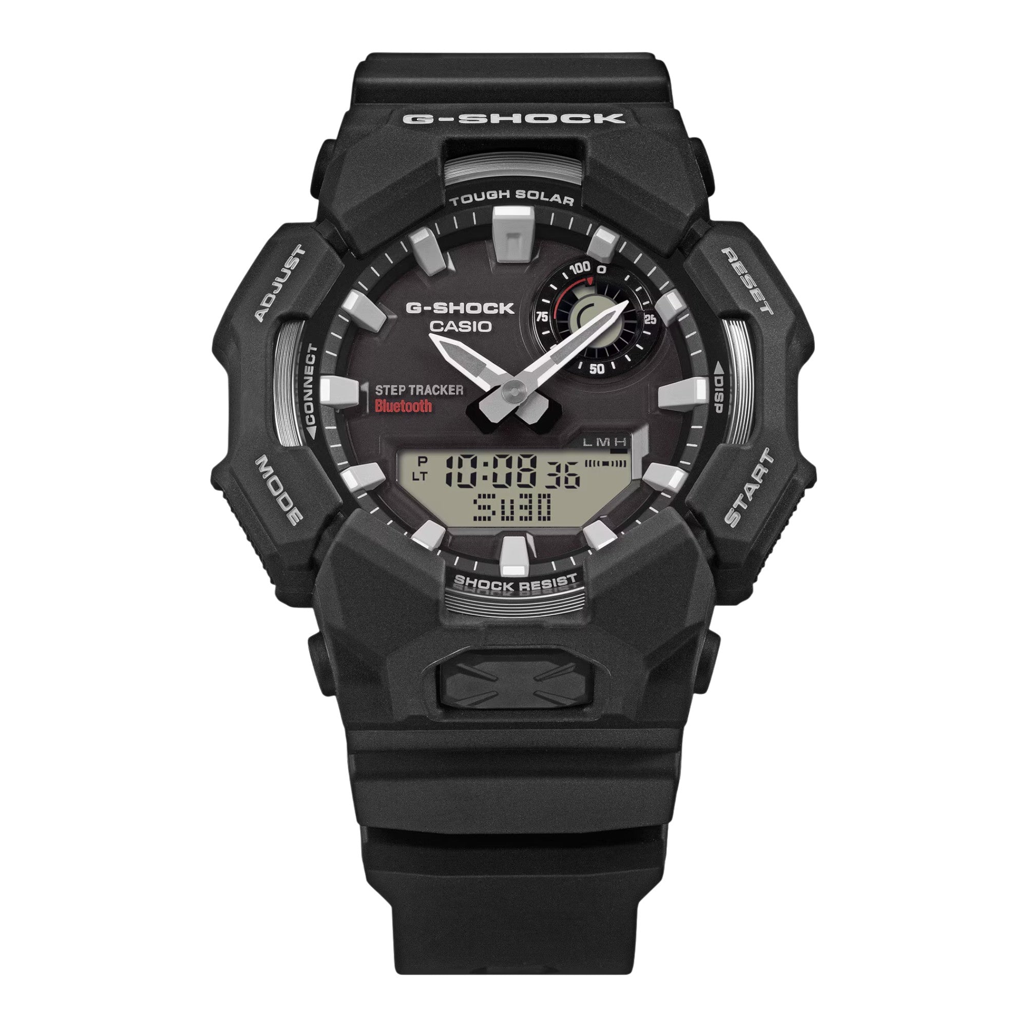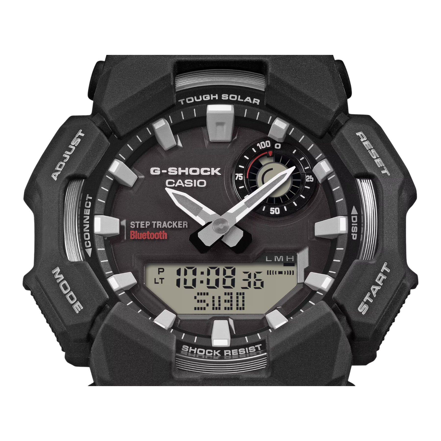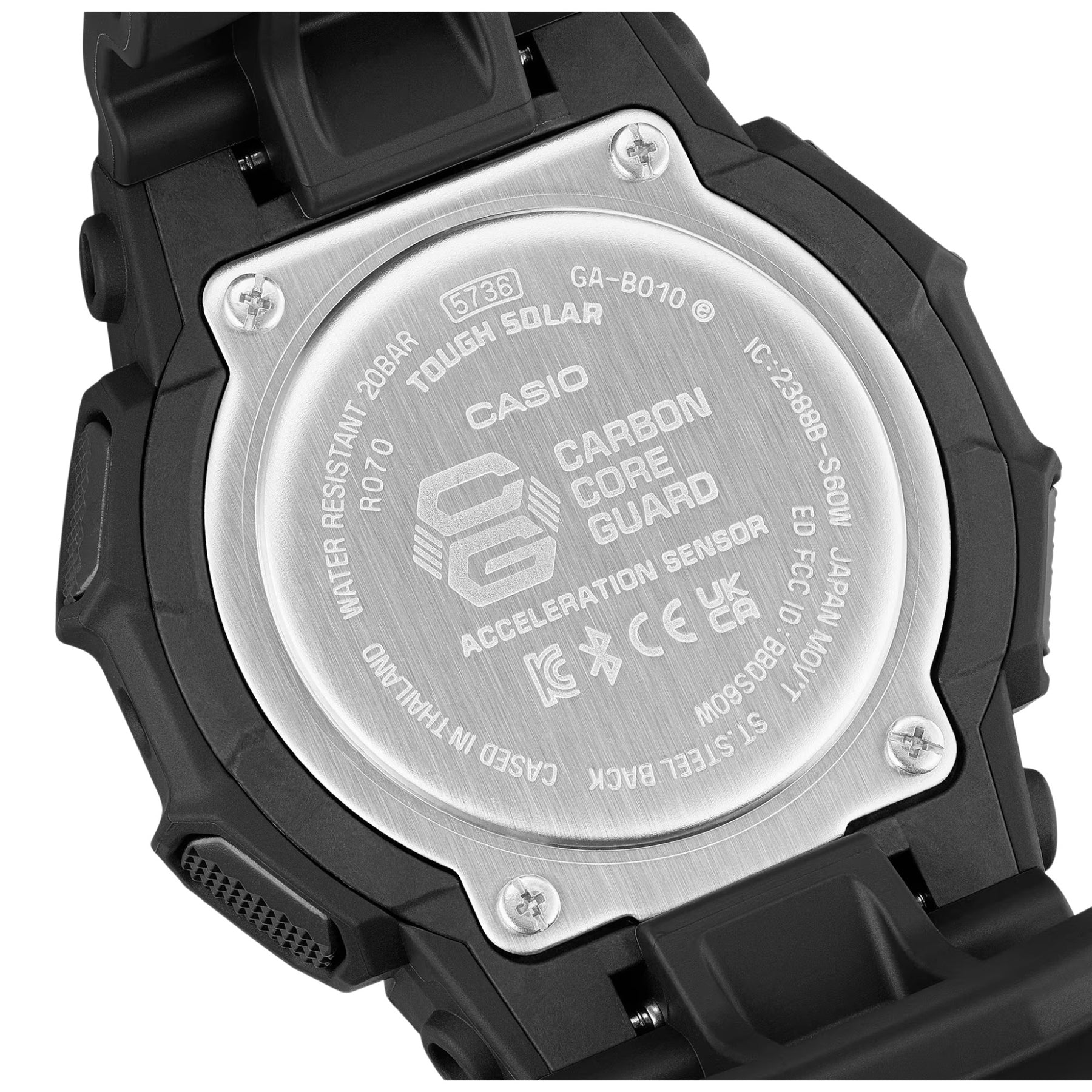 Découvrez la GA-B010, une montre analogique-numérique robuste et moderne, alimentée exclusivement par l’énergie solaire. Conçue pour offrir une lisibilité optimale et une polyvalence au quotidien, elle associe un large boîtier à un écran numérique généreux, pensé pour un affichage clair et immédiat des informations, notamment le comptage de pas. Son design soigné met en valeur un cadran travaillé avec une finition soleillée, une lunette rehaussée d’un dépôt de vapeur, ainsi qu’un cadran encastré sublimé par des accents métalliques. Chaque détail renforce son look puissant et technique, signature de G-SHOCK. Grâce à son capteur à énergie solaire, la GA-B010 mesure et affiche automatiquement les pas sans nécessiter aucune recharge externe. La connexion Bluetooth® intégrée permet de synchroniser la montre avec votre smartphone via l’application CASIO WATCHES, offrant un réglage automatique de l’heure d’une précision irréprochable et un accès simple à vos journaux d’activité. Idéale pour un usage quotidien comme pour les déplacements professionnels, la montre propose des fonctions essentielles telles que l’heure universelle, le chronomètre, ainsi qu’un éclairage LED haute luminosité. Les aiguilles et index revêtus de matière luminescente assurent une lecture parfaite, même dans l’obscurité. Respectueuse de l’environnement, la GA-B010 adopte un boîtier en résine biosourcée, un matériau innovant qui réduit son impact écologique tout en garantissant la durabilité propre à G-SHOCK. Polyvalente, confortable et taillée pour durer, cette montre passe avec aisance d’un style décontracté à un environnement plus formel — un compagnon fiable pour de nombreuses années. |
