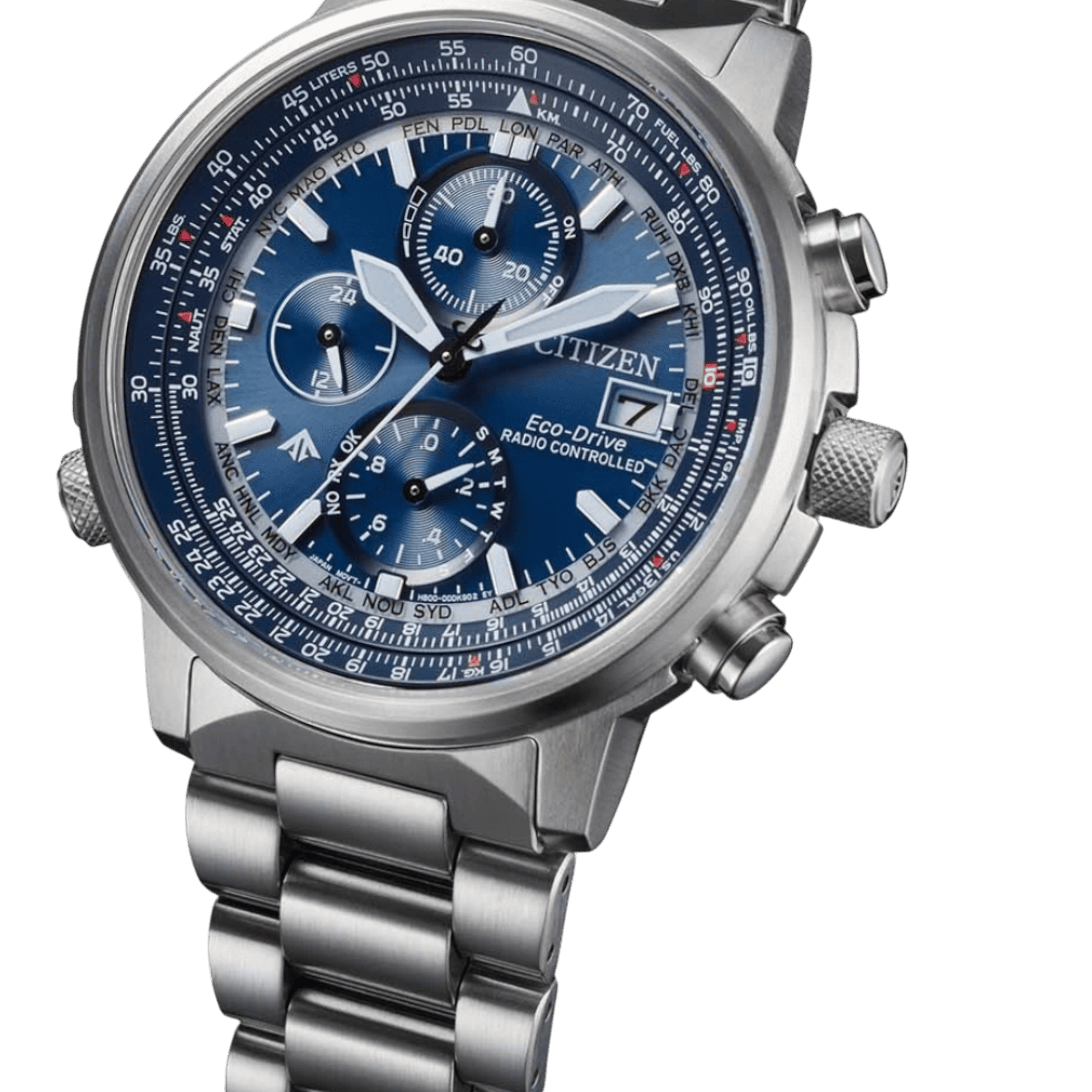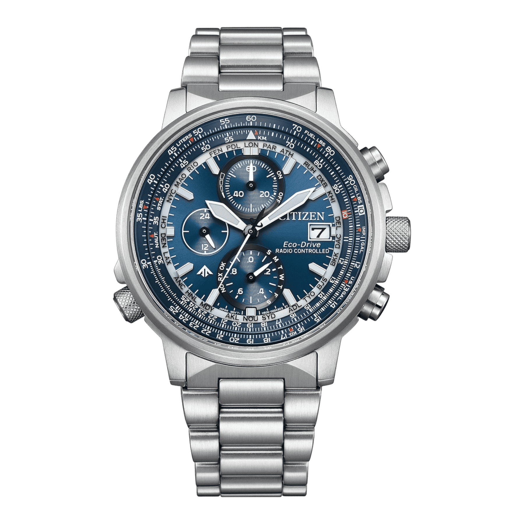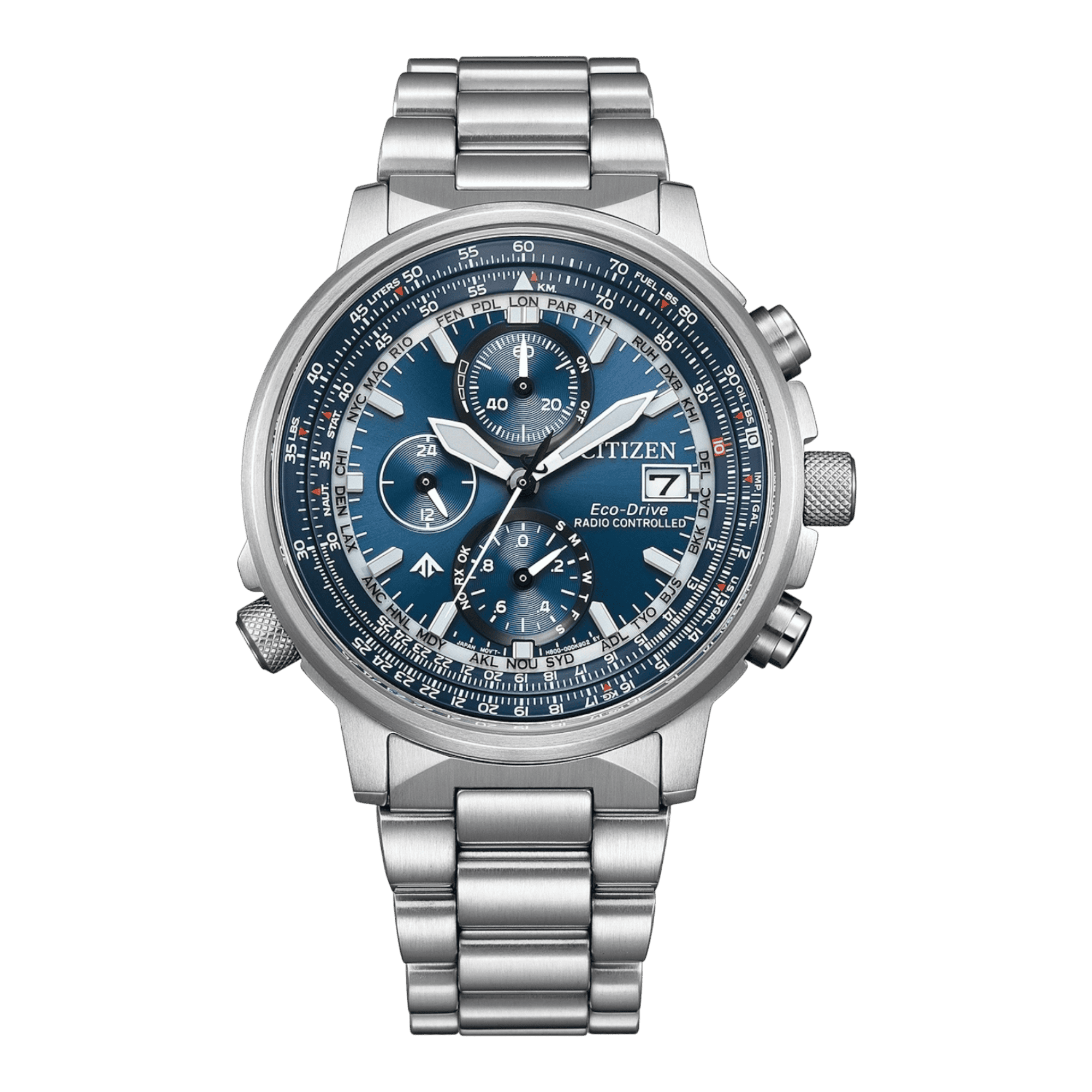 Citizen Promaster Sky Eco-Drive H800 – Chronographe radio-piloté acier & cadran bleuDescription longue optimisée SEOLa Citizen Promaster Sky Eco-Drive H800 est une montre professionnelle conçue pour les passionnés d’aviation, les voyageurs et les amateurs de précision. Dotée d’un boîtier en acier inoxydable argenté de 41 mm (épaisseur 11,62 mm), elle allie robustesse et élégance tout en intégrant l’un des calibres Eco-Drive les plus avancés de la marque. Animée par le calibre Eco-Drive H800, cette montre fonctionne sans pile, alimentée par la lumière, et offre une réserve d’énergie allant jusqu’à 180 jours. Elle propose un ensemble complet de fonctionnalités professionnelles :