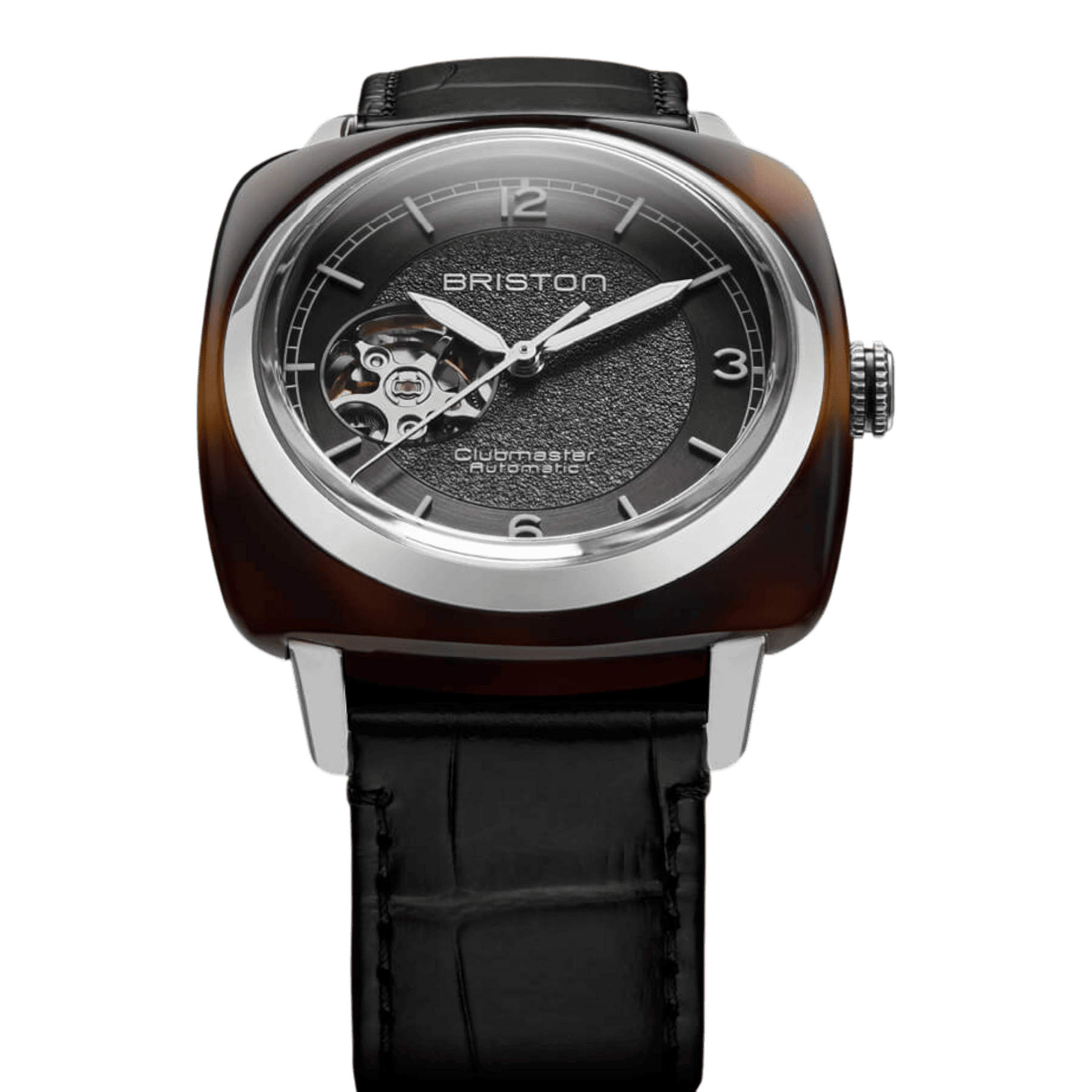 Forme "carrée cambrée" dite coussin Corps de boîte en acier inoxydable 316L et acétate écaille finition satinée ou acier inoxydable 316L entièrement poli miroir Cornes/couronne/fond vissé/boucle : acier inoxydable 316 L Couronne vissée et gravée avec blason BRISTON en acier poli et insert noir
