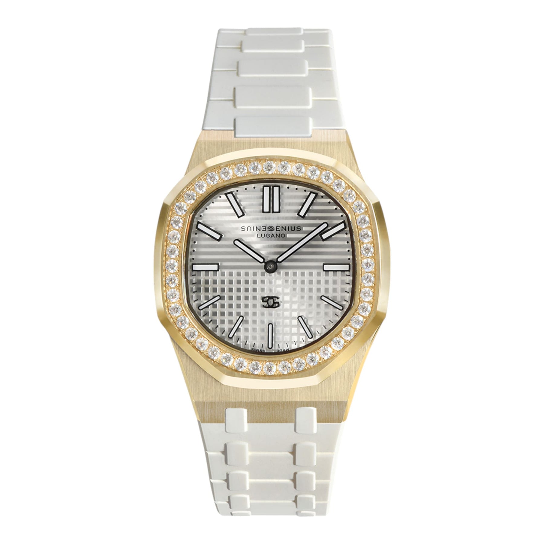 Fruit de l’avant-garde horlogère suisse, la montre Genius Idiofyia 36 mm Diamonds –  Edition marie avec brio innovation technique, symbolisme antique et luxe contemporain. Ce modèle exclusif se distingue par un cadran double guilloché , orné de 42 diamants de laboratoire pour une brillance responsable et spectaculaire.