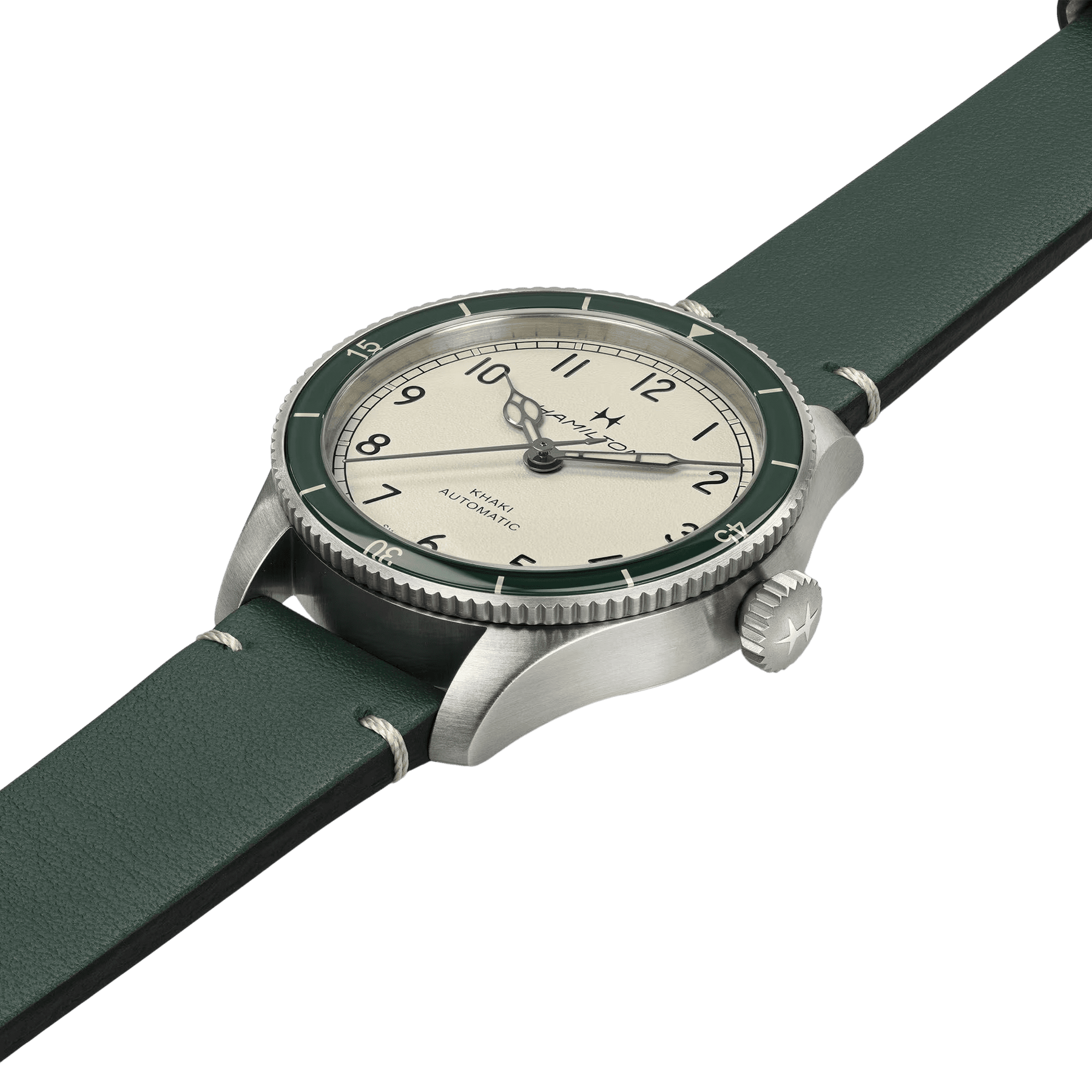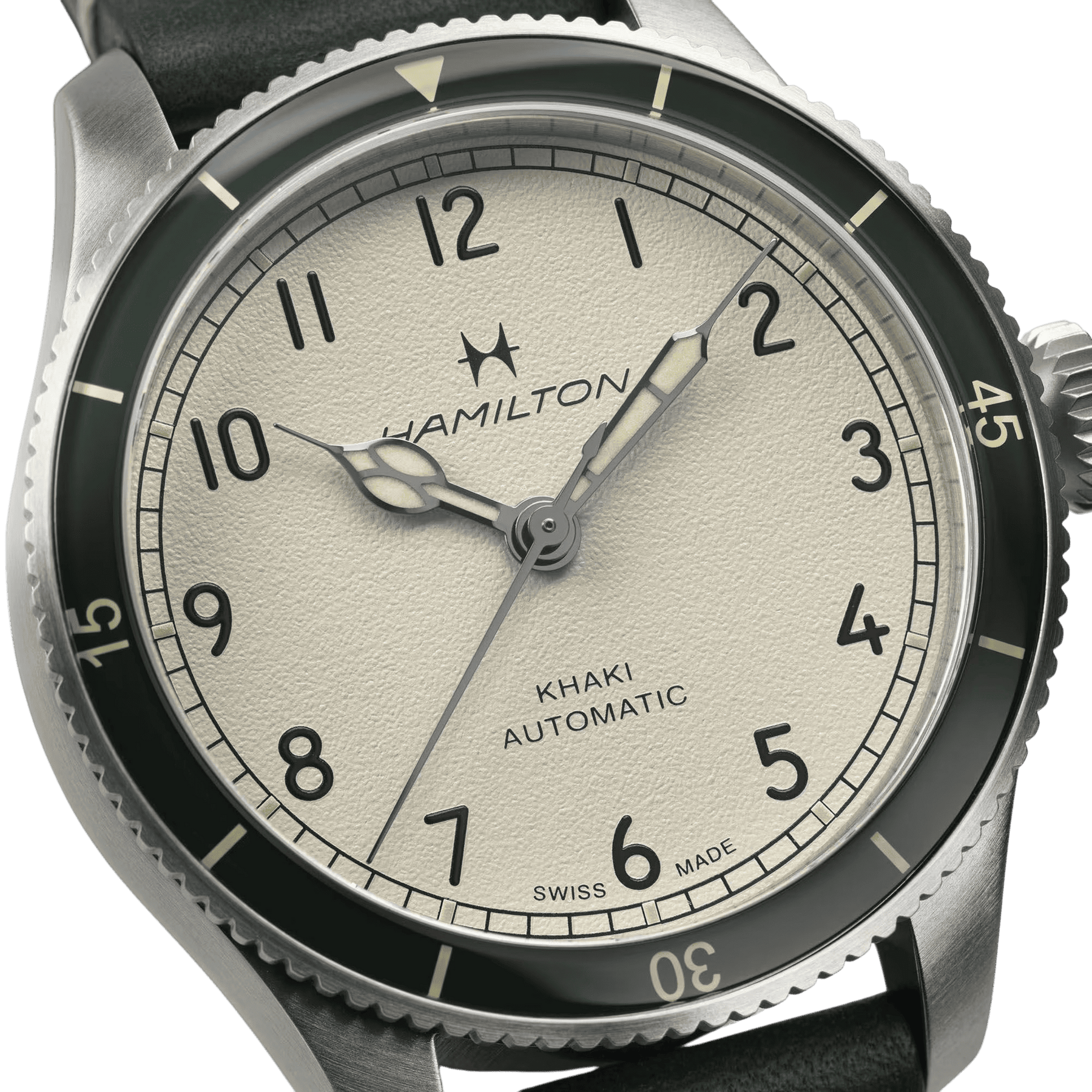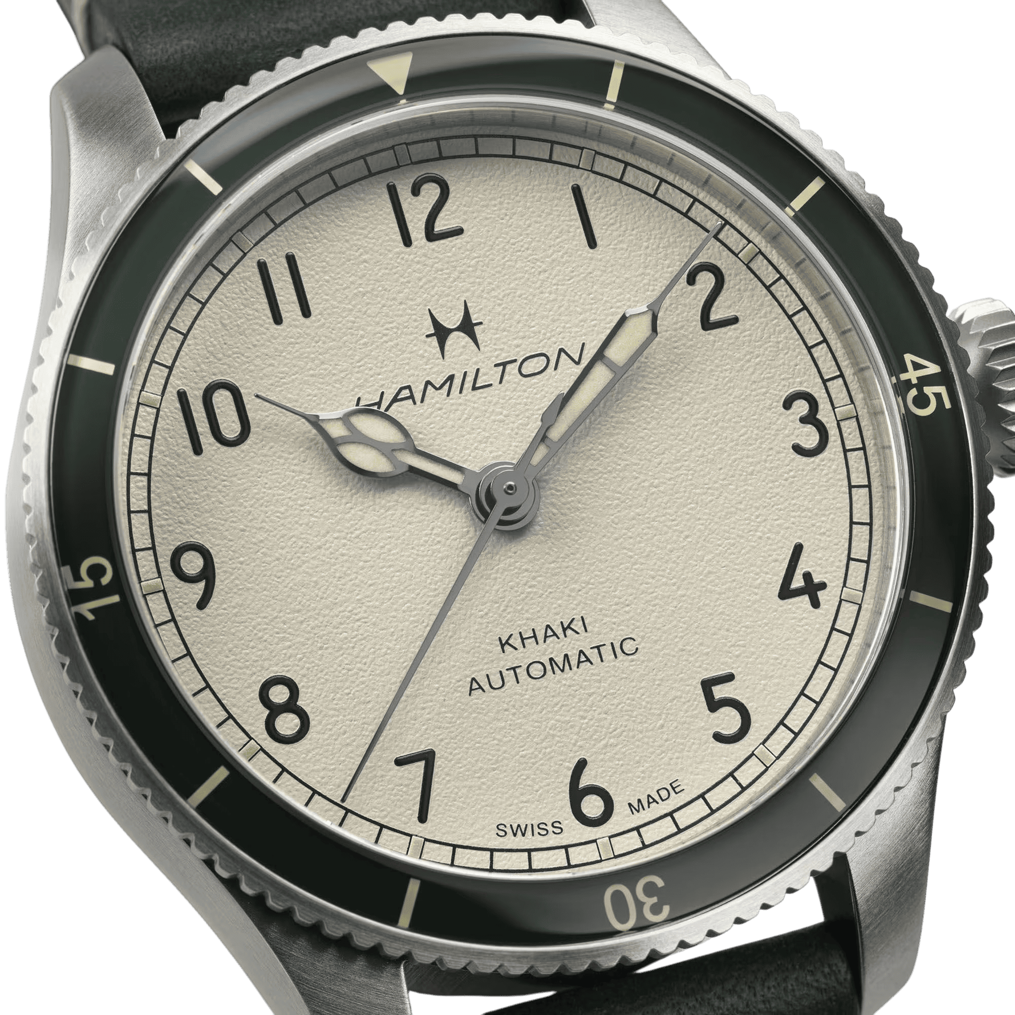 Hamilton Khaki Pilot Pioneer Auto 38 mm – L’élégance vintage au service de la précision suisseInspirée des instruments de bord des années 1940, la Hamilton Khaki Pilot Pioneer Auto 38 mm incarne le lien historique de la marque avec l’aviation militaire. Cette montre automatique séduit par son charme rétro et sa conception soignée, alliant tradition et performance. Son boîtier de 38 mm habillé d’un ton vert mousse s’accompagne d’une lunette tournante colorée, rappelant les codes des montres de pilotes d’époque. Le cadran blanc coquille d'œuf, rehaussé de chiffres arabes et d’aiguilles luminescentes, offre une lisibilité optimale dans toutes les conditions. Animée par le mouvement automatique H-10, cette Khaki Pilot Pioneer garantit une réserve de marche exceptionnelle de 80 heures, symbole du savoir-faire horloger suisse. Son bracelet en cuir vert, souple et robuste, parachève un look intemporel et authentique. |