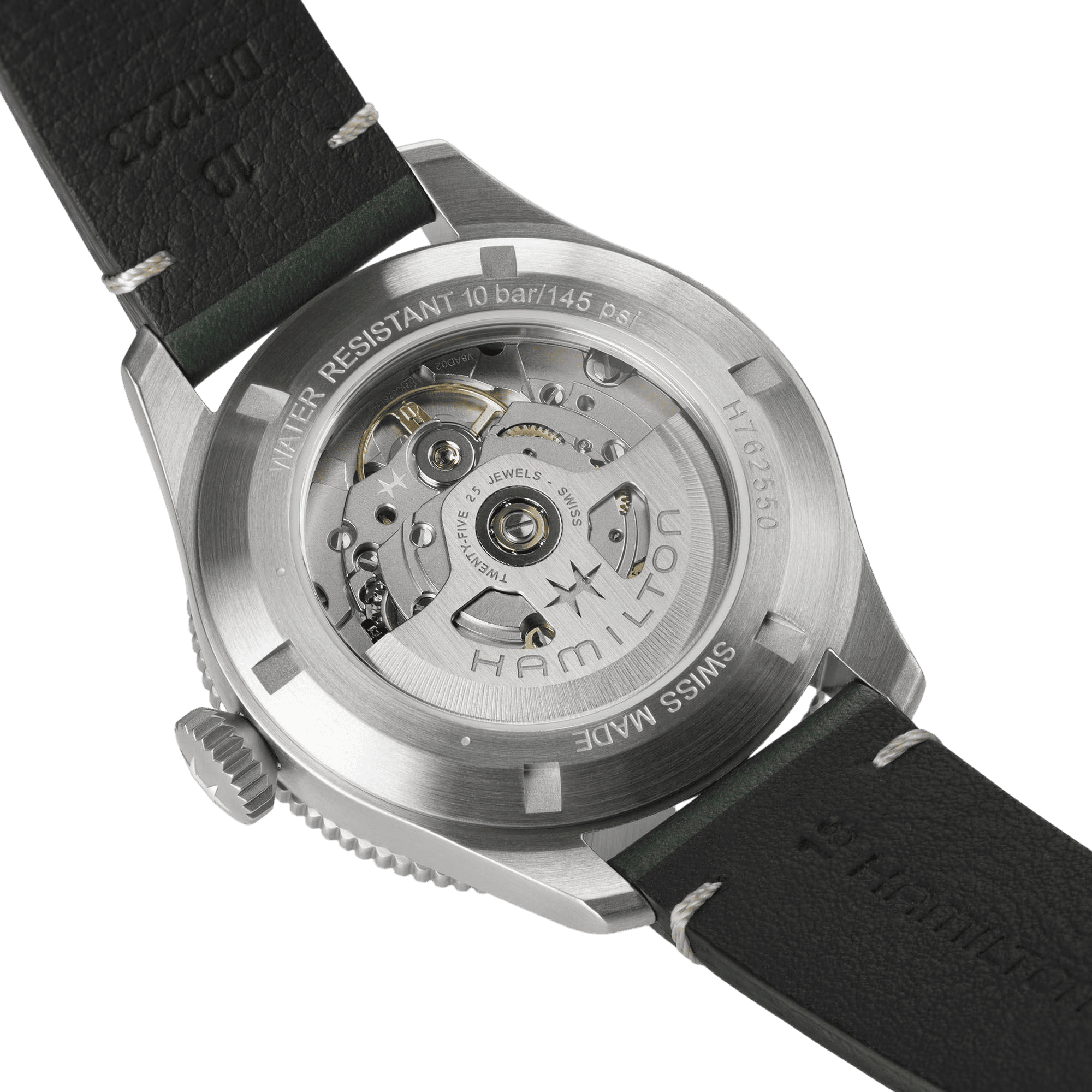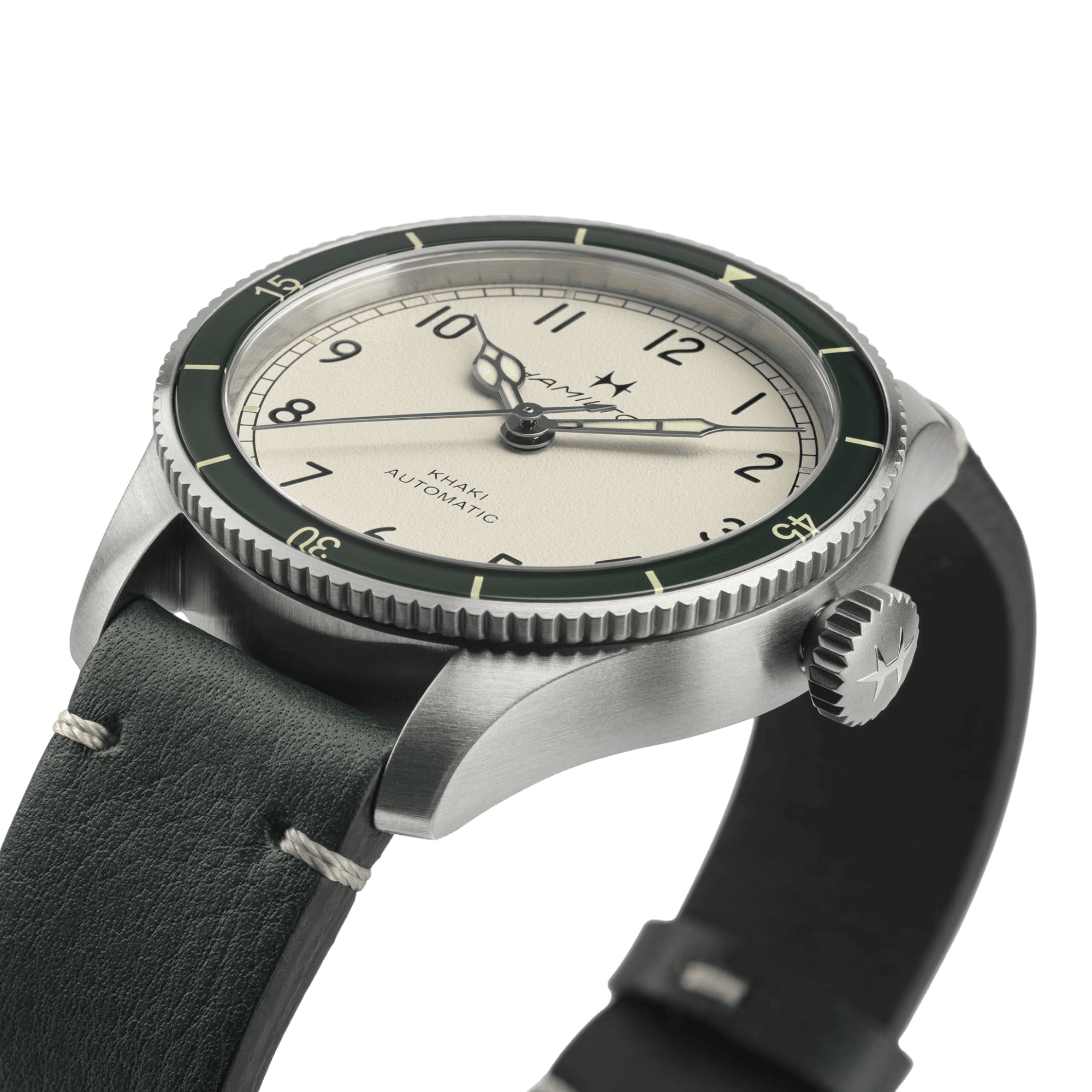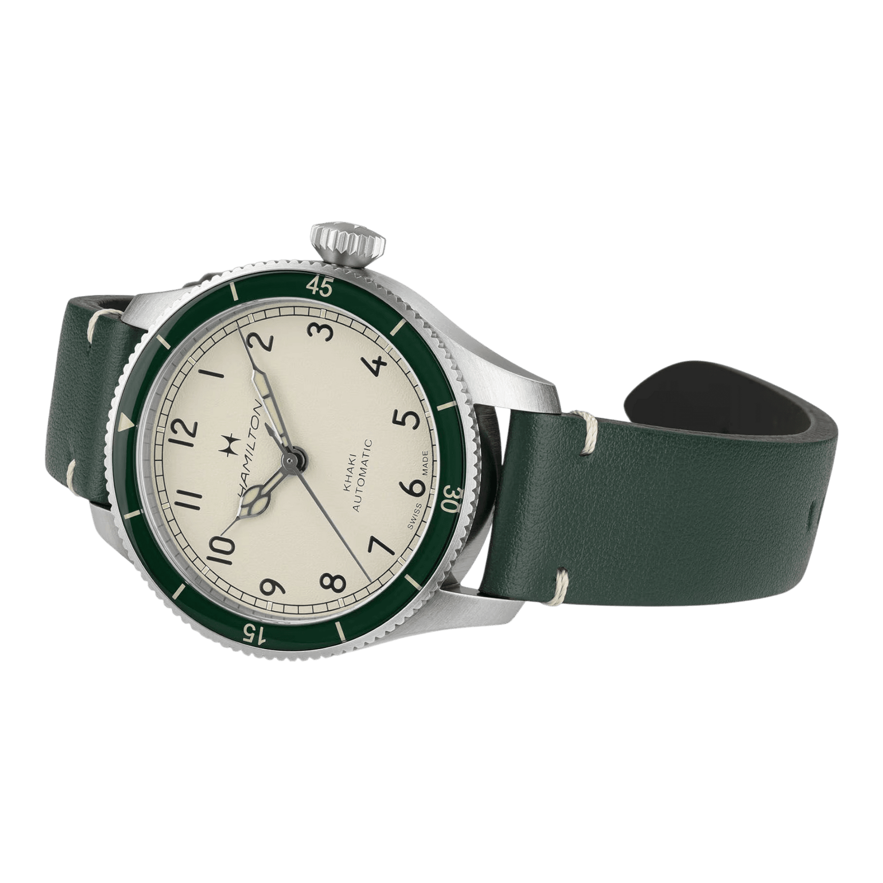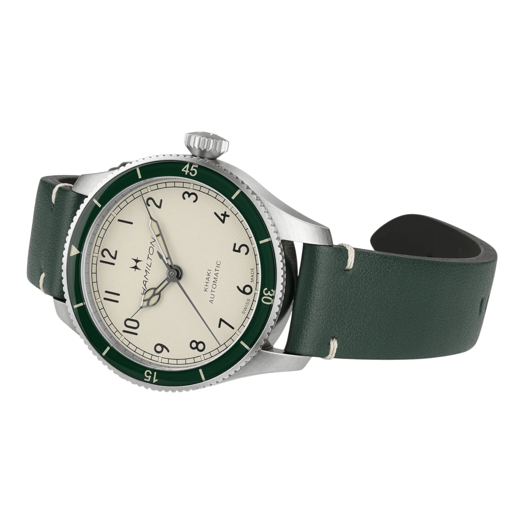 Hamilton Khaki Pilot Pioneer Auto 38 mm – L’élégance vintage au service de la précision suisseInspirée des instruments de bord des années 1940, la Hamilton Khaki Pilot Pioneer Auto 38 mm incarne le lien historique de la marque avec l’aviation militaire. Cette montre automatique séduit par son charme rétro et sa conception soignée, alliant tradition et performance. Son boîtier de 38 mm habillé d’un ton vert mousse s’accompagne d’une lunette tournante colorée, rappelant les codes des montres de pilotes d’époque. Le cadran blanc coquille d'œuf, rehaussé de chiffres arabes et d’aiguilles luminescentes, offre une lisibilité optimale dans toutes les conditions. Animée par le mouvement automatique H-10, cette Khaki Pilot Pioneer garantit une réserve de marche exceptionnelle de 80 heures, symbole du savoir-faire horloger suisse. Son bracelet en cuir vert, souple et robuste, parachève un look intemporel et authentique. |