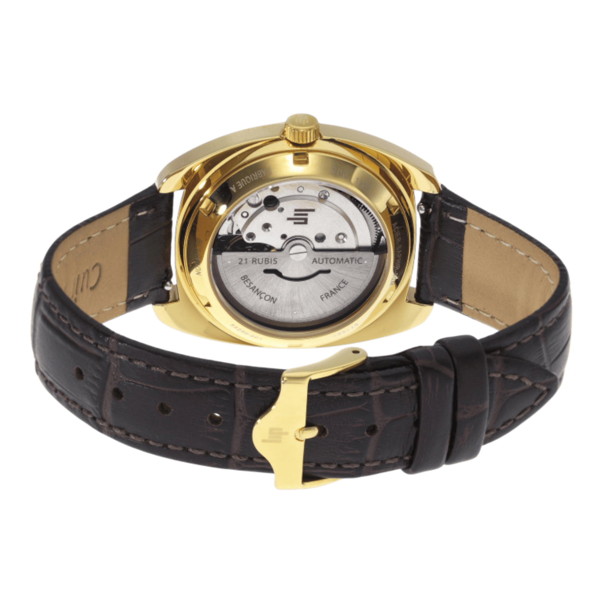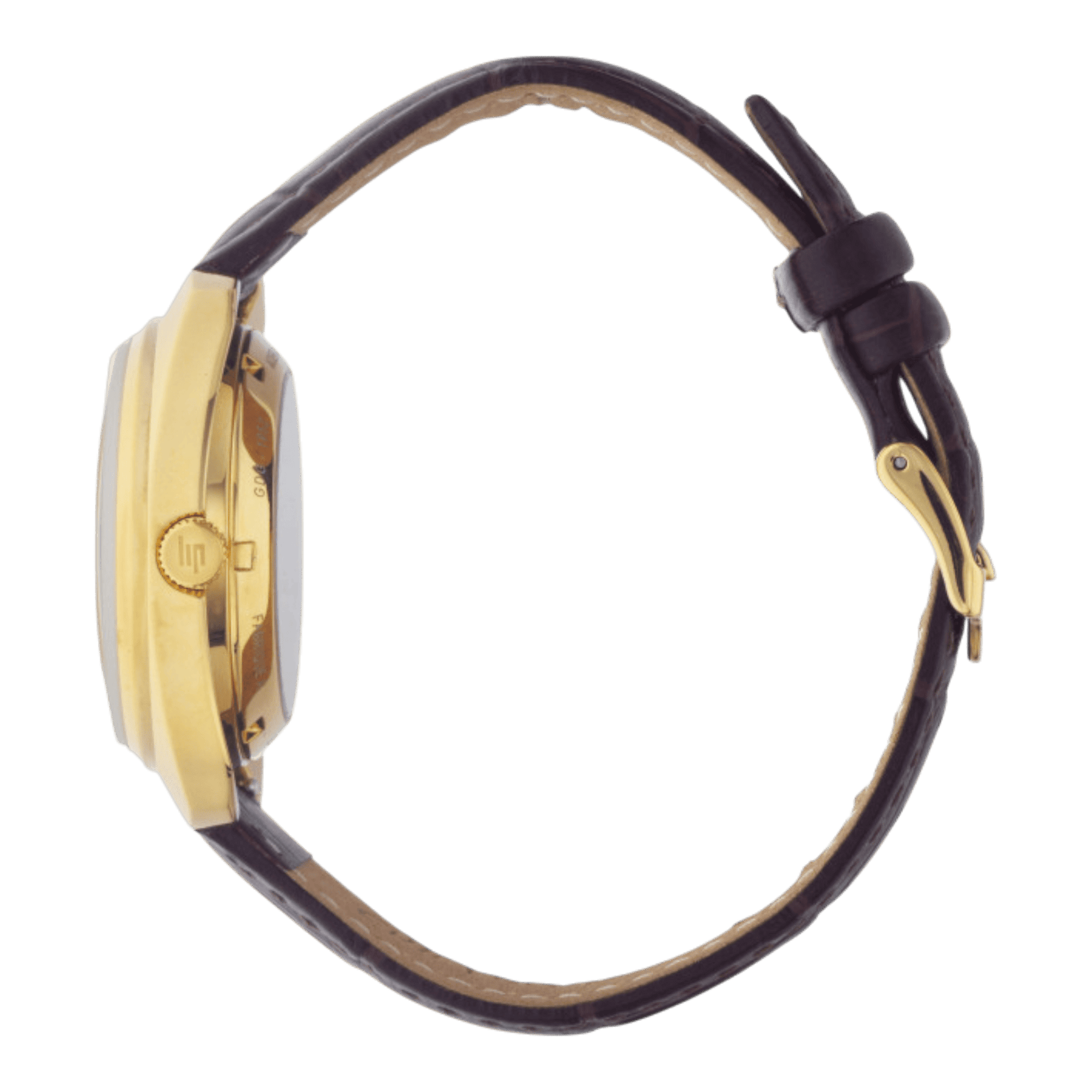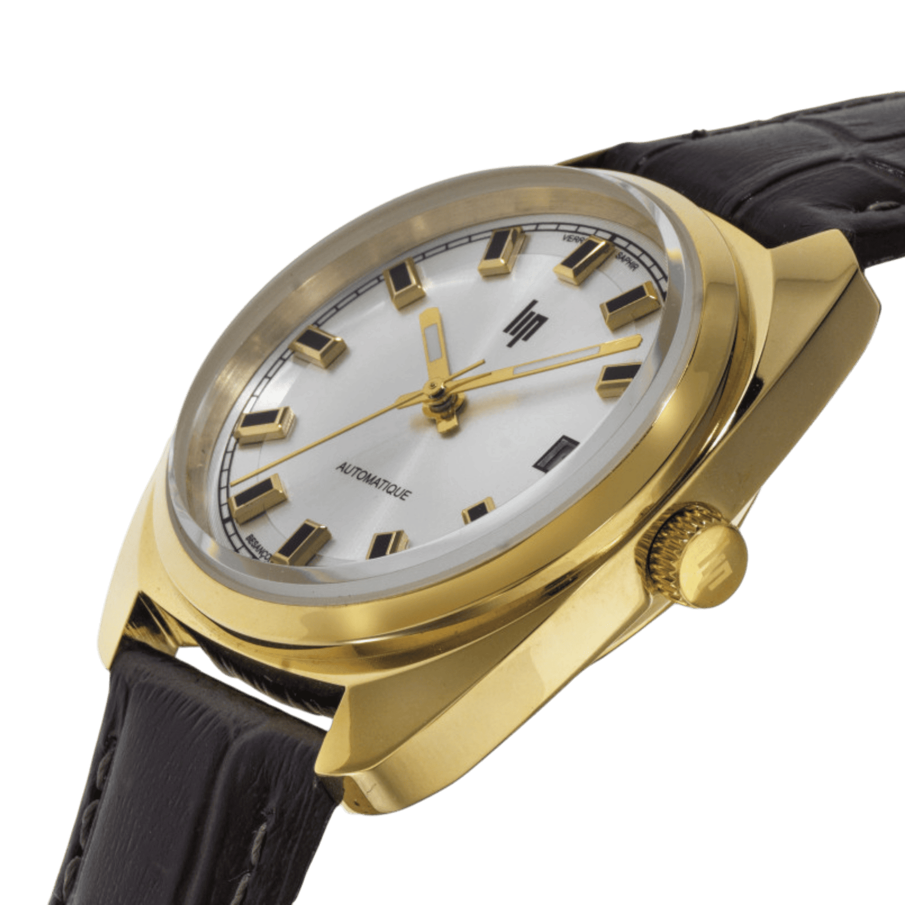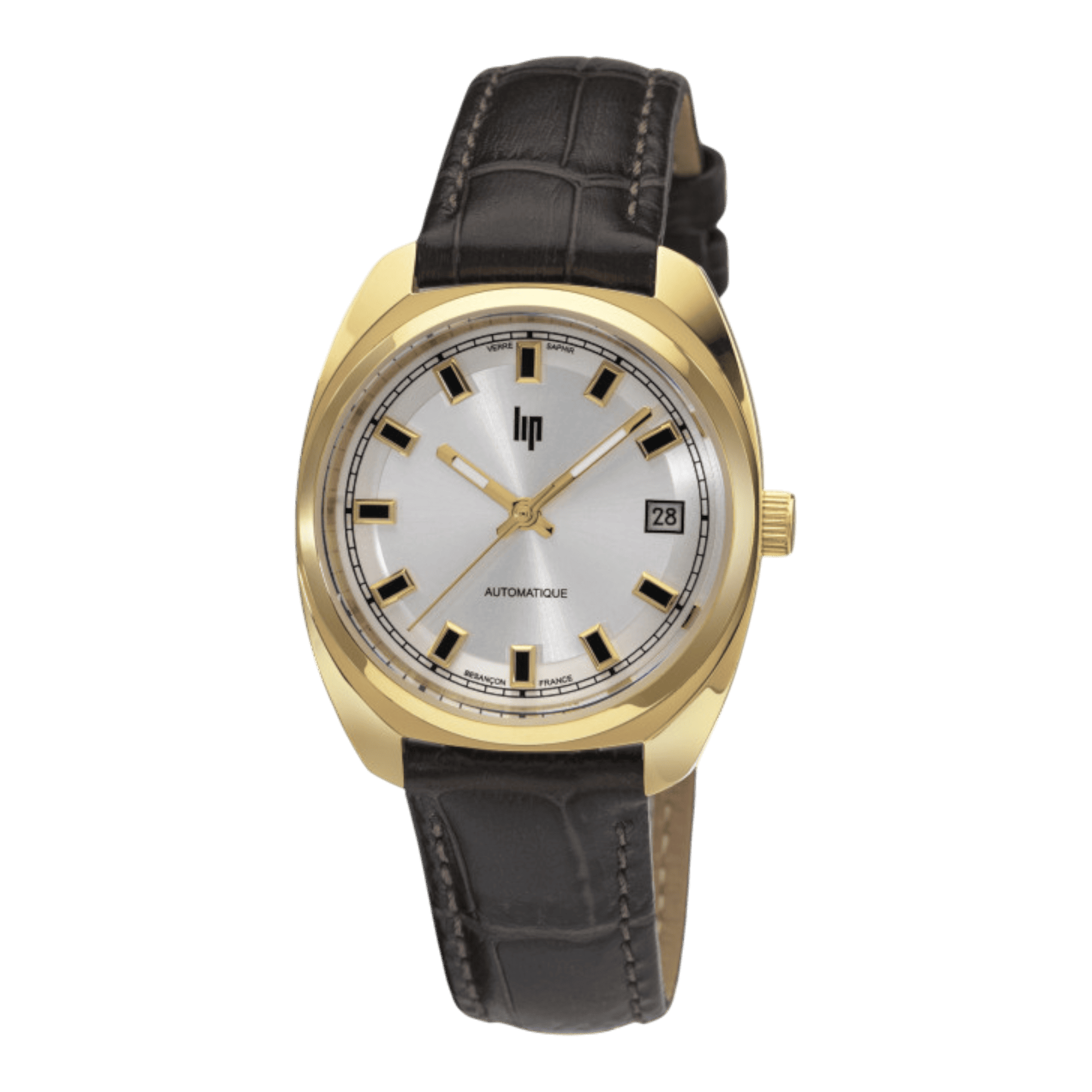 Son boîtier doré poli de 35 mm, aux cornes raffinées, abrite un cadran blanc argenté soleillé d’une grande pureté, affichant les trois aiguilles et la date : la quintessence du minimalisme horloger. Montée sur un bracelet en cuir de vachette marron façon crocodile, surpiqué ton sur ton et doté d’une boucle ardillon dorée siglée LIP, cette montre séduit par son charme vintage revisité et sa présence discrète mais affirmée.