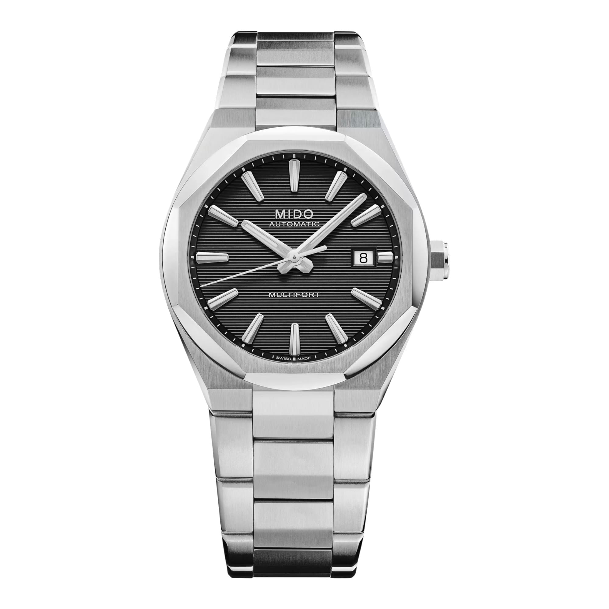 La MIDO Multifort 8 One Crown est une montre automatique suisse qui se distingue par un design contemporain audacieux et une conception technique de haut niveau. Son boîtier en acier inoxydable de 40 mm, parfaitement équilibré, est sublimé par une lunette octogonale distinctive, signature forte de cette collection Multifort. Le cadran texturé à rainures horizontales apporte rythme et profondeur, renforçant le caractère moderne de la montre. Les index et aiguilles traités au Super-LumiNova® garantissent une lisibilité optimale, de jour comme de nuit. L’ensemble est protégé par un verre saphir double face avec traitement antireflet, reconnu pour sa résistance aux rayures et sa transparence exceptionnelle. Au cœur de cette montre MIDO bat le Calibre 80, un mouvement automatique suisse offrant une réserve de marche allant jusqu’à 80 heures. Visible à travers le fond transparent, il témoigne du savoir-faire horloger de la marque et de sa quête de précision et de fiabilité. Alliance parfaite entre innovation et design, la Multifort 8 One Crown incarne la philosophie TECHNOMETRY de MIDO, où technologie et géométrie se rencontrent. Robuste, précise et élégante, cette montre mécanique s’adresse aux amateurs d’horlogerie suisse à la recherche d’un garde-temps de caractère, aussi performant que stylé. |