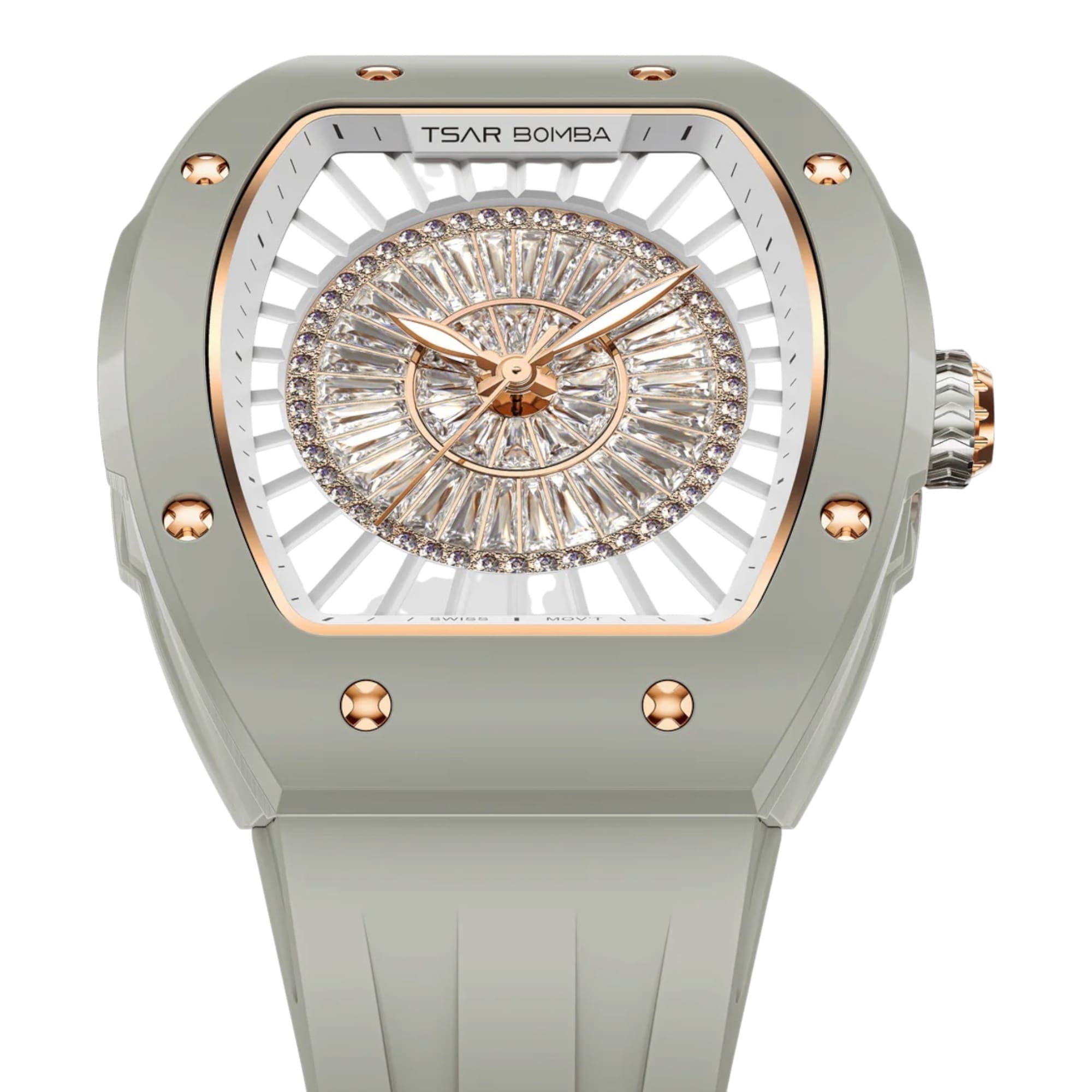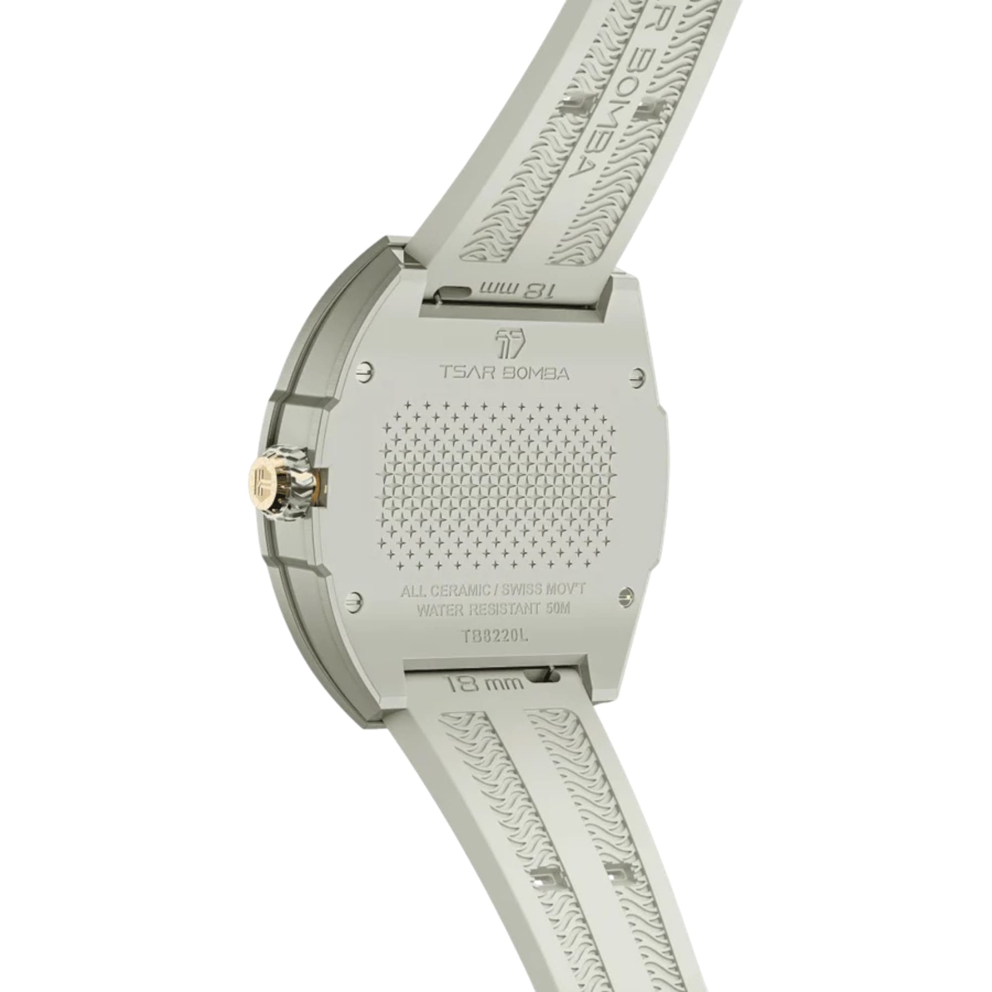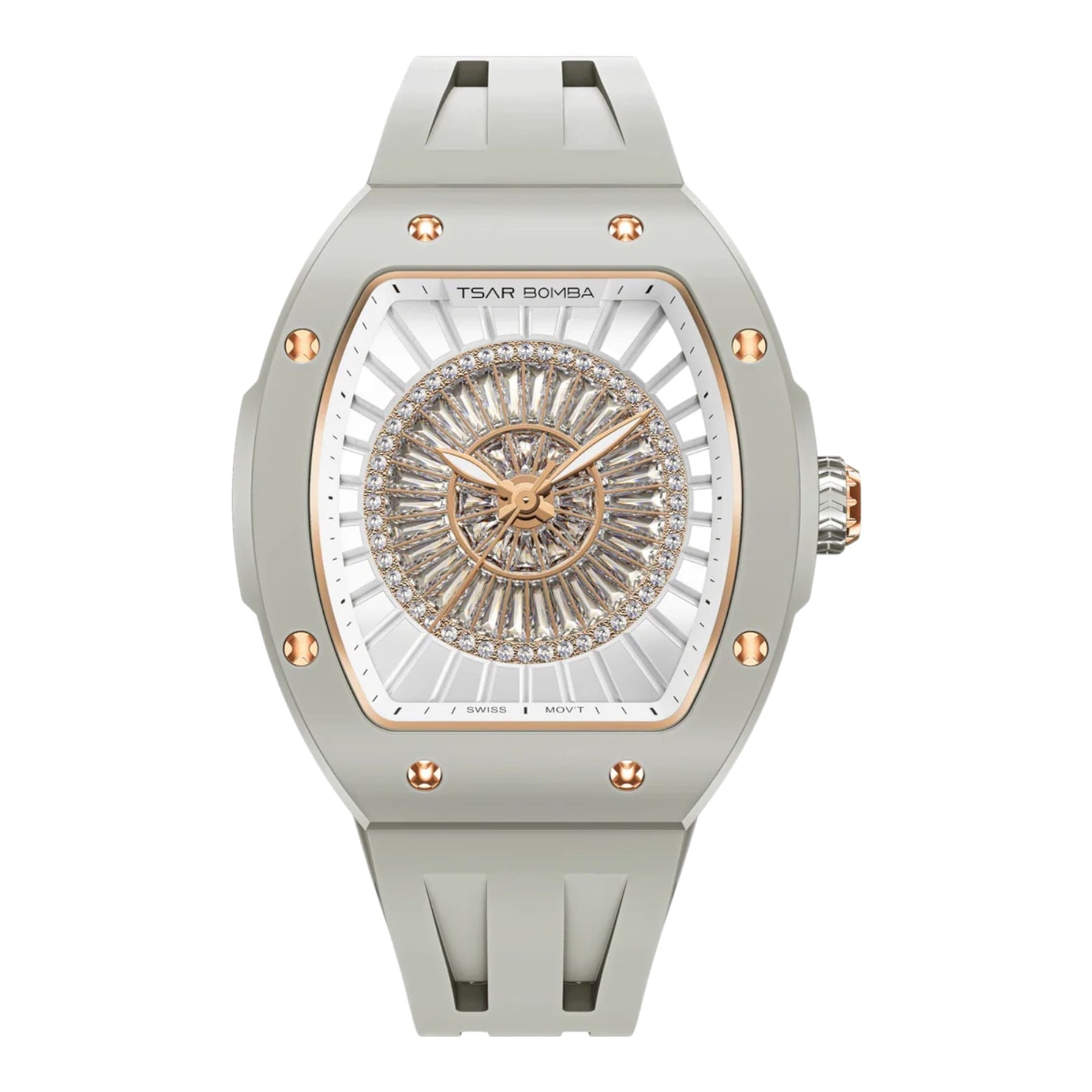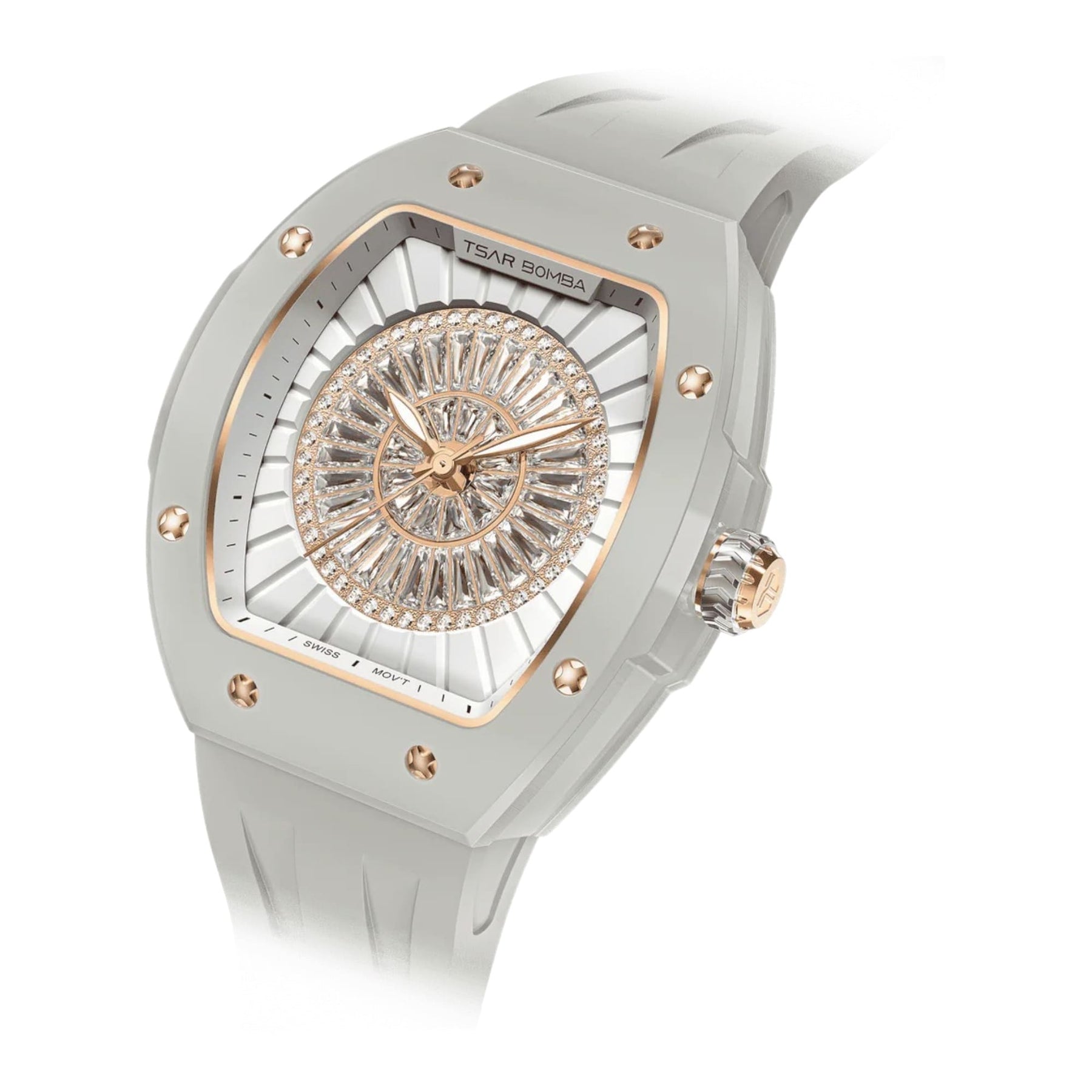 Découvrez la montre femme Tsar Bomba Nucleus Series en céramique, une pièce contemporaine au design tonneau qui incarne la signature audacieuse de la Maison Tsar Bomba. Pensée pour une allure sophistiquée au quotidien, elle marie luxe discret et élégance naturelle : le temps en mouvement, la grâce en mouvement. Son boîtier en céramique high-tech offre une présence raffinée tout en restant agréable à porter : avec ses dimensions 35 mm (L) x 39,5 mm (H) x 10,3 mm (P) et son poids plume de 60 g, elle se fond parfaitement au poignet. La lunette en céramique renforce l’aspect premium et la résistance, tandis que le verre saphir protège le cadran durablement contre les rayures. Au centre, l’esthétique fait la différence : un cadran minimaliste sublimé par un cercle éclatant de zirconiums cubiques, qui capture la lumière à chaque geste. Résultat : une brillance subtile, un charme immédiat, une identité forte — idéale pour celles qui recherchent une montre femme élégante avec un vrai parti pris design. Côté performance, cette Tsar Bomba est animée par un mouvement Quartz suisse 763, reconnu pour sa précision et sa fiabilité. Elle propose une résistance à l’eau 5 ATM / 5 bars, adaptée à la vie de tous les jours (pluie, éclaboussures, lavage des mains). La lisibilité est renforcée par une luminescence Note A, pratique lorsque la lumière baisse. Enfin, son bracelet assure confort et maintien : 210 mm de longueur pour 18 mm de largeur, parfait pour un port stable et agréable. Plus qu’un accessoire, la Tsar Bomba Nucleus femme est une montre-bijou moderne qui révèle une personnalité sûre d’elle, entre style, précision et éclat. |