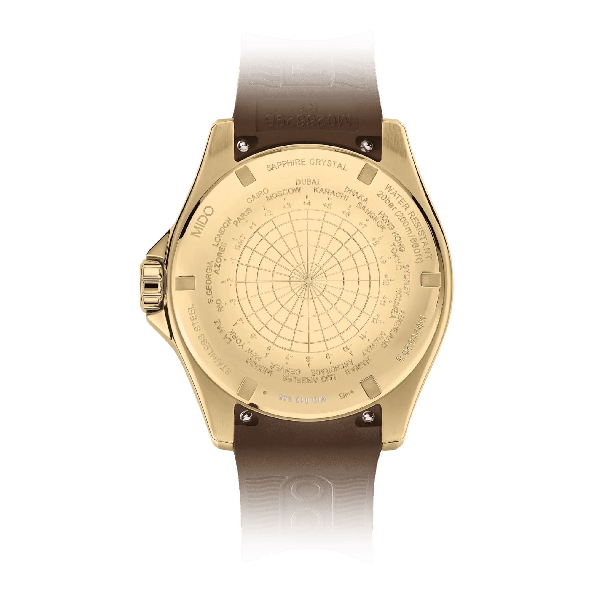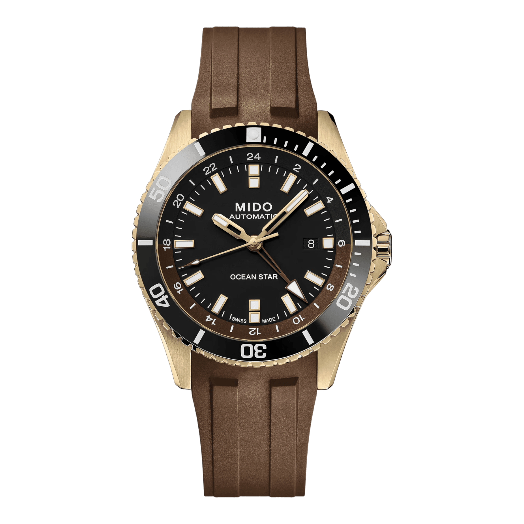 Mido Ocean Star GMT – L’aventure à double fuseau horaireLa Mido Ocean Star GMT combine l’esprit marin à la précision suisse. Dotée d’une fonction GMT intuitive, elle permet de lire simultanément deux fuseaux horaires, parfaite pour les voyageurs et aventuriers des océans. Son boîtier de 44 mm et sa couronne vissée assurent une étanchéité jusqu’à 200 mètres, tandis que le Calibre automatique 80 offre 80 heures de réserve de marche et une fiabilité remarquable. Sur le fond gravé figurent les principaux fuseaux horaires du monde, symbole de son ADN voyageur. Avec son design robuste, sa lunette 24 h et son allure sportive chic, la Ocean Star GMT incarne la montre de plongée par excellence — performante, précise et résolument libre. |