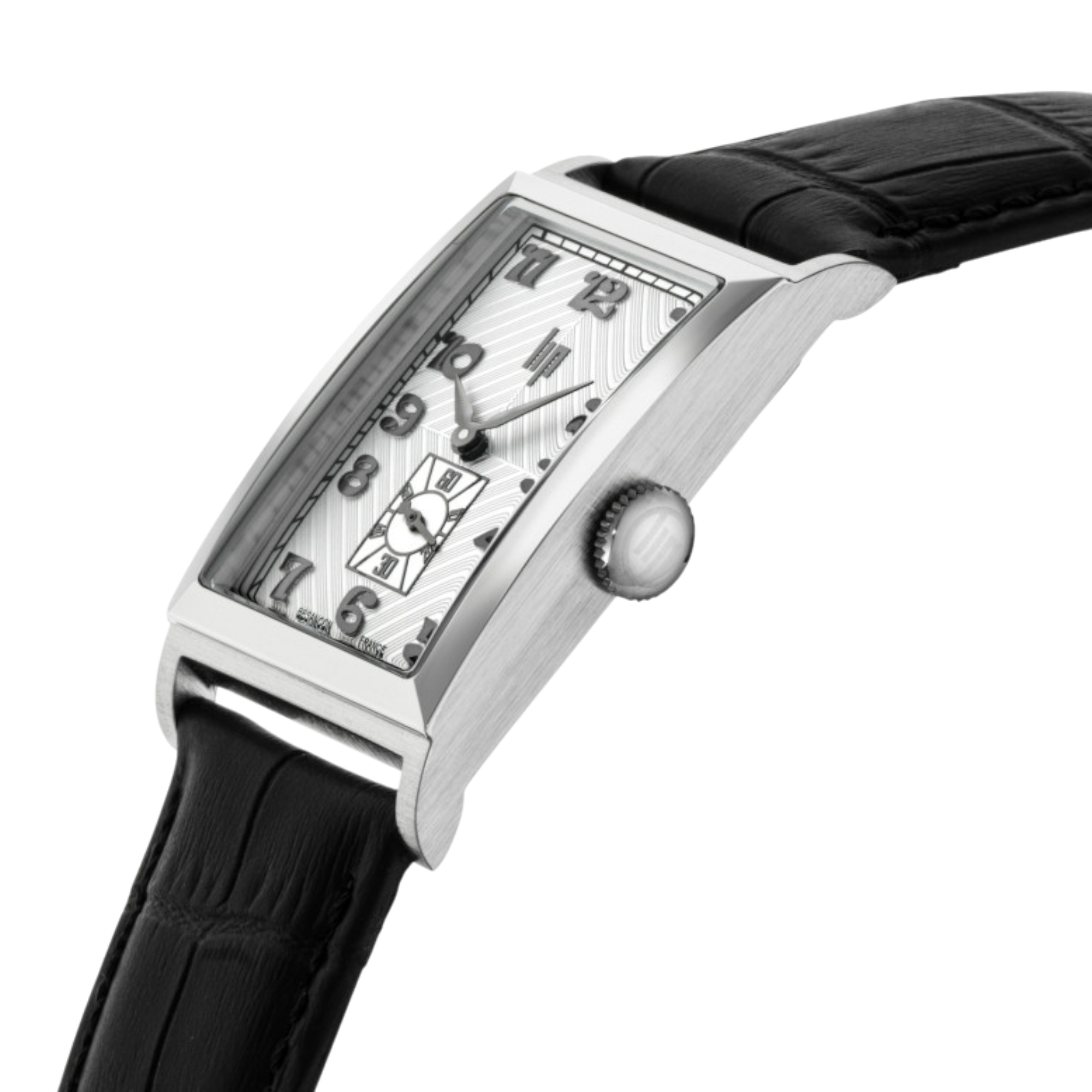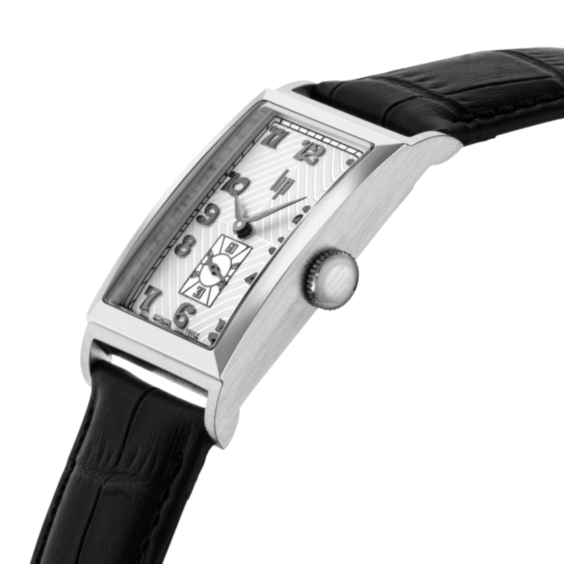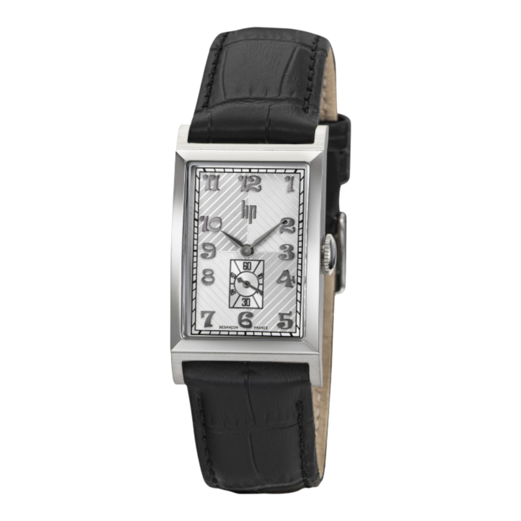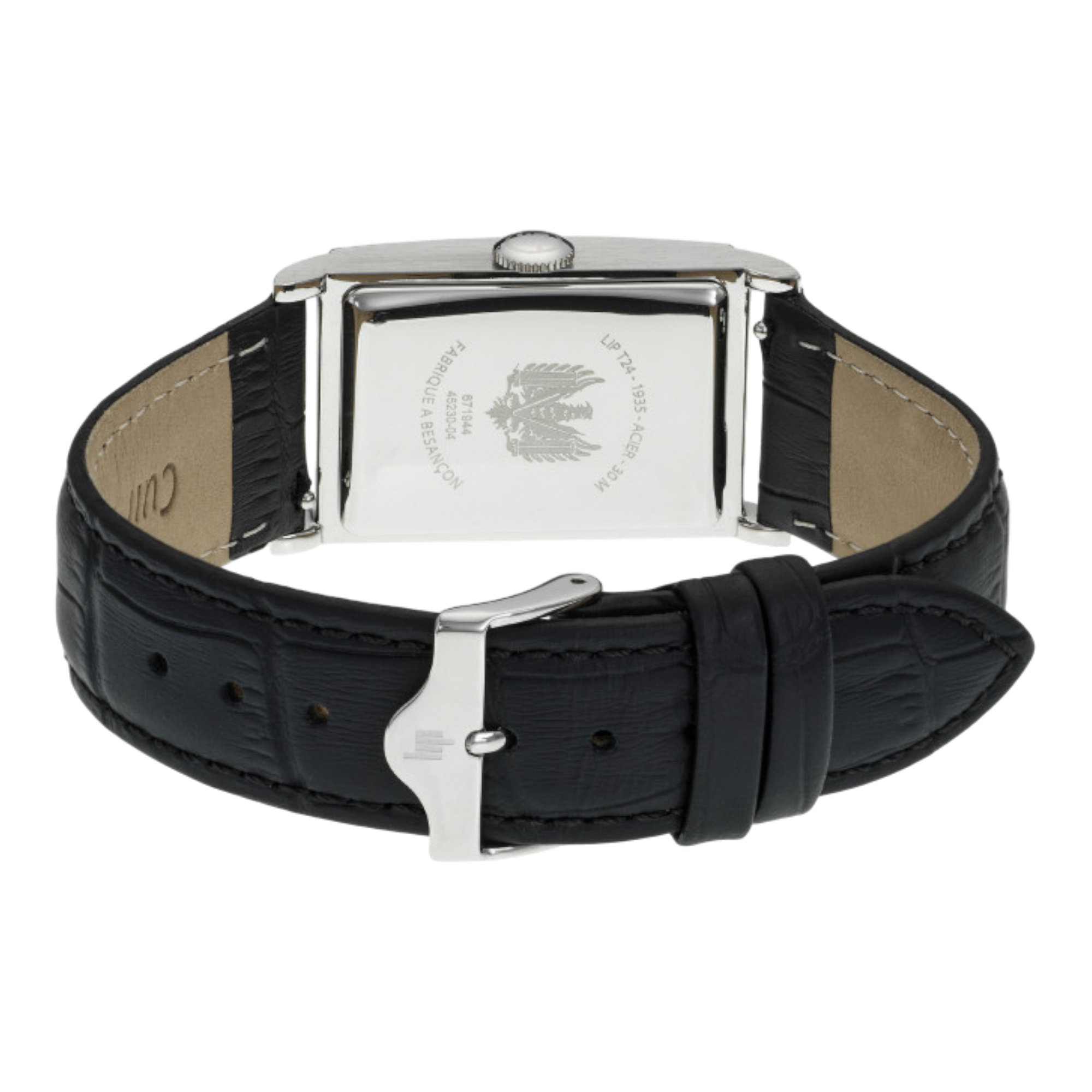 LIP Churchill T24 – Fabriquée en France (Besançon)L’héritage Art déco de la montre des grands hommes. Symbole d’excellence et de savoir-faire français, la LIP Churchill T24 s’inspire directement de la mythique LIP T18, offerte à Winston Churchill à la fin de la Seconde Guerre mondiale. Ce modèle iconique rend hommage à l’élégance intemporelle du design Art déco, tout en affirmant une modernité discrète et raffinée. Conçue et assemblée à Besançon, berceau historique de l’horlogerie française, cette montre séduit par la pureté de ses lignes et la noblesse de ses finitions. Son boîtier rectangulaire en acier inoxydable 316L poli et brossé (41,5 x 23,5 mm) incarne l’équilibre parfait entre tradition et sophistication. Un cadran d’une symétrie raffinéeLe cadran blanc argenté de la LIP T24 affiche des motifs géométriques délicats, signature du style Art déco. Les chiffres arabes appliqués et les aiguilles noires offrent une lisibilité parfaite, tandis que le compteur petite seconde à 6 h, orné d’un motif soleillé, apporte une touche de relief subtile. Un confort raffiné au poignetCette montre mixte, pensée pour les amateurs de style authentique, s’accompagne d’un bracelet en cuir noir véritable embossé façon crocodile, avec surpiqûres ton sur ton et boucle ardillon siglée LIP. Sa texture mate et son ergonomie en font un compagnon aussi confortable que distingué. Un hommage au patrimoine horloger françaisDétail emblématique : le fond de boîte gravé de l’armoirie de la ville de Besançon rappelle l’origine et la fierté d’une fabrication 100 % française. Plus qu’un simple garde-temps, la LIP Churchill T24 incarne l’histoire, la précision et le prestige d’une marque qui a marqué la légende horlogère mondiale. | |