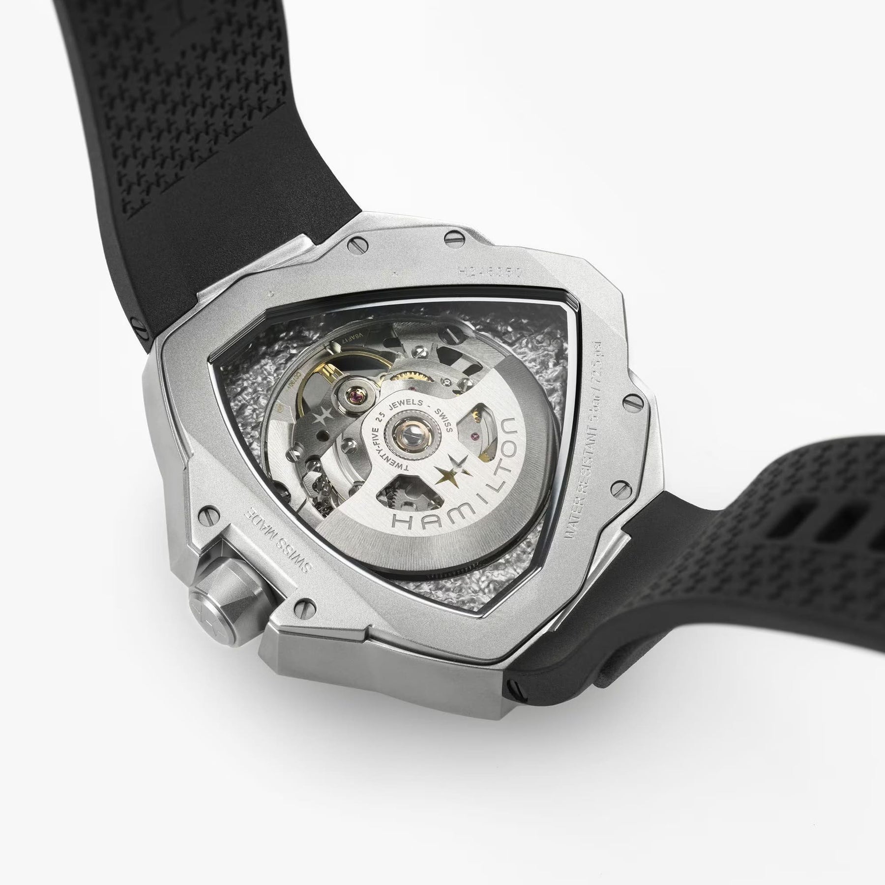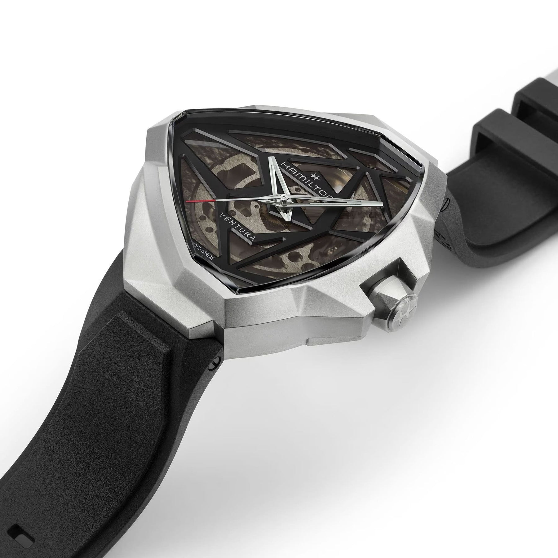 Hamilton Ventura Edge Skeleton – L’audace futuriste du design horlogerVéritable symbole d’avant-garde, la Hamilton Ventura Edge Skeleton revisite la légendaire silhouette triangulaire de la Ventura dans une interprétation architecturale et contemporaine. Son boîtier noir mat, aux lignes tendues et anguleuses, évoque une structure futuriste où chaque détail semble taillé dans l’ombre. Sous son cadran squeletté à dégradé fumé, la Ventura Edge Skeleton laisse entrevoir les rouages précis du mouvement automatique H-10-S, offrant jusqu’à 80 heures de réserve de marche. Alliance de technologie horlogère suisse et de design sculptural, la Hamilton Ventura Edge Skeleton s’adresse aux amateurs de montres au caractère affirmé, à la frontière entre l’art et la mécanique. |