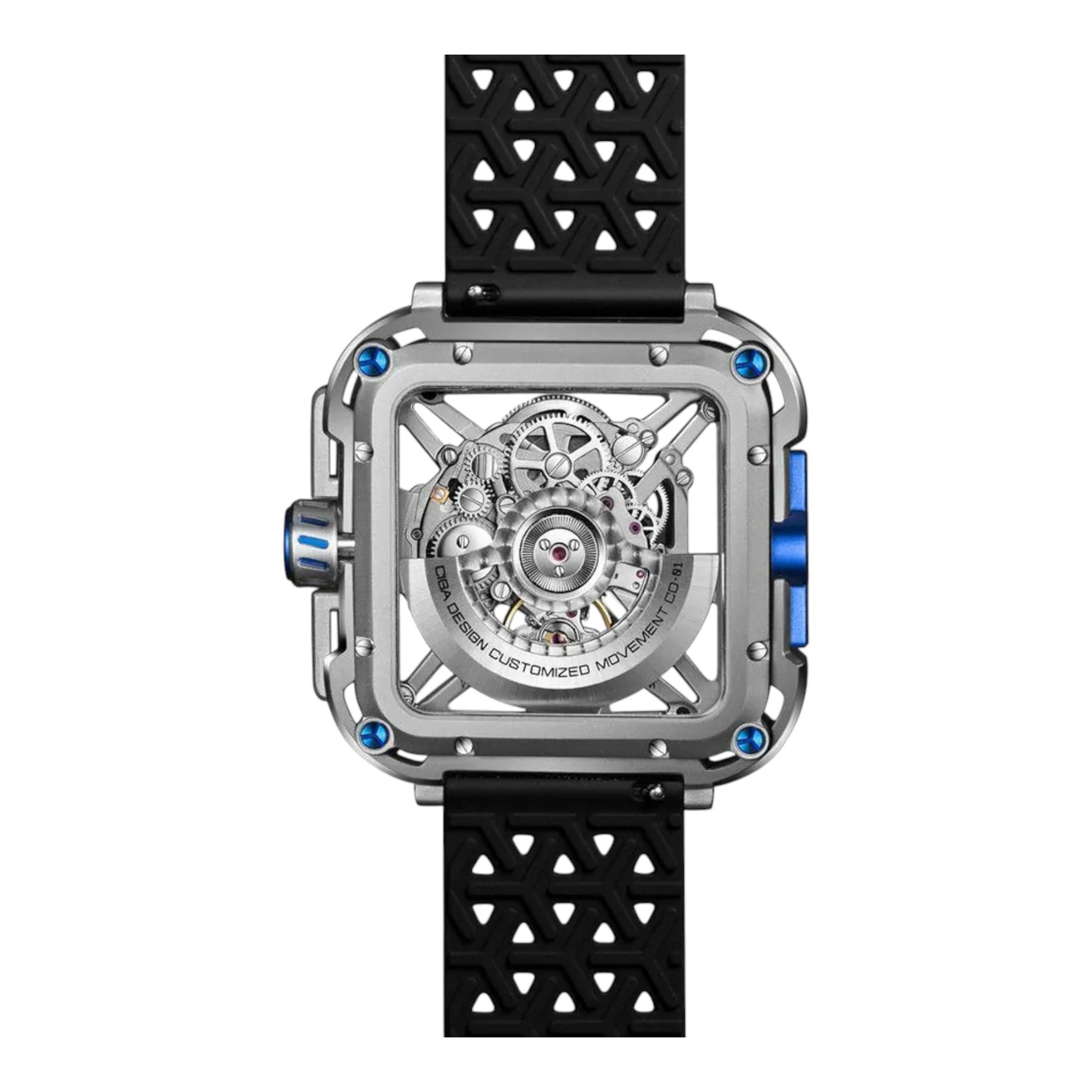 Ciga Design X-Series GorillaLa maison Ciga Design, pionnière de l’horlogerie chinoise moderne, s’impose depuis plusieurs années avec des montres squelettes innovantes et accessibles, plusieurs fois récompensées au GPHG et aux Red Dot Awards. Dans sa célèbre collection X-Series, la marque propose des garde-temps à l’esthétique audacieuse, jouant avec la transparence, les angles et les volumes. La Ciga Design Gorilla se distingue par son identité marquée et son design singulier, conçu pour ceux qui recherchent une montre automatique squelette originale et contemporaine. Un boîtier carré robuste et moderneCette montre arbore un boîtier carré à double couche en Titanium , mesurant 44 x 48 mm pour 11,7 mm d’épaisseur. De finition argentée, il est renforcé par des vis latérales qui accentuent son allure industrielle. Un cadran squelette spectaculaireAu centre de l’attention, le cadran adopte un design squelette ajouré, qui révèle la mécanique dans un jeu de transparence captivant. La lecture des heures est déplacée sur la lunette interne, accentuant la pureté visuelle du mécanisme.