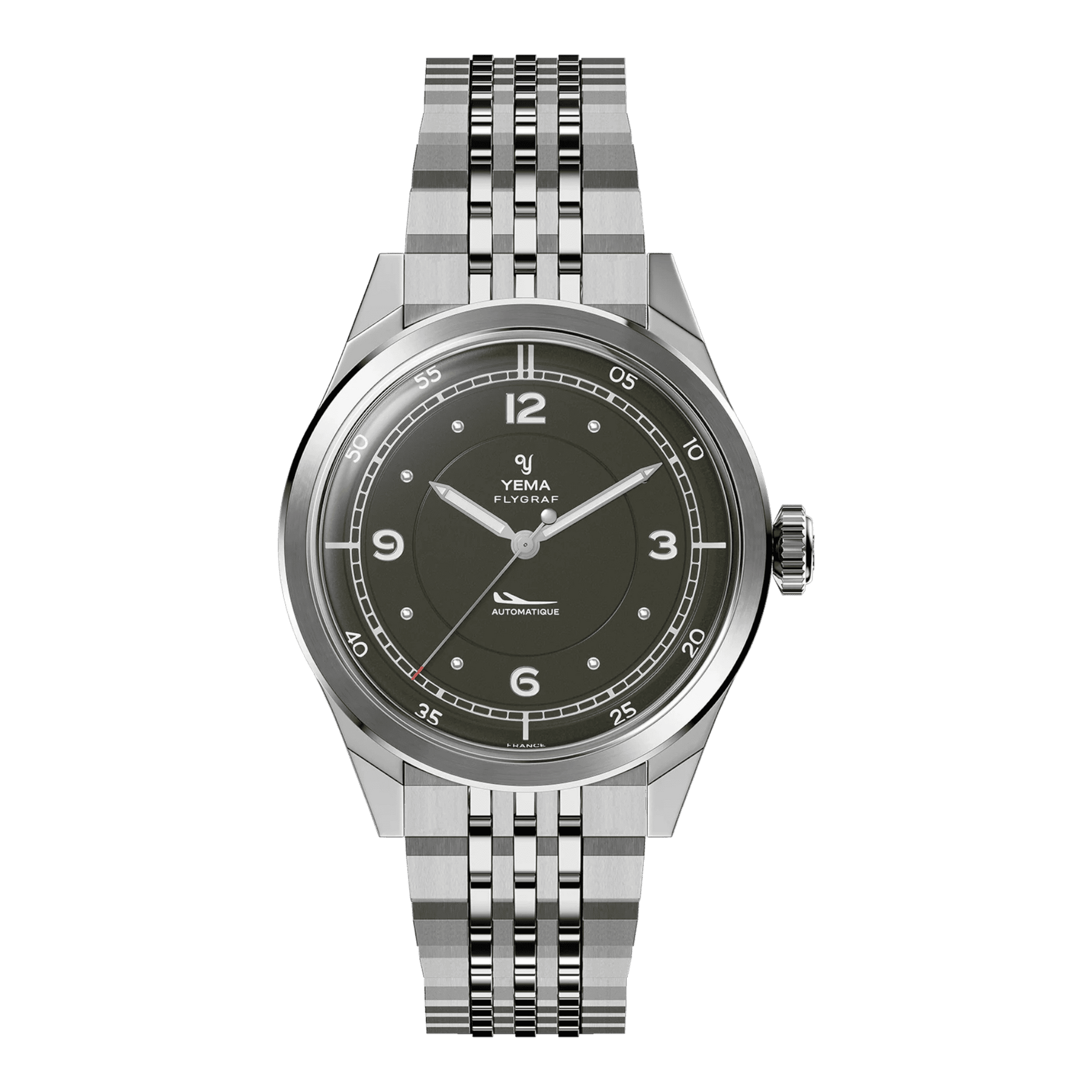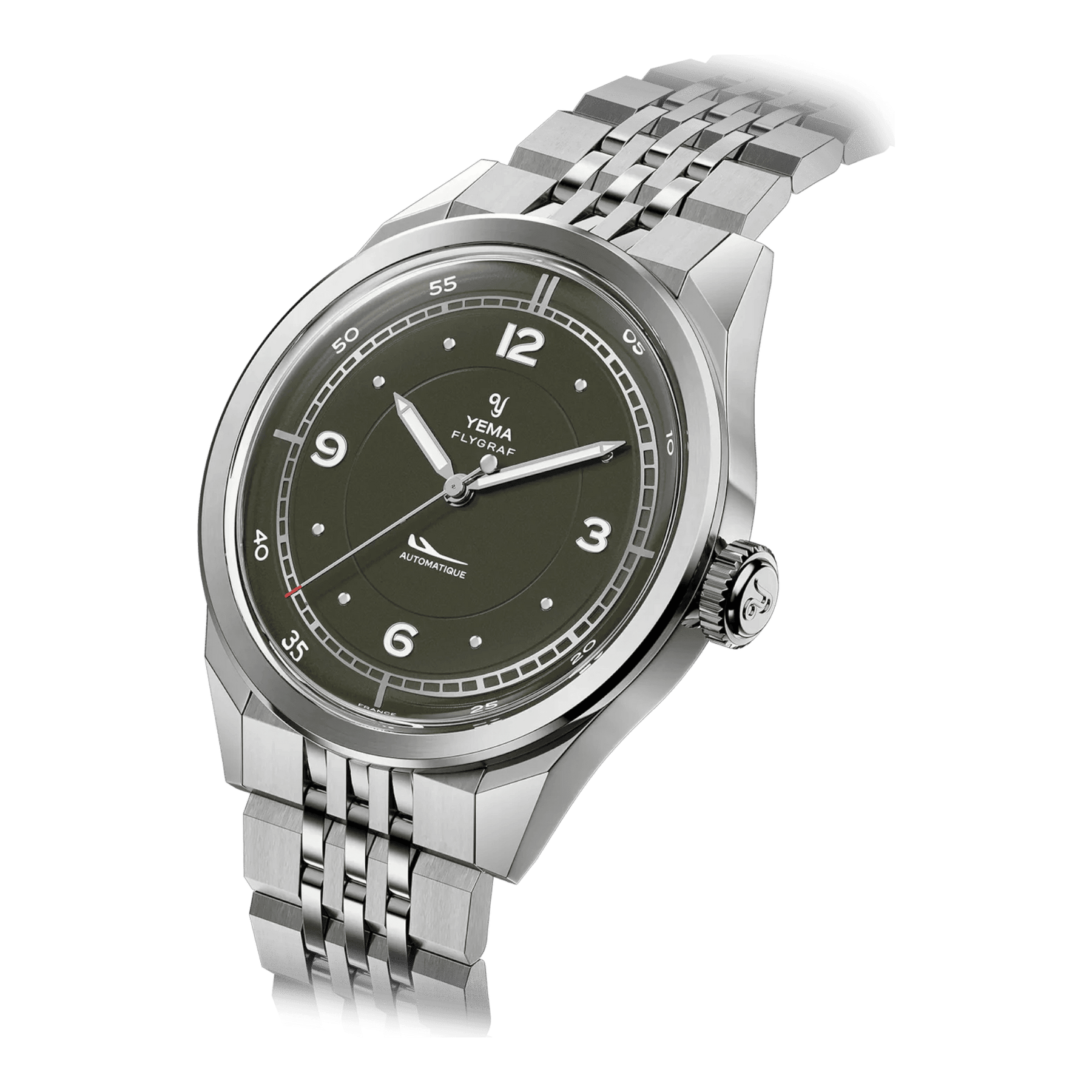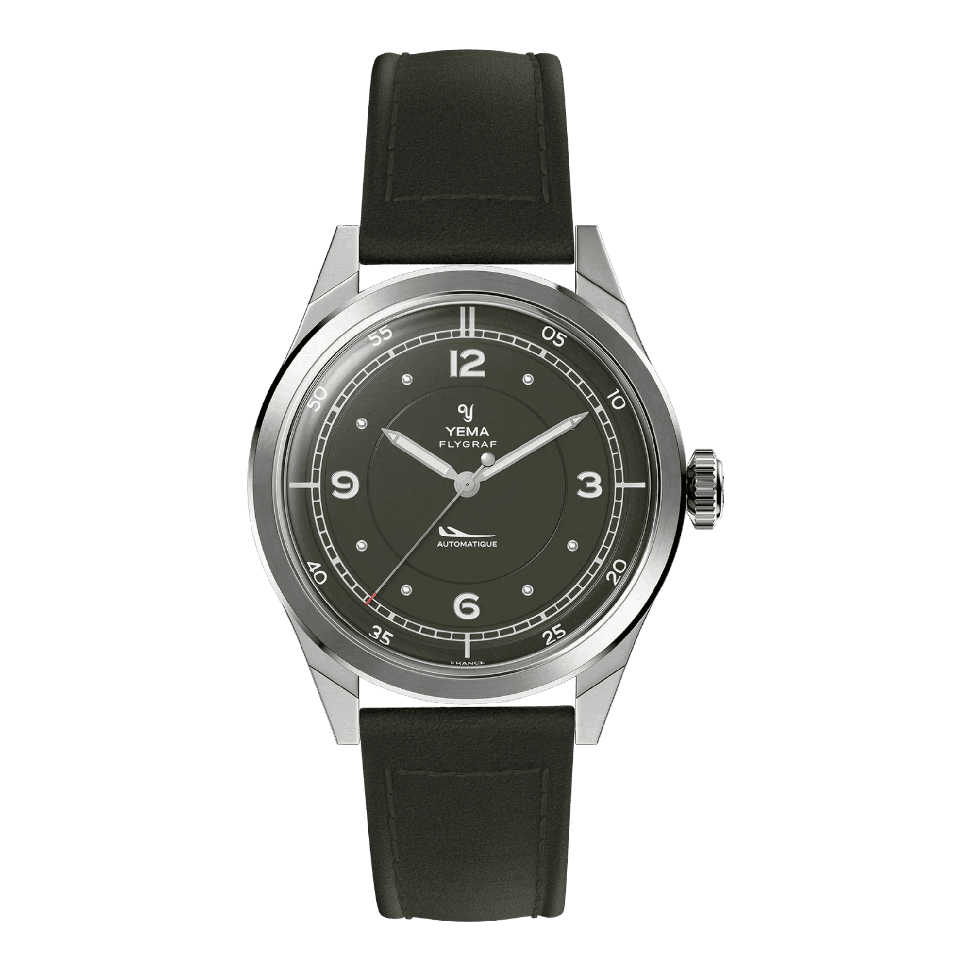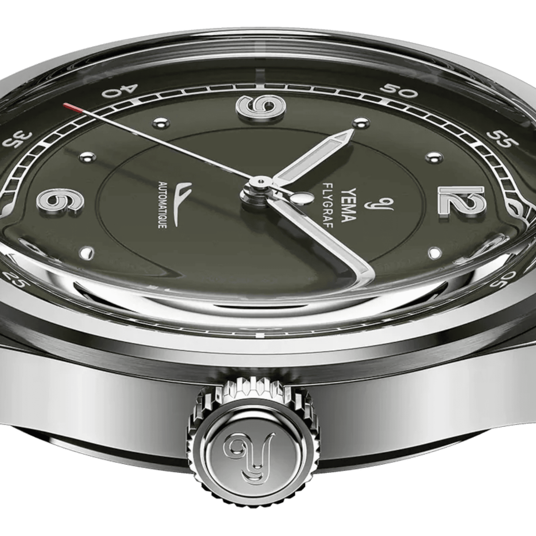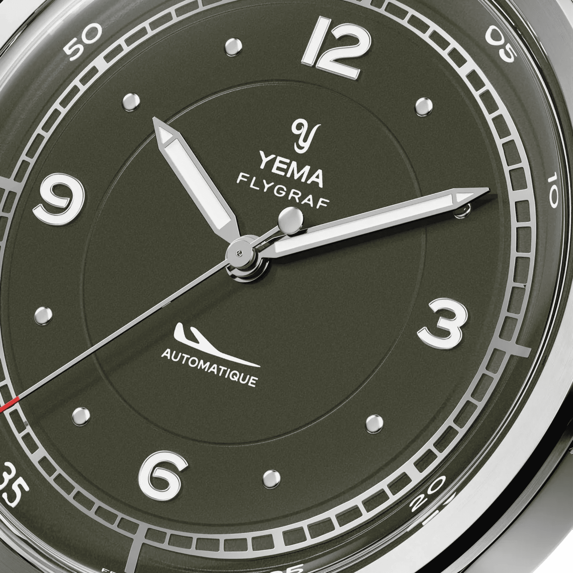 YEMA Flygraf Pilot – L’élégance néo-vintage de l’aviationL’esprit des montres de pilote revisitéInspirée des instruments d’aviation des années 1930-1940, la YEMA Flygraf Pilot rend hommage aux montres de pilote classiques tout en adoptant une approche néo-vintage contemporaine. Disponible en deux coloris de cadran, la Flygraf Pilot incarne l’équilibre parfait entre fonctionnalité militaire et raffinement horloger. Cadran sectoriel à inspiration militaireLe cadran de secteur, caractéristique de la Flygraf Pilot, reprend la disposition concentrique typique des montres d’aviation d’époque. Les aiguilles et marqueurs horaires sont revêtus de Super-LumiNova BGW9 Grade A, offrant une luminosité bleu glacé exceptionnelle dans l’obscurité. Boîtier acier 38,5 mm – Finesse et équilibreLe boîtier en acier inoxydable 316L de 38,5 mm adopte un design à la fois robuste et raffiné. La lunette à profil en couches, les côtés arrondis et l’alternance de finitions polies et brossées créent un jeu de lumière subtil qui met en valeur la pureté du design. Fond gravé emblématiqueLe fond de boîte vissé dévoile la crête historique YEMA, minutieusement estampée à l’aide d’une presse hydraulique haute pression. Mouvement automatique Sellita SW200-1Au cœur de la Flygraf Pilot bat le calibre Sellita SW200-1, un mouvement suisse reconnu pour sa fiabilité et sa précision.