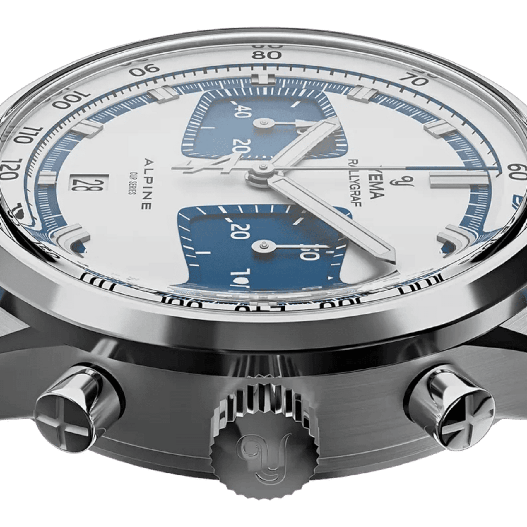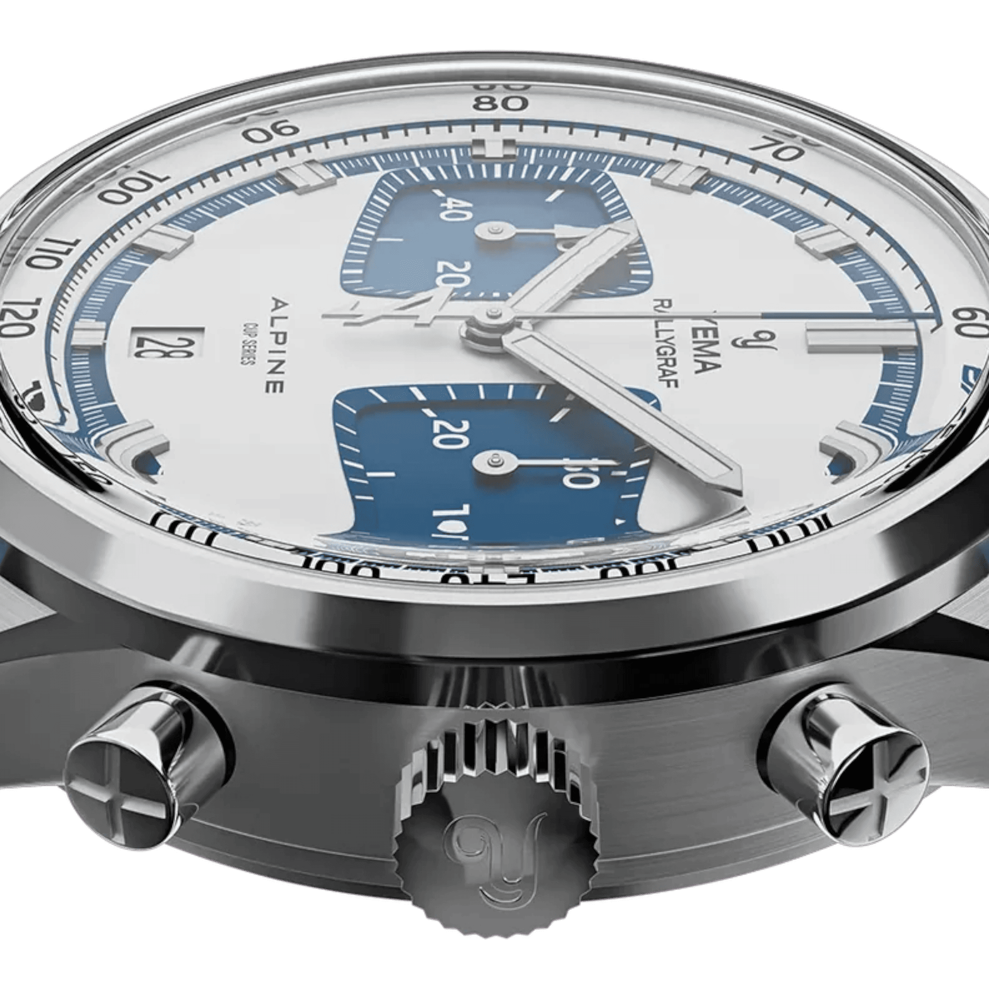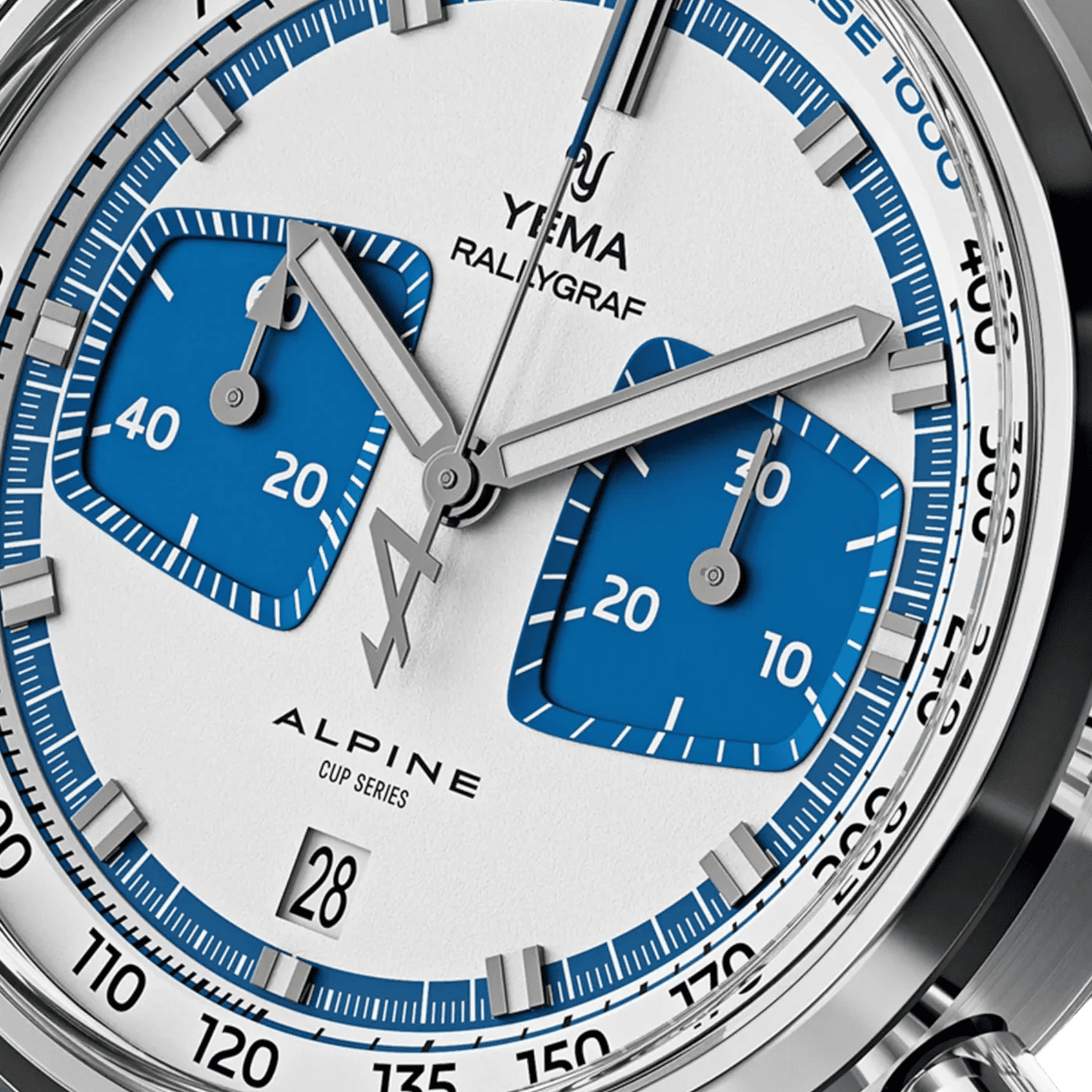 Son cadran bicompax reprend l’esthétique emblématique des tableaux de bord Alpine d’époque. Les sous-compteurs du chronographe, équilibrés par la date à 6 h et le logo Alpine Cup Series à 12 h, forment une composition harmonieuse.