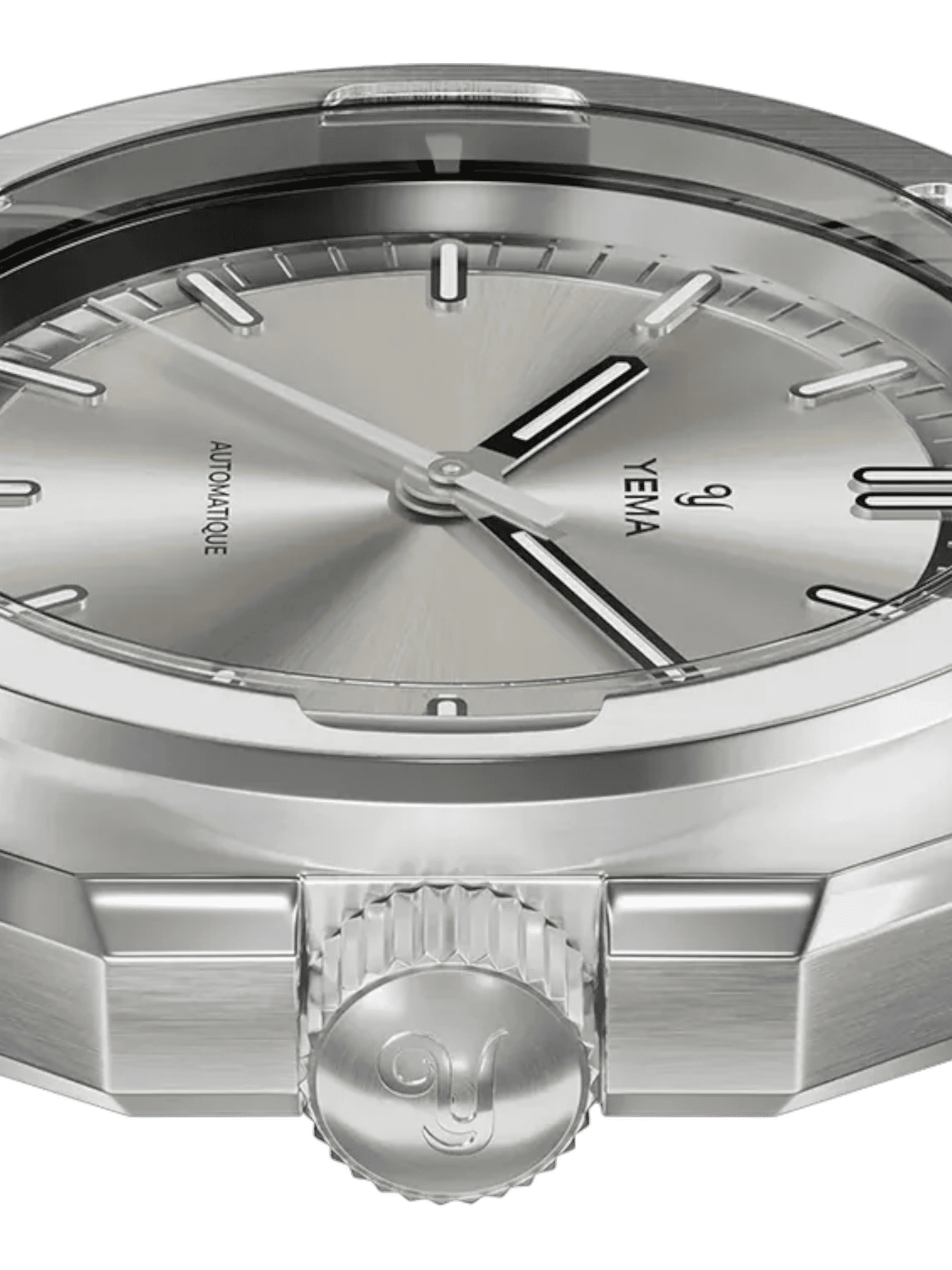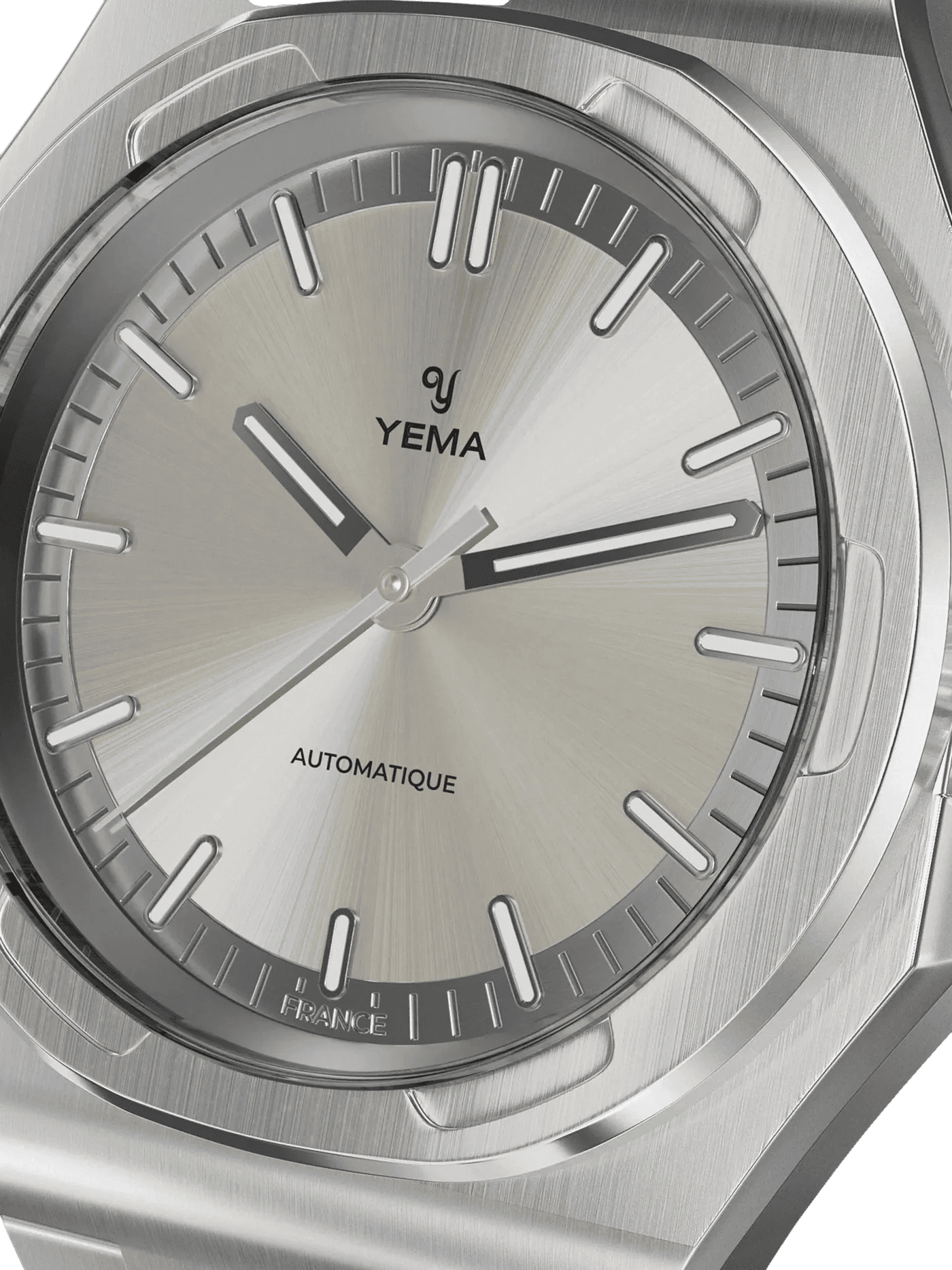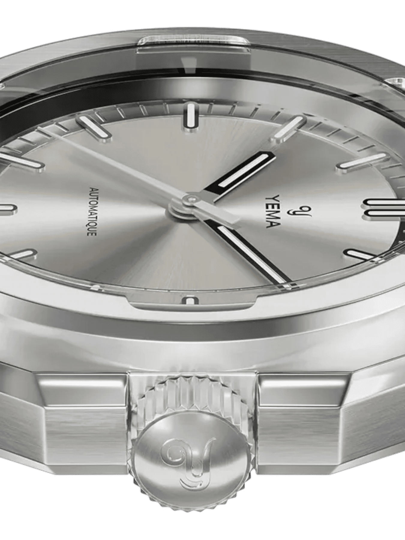 Au dos, le fond de boîte vissé dévoile le blason historique YEMA, minutieusement gravé à la presse hydraulique et entouré de finitions satinées circulaires — une signature qui témoigne du savoir-faire de la marque.