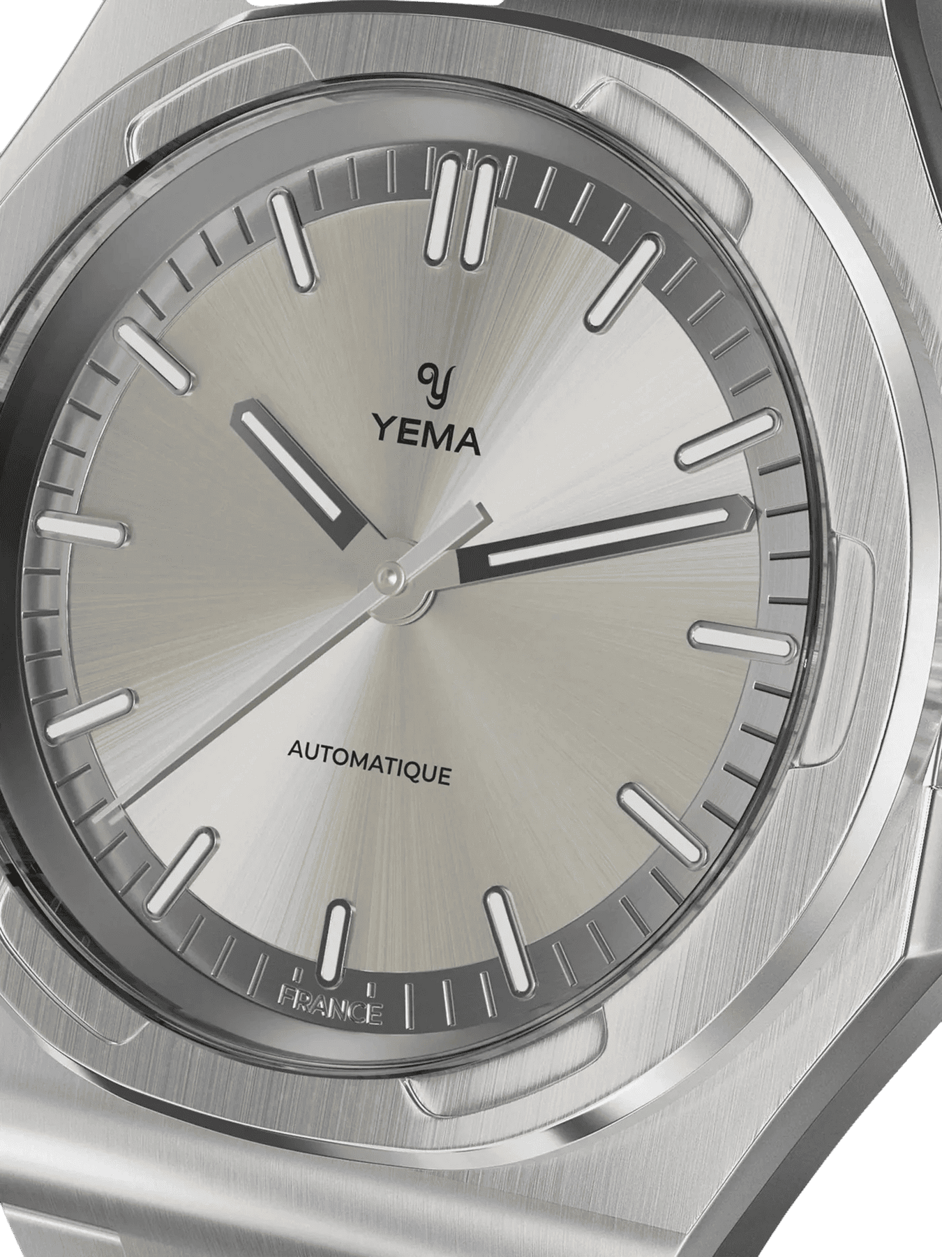 Inspirée d’un modèle YEMA Sous-Marine des années 1980, la lunette monobloc arbore trois finitions distinctes : brossage vertical sur les biseaux supérieurs et inférieurs, et surfaces polies pour un contraste saisissant.